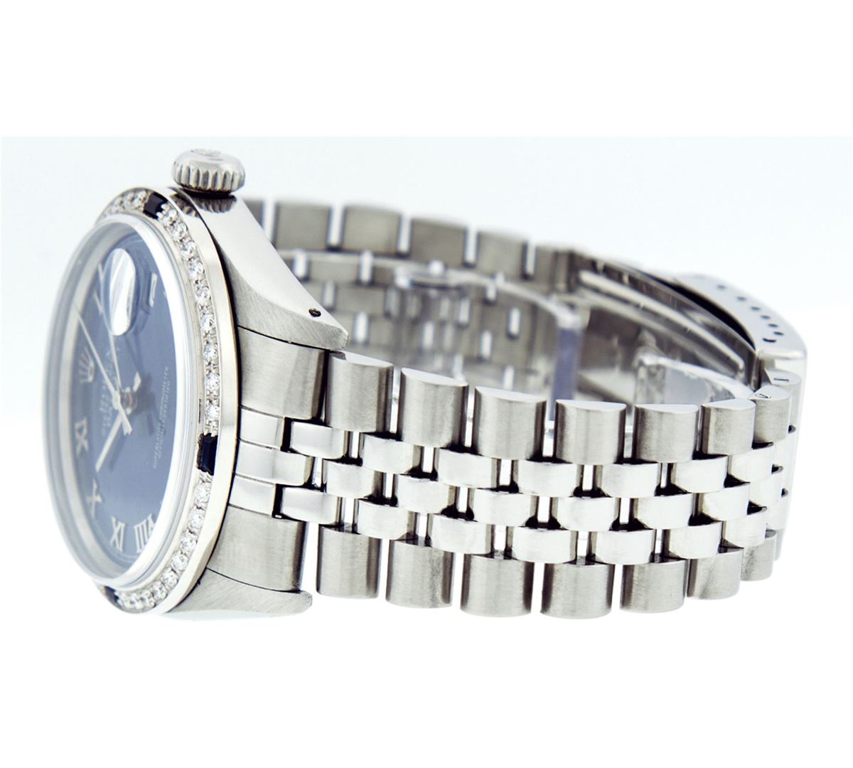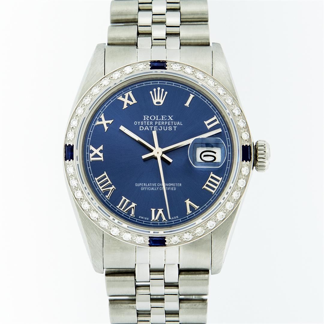 One Gents Rolex Datejust Polished, Serviced & Electronically Tested, Stainless Steel Case:36mm, Stainless Steel Crown, Custom Bezel: 18K White Gold Sapphire Beadset Diamond Bezel, Diamond + Gem Count: 36 Diamonds + 4 Sapphires Total Weight 1.00 Carat, Clarity: SI-VS, Color: G to H. Custom Crystal: Synthetic Sapphire Cyclops Lens. Movement: Automatic Winding Movement Caliber 3035. Custom Dial: Blue With Roman Hour Markers & Square Track. Date Window: 3 O'Clock Position Date Display, Quickset, Model: Datejust, Condition: G-6 Extra Fine. Bracelet: Stainless Steel Jubilee. Bright Polish & Satin Finish. 7.0 Inch Length, Adjustable. Standard Clasp, With Rolex Logo. Comes with a 6 month warranty card.