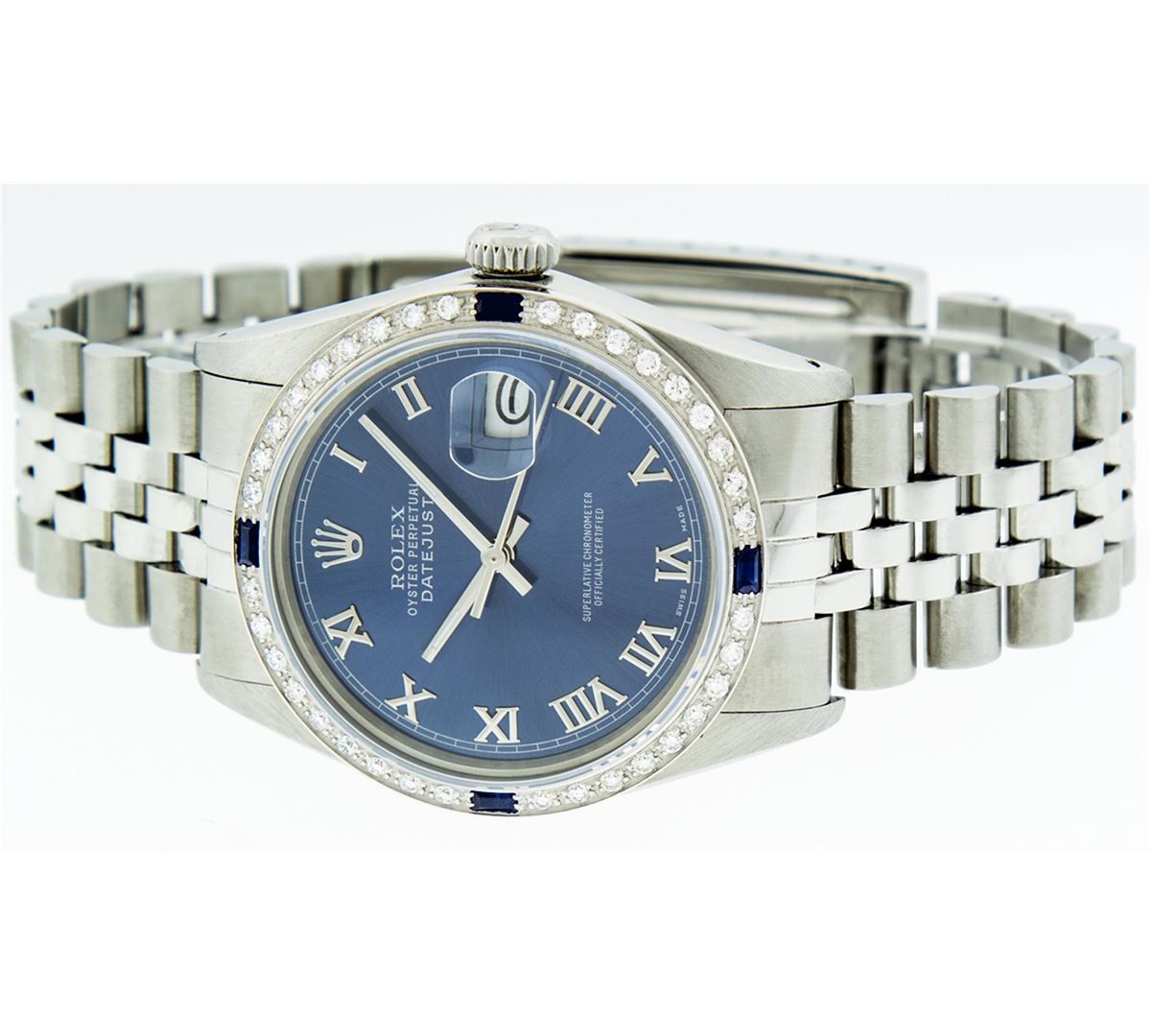 One Gents Rolex Datejust Polished, Serviced & Electronically Tested, Stainless Steel Case:36mm, Stainless Steel Crown, Custom Bezel: 18K White Gold Sapphire Beadset Diamond Bezel, Diamond + Gem Count: 36 Diamonds + 4 Sapphires Total Weight 1.00 Carat, Clarity: SI-VS, Color: G to H. Custom Crystal: Synthetic Sapphire Cyclops Lens. Movement: Automatic Winding Movement Caliber 3035. Custom Dial: Blue With Roman Hour Markers & Square Track. Date Window: 3 O'Clock Position Date Display, Quickset, Model: Datejust, Condition: G-6 Extra Fine. Bracelet: Stainless Steel Jubilee. Bright Polish & Satin Finish. 7.0 Inch Length, Adjustable. Standard Clasp, With Rolex Logo. Comes with a 6 month warranty card.