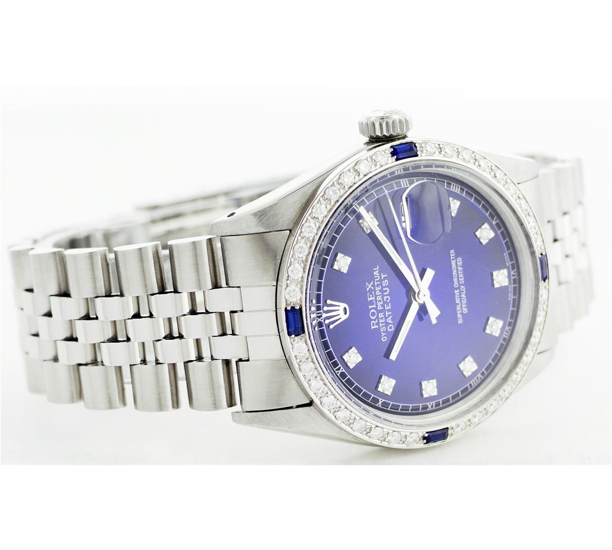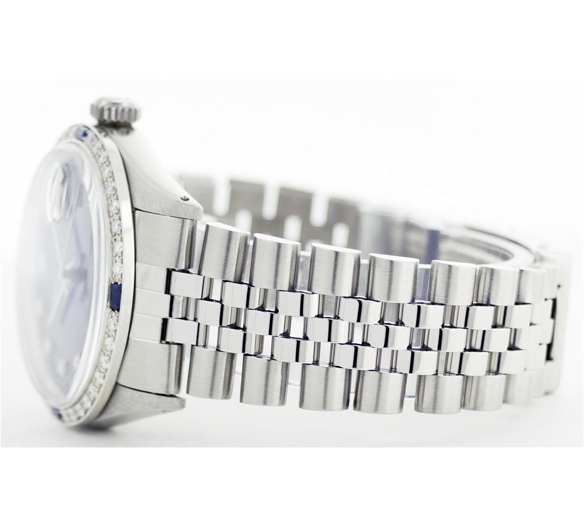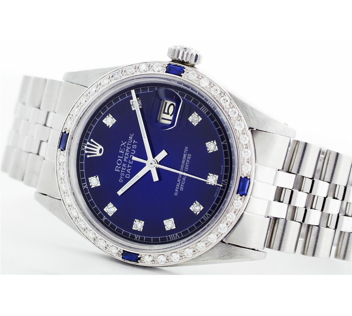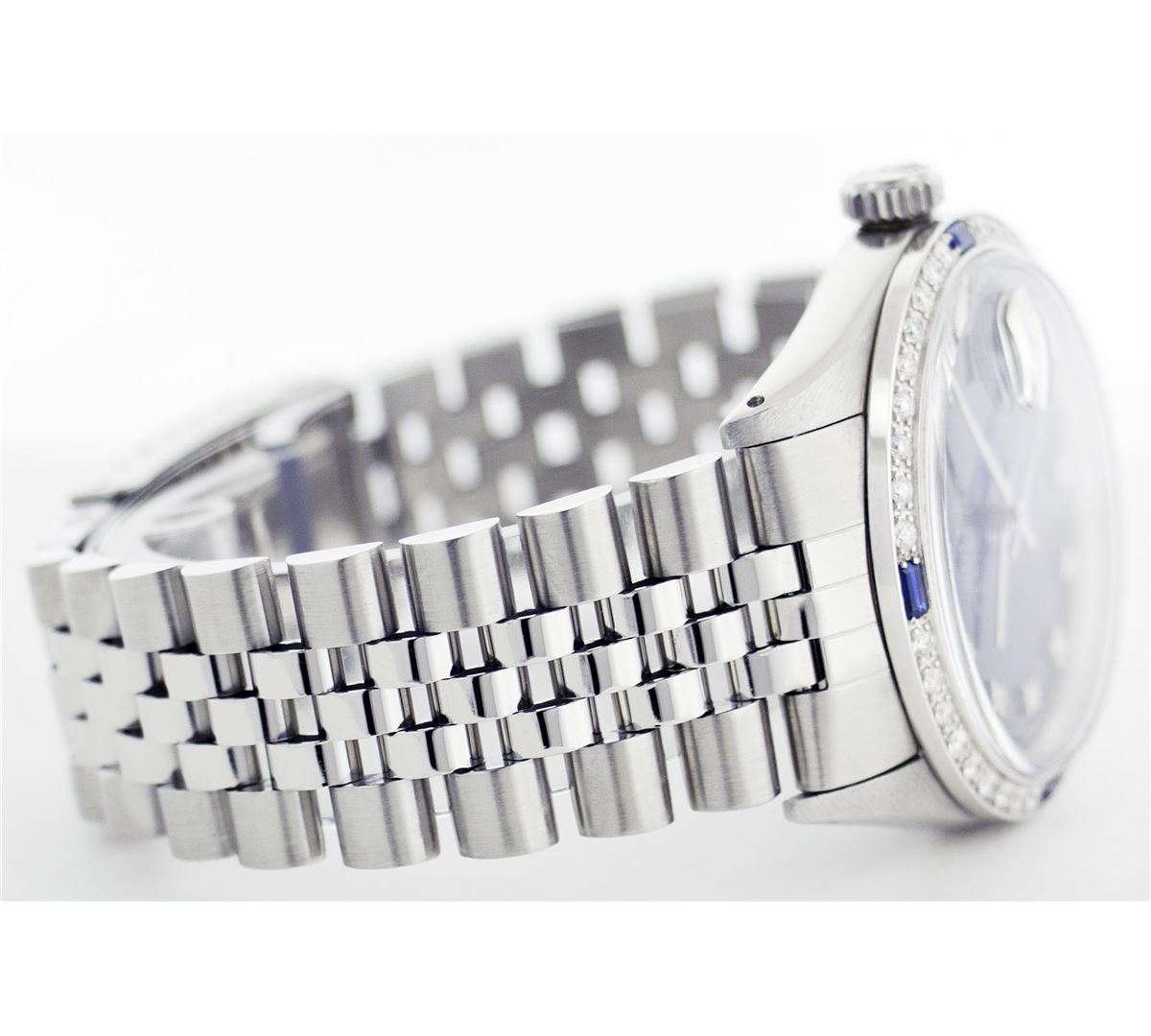 One Gents Rolex Datejust Polished, Serviced & Electronically Tested, Stainless Steel Case:36mm, Stainless Steel Crown, Custom Bezel: 18K White Gold Sapphire Beadset Diamond Bezel, Diamond + Gem Count: 36 Diamonds + 4 Sapphires Total Weight 1.00 Carat, Clarity: SI-VS, Color: G to H. Custom Crystal: Synthetic Sapphire Cyclops Lens. Movement: Automatic Winding Movement Caliber 3035. Custom Dial: Blue Vignette With Diamond Hour Markers, Diamond Count: 10 Diamonds In Dial, Clarity: SI-VS, Color: G to H. Date Window: 3 O'Clock Position Date Display, Quickset, Model: 16014 Condition: G-6 Extra Fine. Bracelet: Stainless Steel Jubilee. Bright Polish & Satin Finish. 6.5 Inch Length, Adjustable. Standard Clasp, With Rolex Logo.