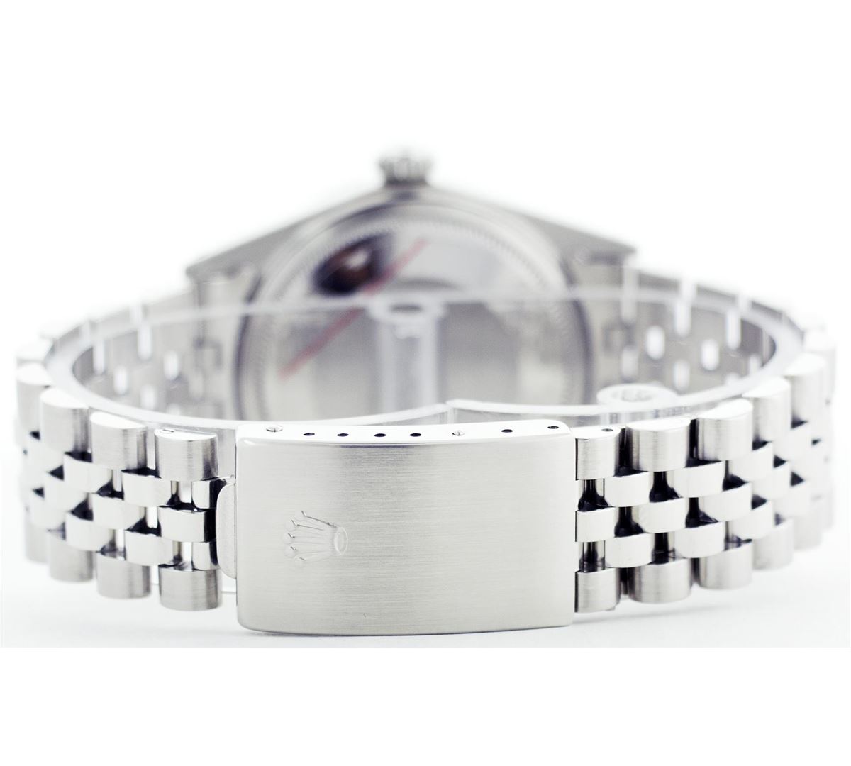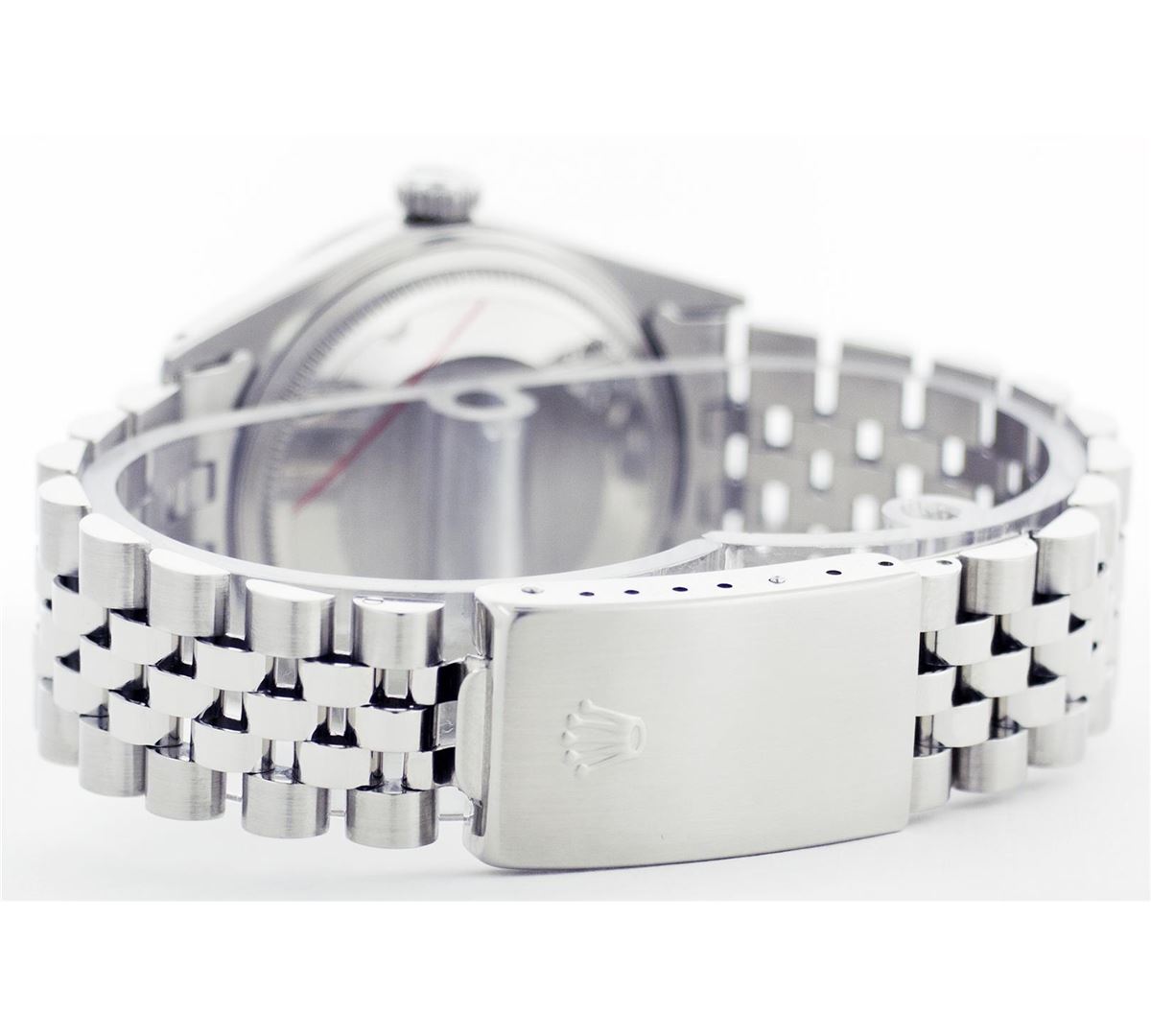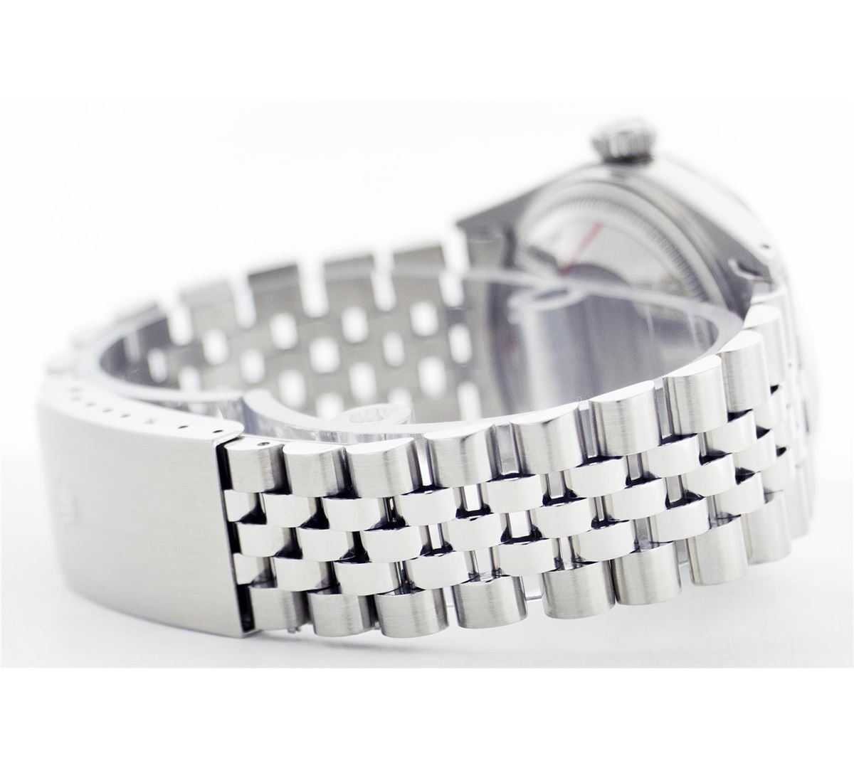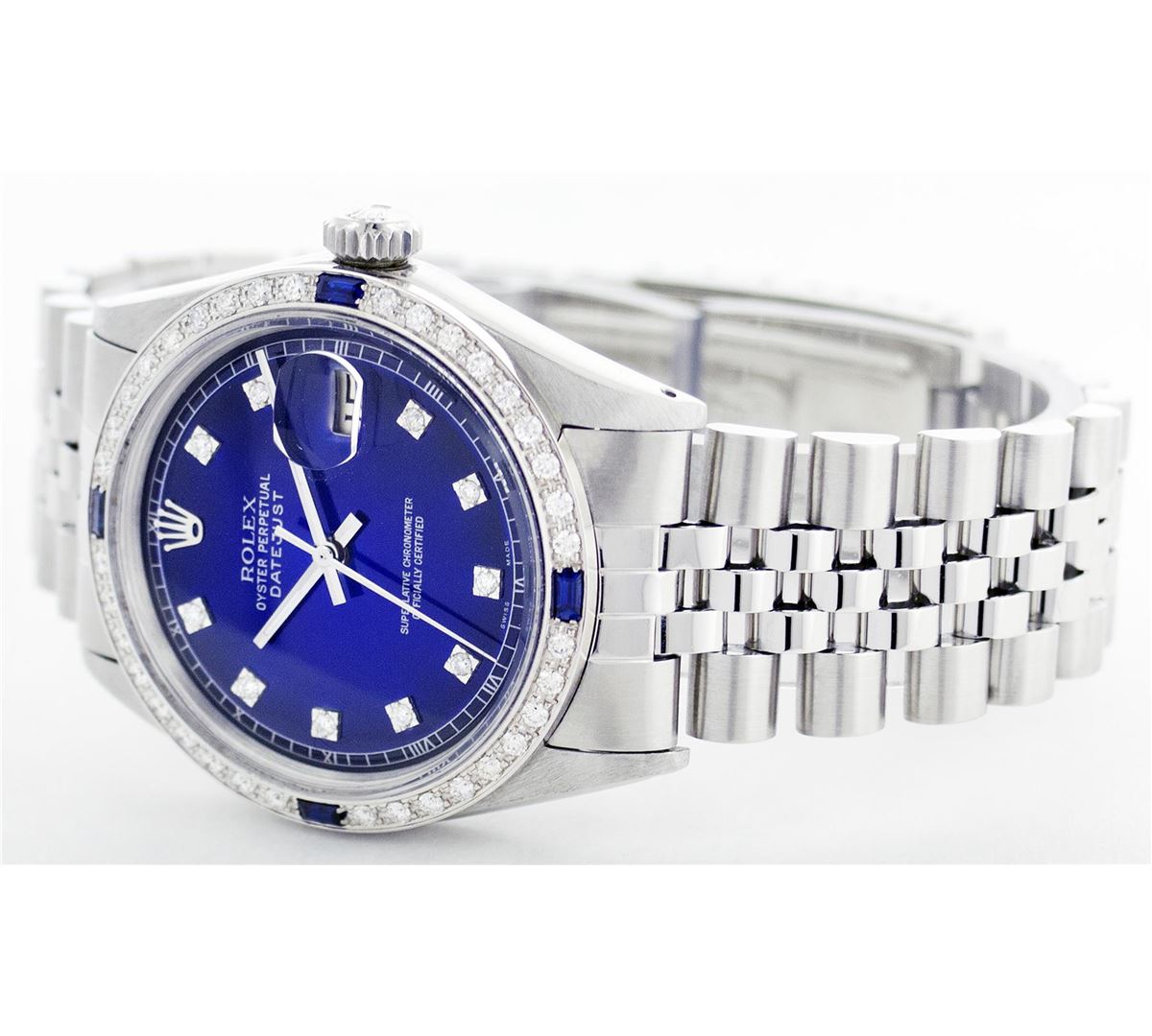 One Gents Rolex Datejust Polished, Serviced & Electronically Tested, Stainless Steel Case:36mm, Stainless Steel Crown, Custom Bezel: 18K White Gold Sapphire Beadset Diamond Bezel, Diamond + Gem Count: 36 Diamonds + 4 Sapphires Total Weight 1.00 Carat, Clarity: SI-VS, Color: G to H. Custom Crystal: Synthetic Sapphire Cyclops Lens. Movement: Automatic Winding Movement Caliber 3035. Custom Dial: Blue Vignette With Diamond Hour Markers, Diamond Count: 10 Diamonds In Dial, Clarity: SI-VS, Color: G to H. Date Window: 3 O'Clock Position Date Display, Quickset, Model: 16014 Condition: G-6 Extra Fine. Bracelet: Stainless Steel Jubilee. Bright Polish & Satin Finish. 6.5 Inch Length, Adjustable. Standard Clasp, With Rolex Logo.