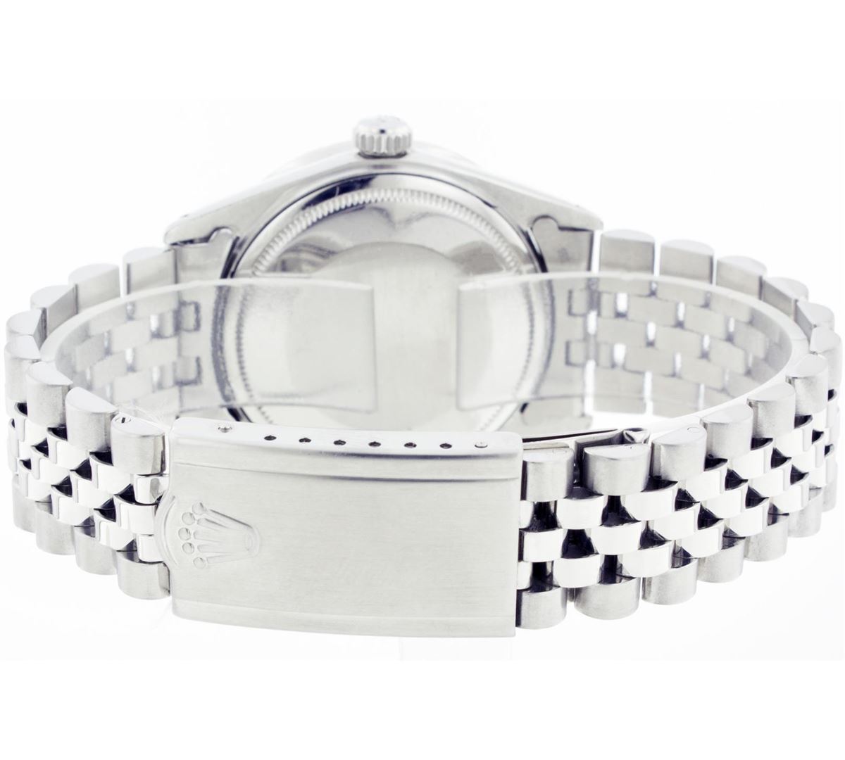 One Gents Rolex Datejust Polished, Serviced & Electronically Tested, Stainless Steel Case:36mm, Stainless Steel Crown, Custom Bezel: Stainless Steel Sapphire Beadset Diamond Bezel, Diamond + Gem Count: 36 Diamonds + 4 Sapphires Total Weight 1.00 Carat, Clarity: SI-VS, Color: G to H. Custom Crystal: Synthetic Sapphire Cyclops Lens. Movement: Automatic Winding Movement Caliber 1570. Custom Dial: Blue With Diamond Hour Markers, Diamond Count: 10 Diamonds In Dial, Clarity: SI-VS, Color: G to H. Date Window: 3 O'Clock Position Date Display, Nonquick, Model: 1601 Condition: G-6 Extra Fine. Bracelet: Stainless Steel Jubilee. Bright Polish & Satin Finish. 6.5 Inch Length, Adjustable. Standard Clasp, With Rolex Logo.
