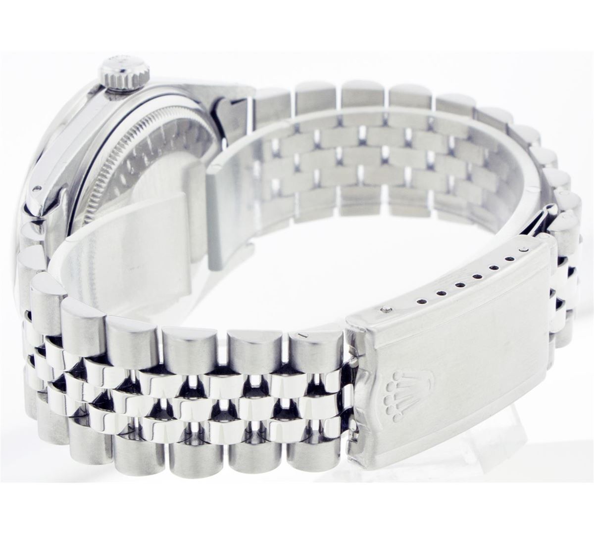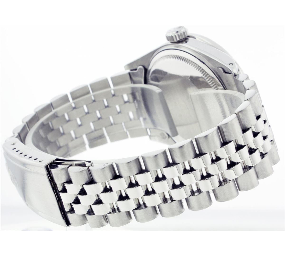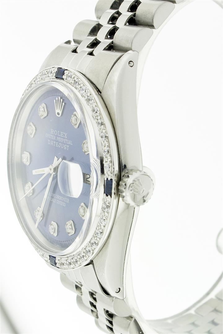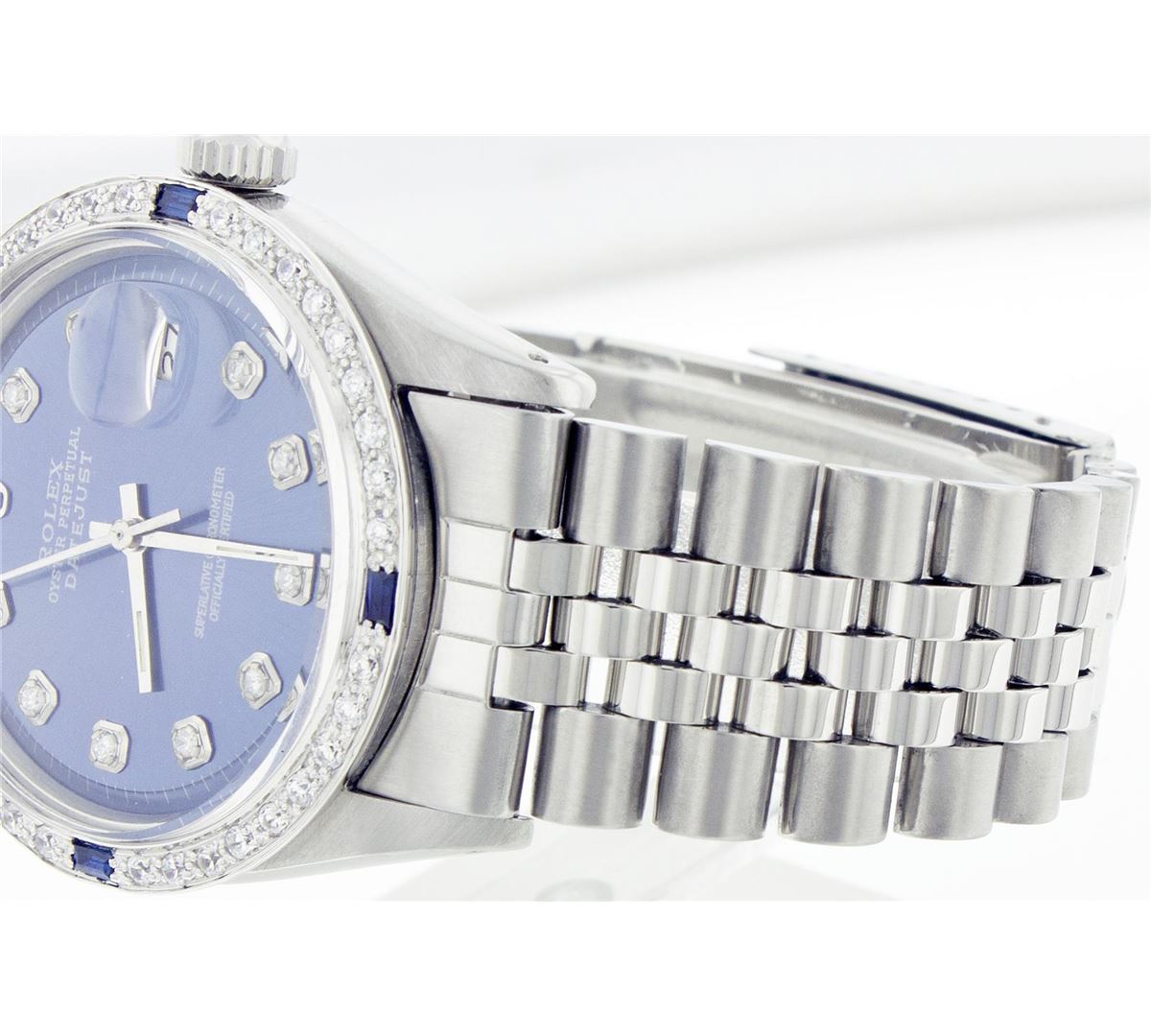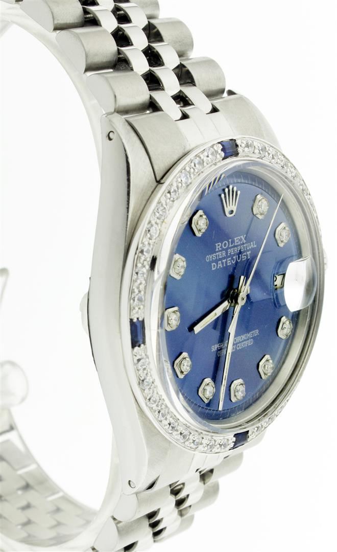 One Gents Rolex Datejust Polished, Serviced & Electronically Tested, Stainless Steel Case:36mm, Stainless Steel Crown, Custom Bezel: White Gold Sapphire Beadset Diamond Bezel, Diamond + Gem Count: 36 Diamonds + 4 Sapphires Total Weight 1.00 Carat, Clarity: SI-VS, Color: G to H. Custom Crystal: Synthetic Sapphire Cyclops Lens. Movement: Automatic Winding Movement Caliber 1570. Custom Dial: Blue With Diamond Hour Markers, Diamond Count: 10 Diamonds In Dial, Clarity: SI-VS, Color: G to H. Date Window: 3 O'Clock Position Date Display, Quickset, Model: 16014 Condition: G-6 Extra Fine. Bracelet: Stainless Steel Jubilee. Bright Polish & Satin Finish. 6.5 Inch Length, Adjustable. Standard Clasp, With Rolex Logo.