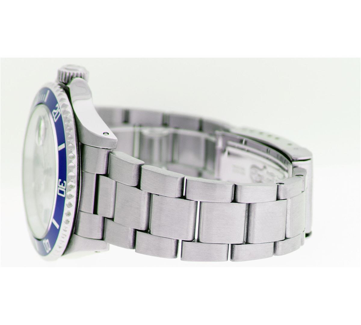 One Mens Rolex Submariner With Date Polished, Serviced & Electronically Tested, Stainless Steel Case:41mm, Stainless Steel Crown, Custom Bezel: Stainless Steel Rotatable Bezel With Blue Insert. Crystal: Synthetic Sapphire Cyclops Lens. Movement: Automatic Winding Movement Caliber 3135. Custom Dial: Silver Serti Diamond & Sapphire Dial, Diamond Count: 8 Diamonds + 2 Baguette Sapphires, Color: G To H, Clarity: SI-VS. Date Window: 3 O'Clock Position Date Display, Model: Submariner 16610, Quickset, Condition: G-6 Extra Fine. Bracelet: Stainless Steel Oyster. Bright Polish & Satin Finish. 7.0 Inch Length, Adjustable. Standard Clasp, With Rolex Logo. Comes with 6 month warranty.