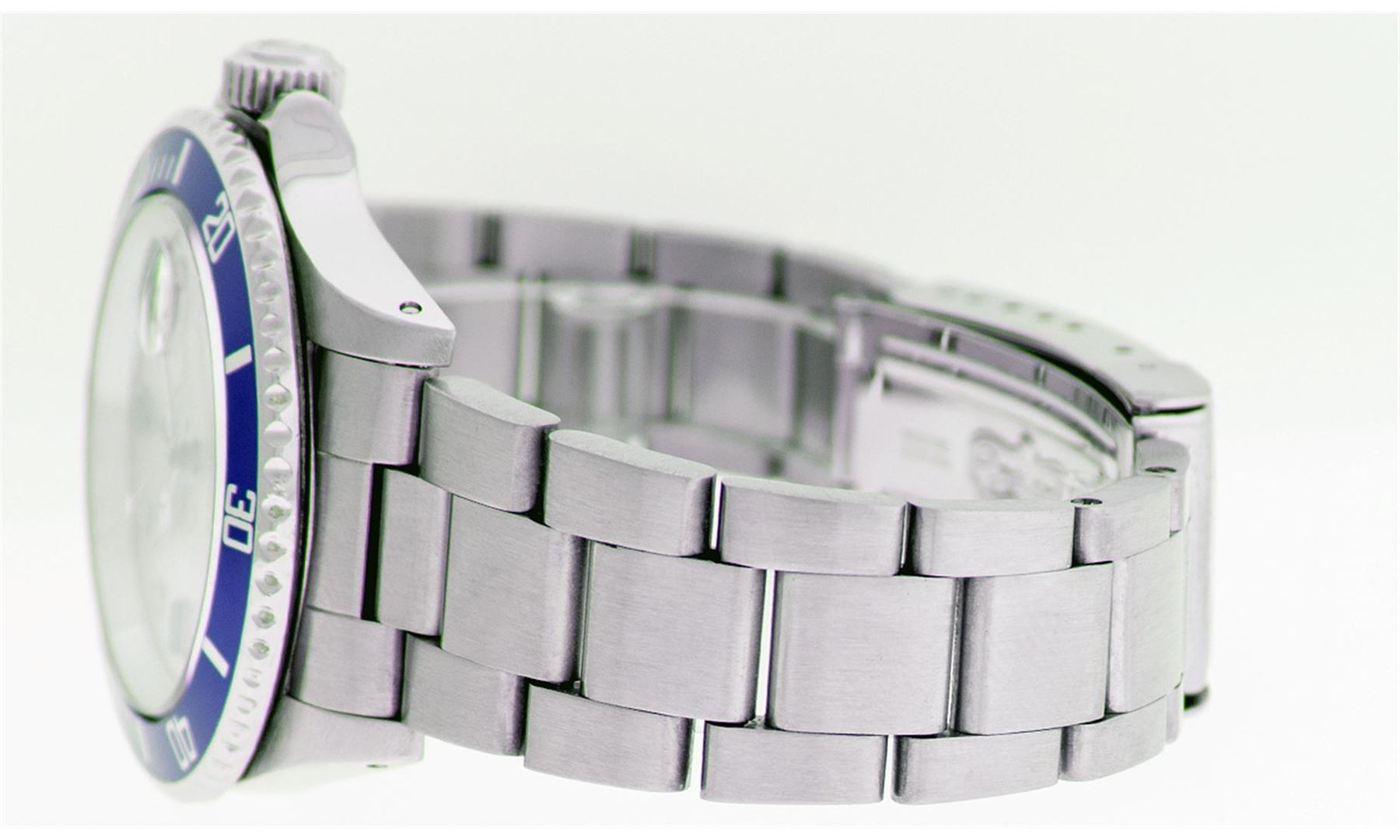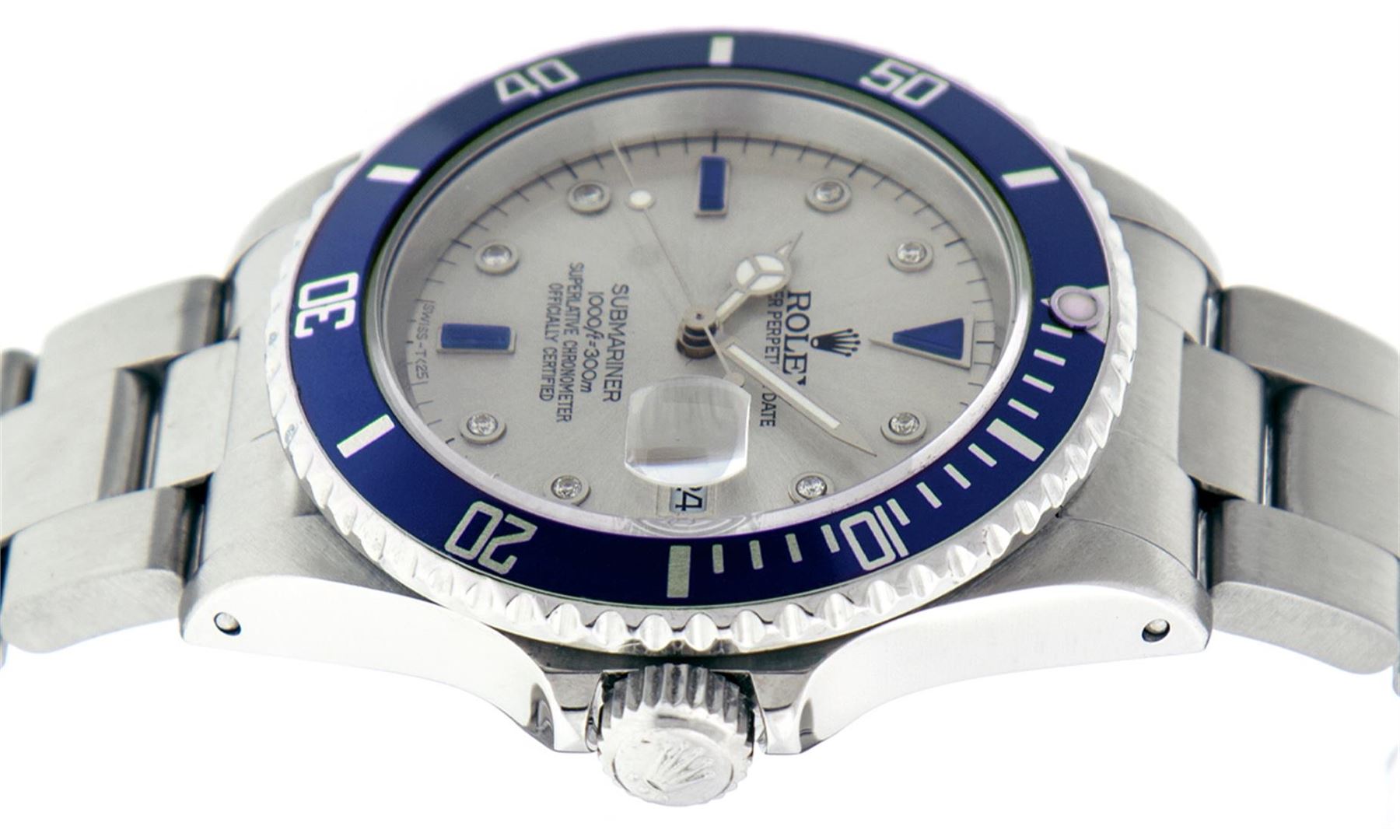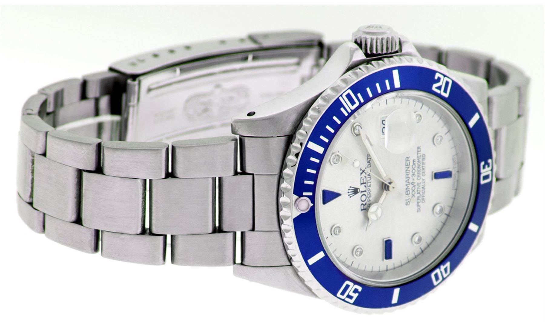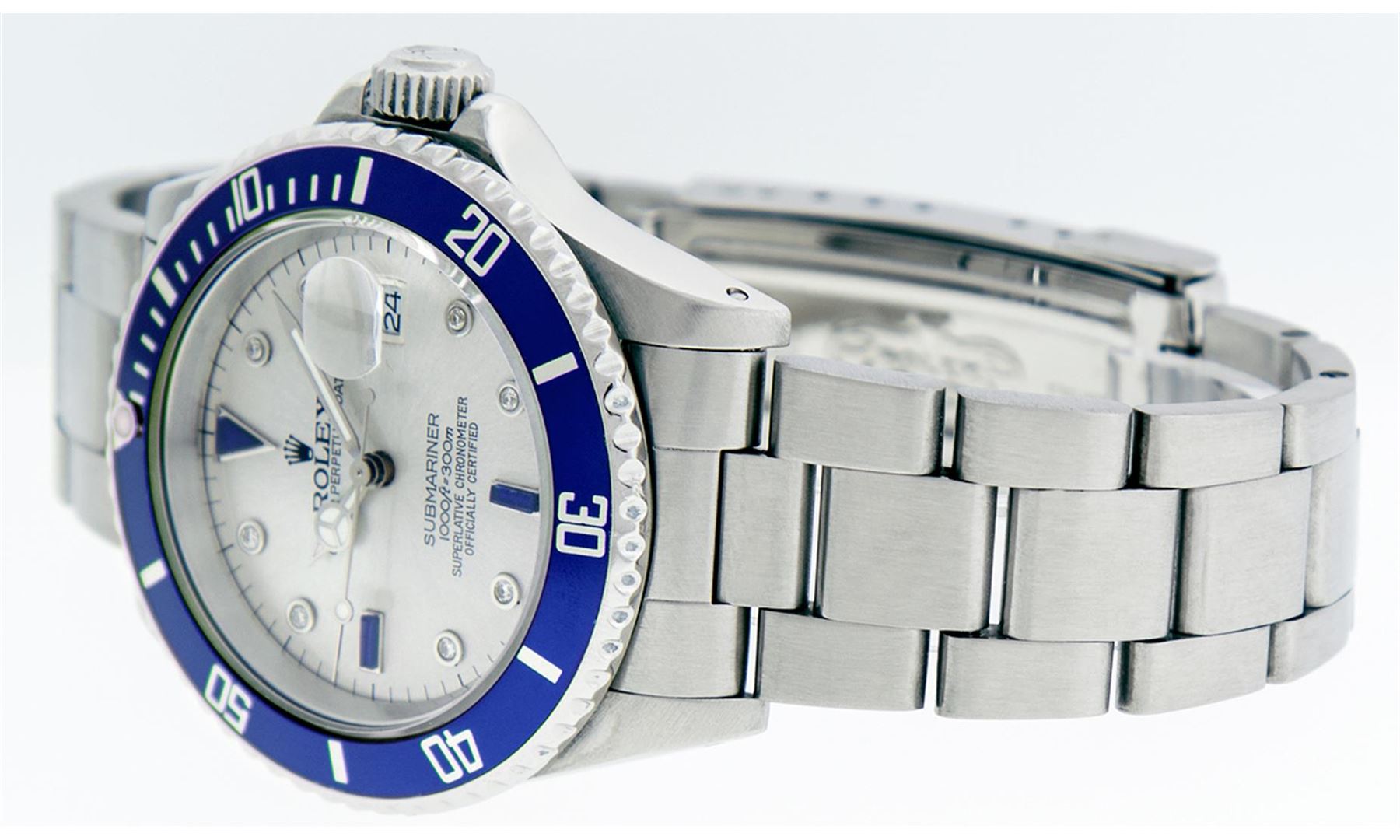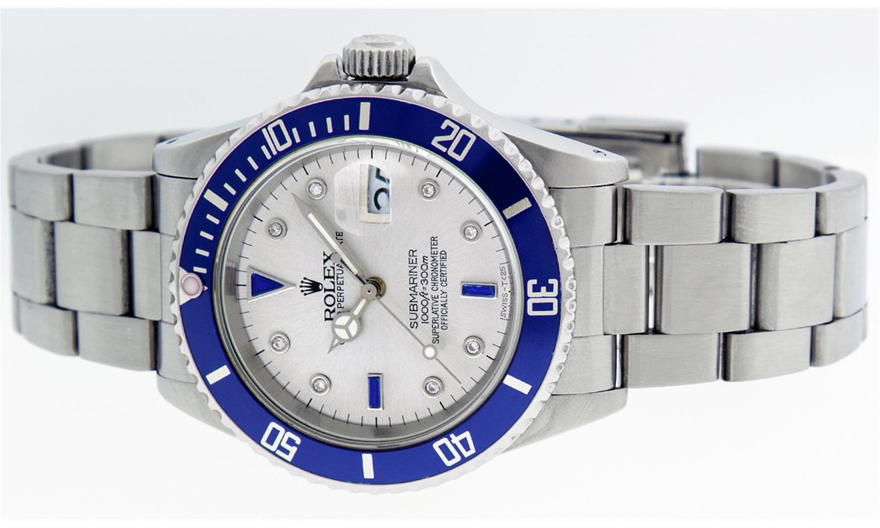 One Mens Rolex Submariner With Date Polished, Serviced & Electronically Tested, Stainless Steel Case:41mm, Stainless Steel Crown, Custom Bezel: Stainless Steel Rotatable Bezel With Blue Insert. Crystal: Synthetic Sapphire Cyclops Lens. Movement: Automatic Winding Movement Caliber 3135. Custom Dial: Silver Serti Diamond & Sapphire Dial, Diamond Count: 8 Diamonds + 2 Baguette Sapphires, Color: G To H, Clarity: SI-VS. Date Window: 3 O'Clock Position Date Display, Model: Submariner 16610, Quickset, Condition: G-6 Extra Fine. Bracelet: Stainless Steel Oyster. Bright Polish & Satin Finish. 7.0 Inch Length, Adjustable. Standard Clasp, With Rolex Logo. Comes with 6 month warranty.