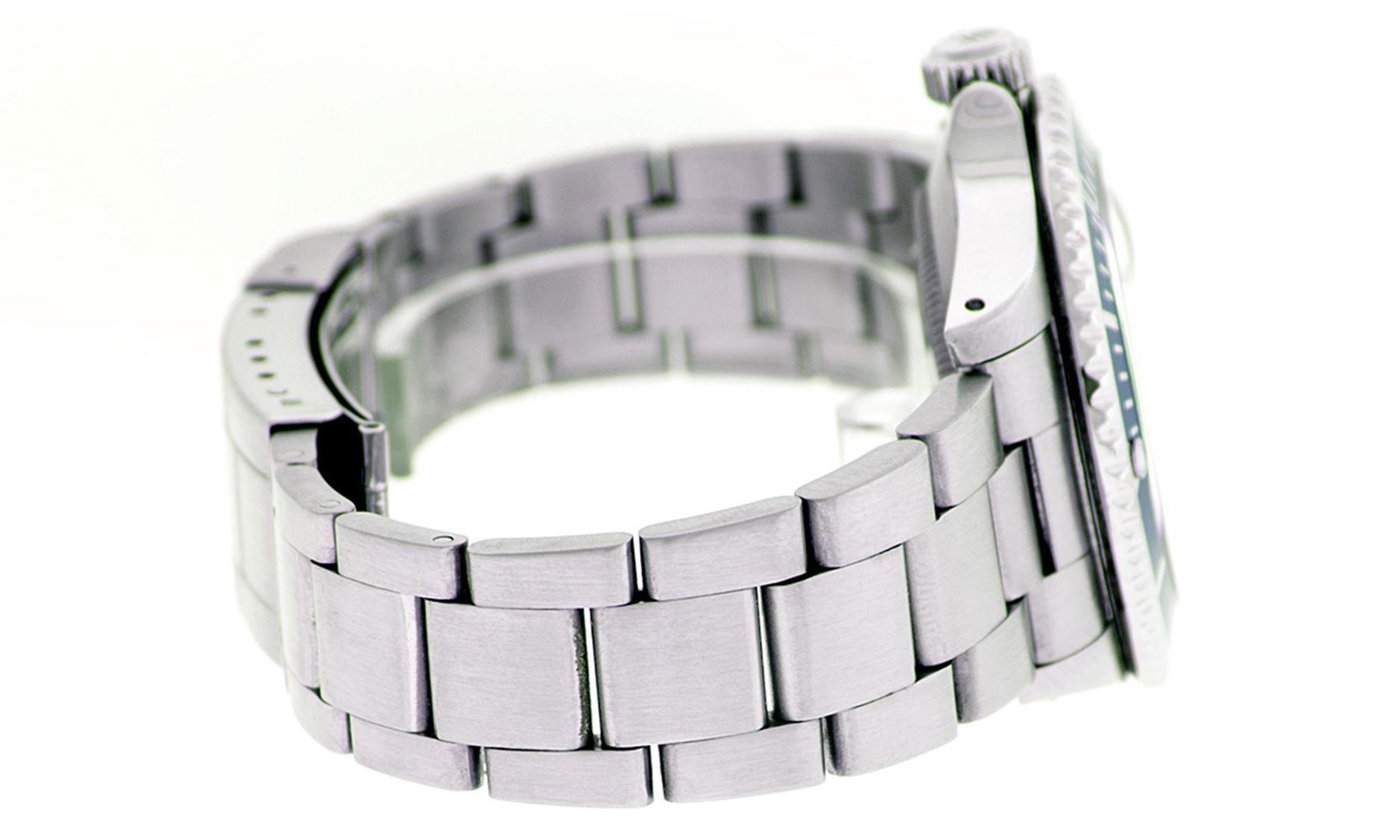 One Mens Rolex Submariner With Date Polished, Serviced & Electronically Tested, Stainless Steel Case:41mm, Stainless Steel Crown, Custom Bezel: Stainless Steel Rotatable Bezel With Blue Insert. Crystal: Synthetic Sapphire Cyclops Lens. Movement: Automatic Winding Movement Caliber 3135. Custom Dial: Silver Serti Diamond & Sapphire Dial, Diamond Count: 8 Diamonds + 2 Baguette Sapphires, Color: G To H, Clarity: SI-VS. Date Window: 3 O'Clock Position Date Display, Model: Submariner 16610, Quickset, Condition: G-6 Extra Fine. Bracelet: Stainless Steel Oyster. Bright Polish & Satin Finish. 7.0 Inch Length, Adjustable. Standard Clasp, With Rolex Logo. Comes with 6 month warranty.