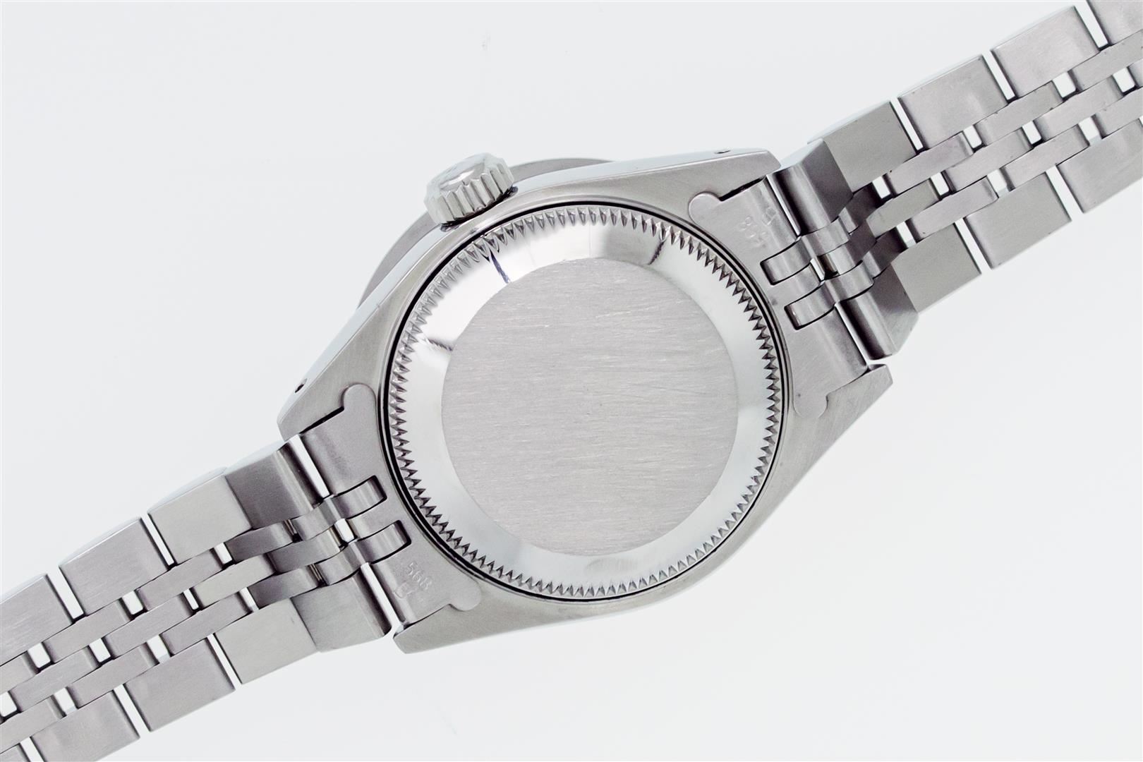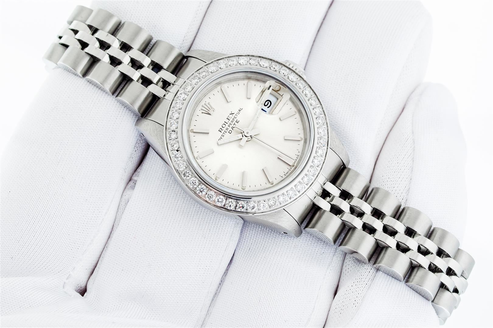One Ladies Pre Owned Stainless Steel Rolex Datejust Polished Bright with Satin Finish, Serviced & Electronically Tested, Stainless Steel Case: 26mm, Stainless Steel Crown, Custom Bezel: New 18K Stainless Steel Beadset Diamond Bezel, Diamond Count: 40 Diamonds, Total Weight .70 Carat, Clarity: SI-VS, Color: G to H. Custom Crystal: New Sapphire With Magnified Date Window. Custom Hands: New Luminescent Hands. Rolex Movement: Automatic Winding Movement. Rolex Dial: Factory Silver Dial With Index Hour Markers And Lumi Dots. Date Window: 3 O'Clock Position Date Display, Model: Datejust. Condition: G-6 Extra Fine. Rolex Bracelet: Stainless Steel Jubilee Band. Bright Polish & Satin Finish. 6.0 Inch Length, Adjustable. Standard Clasp, With Rolex Logo. This Watch Has Been Serviced Time Tested And Is In Excellent Condition It Is Free Of All Scratches And Dents.