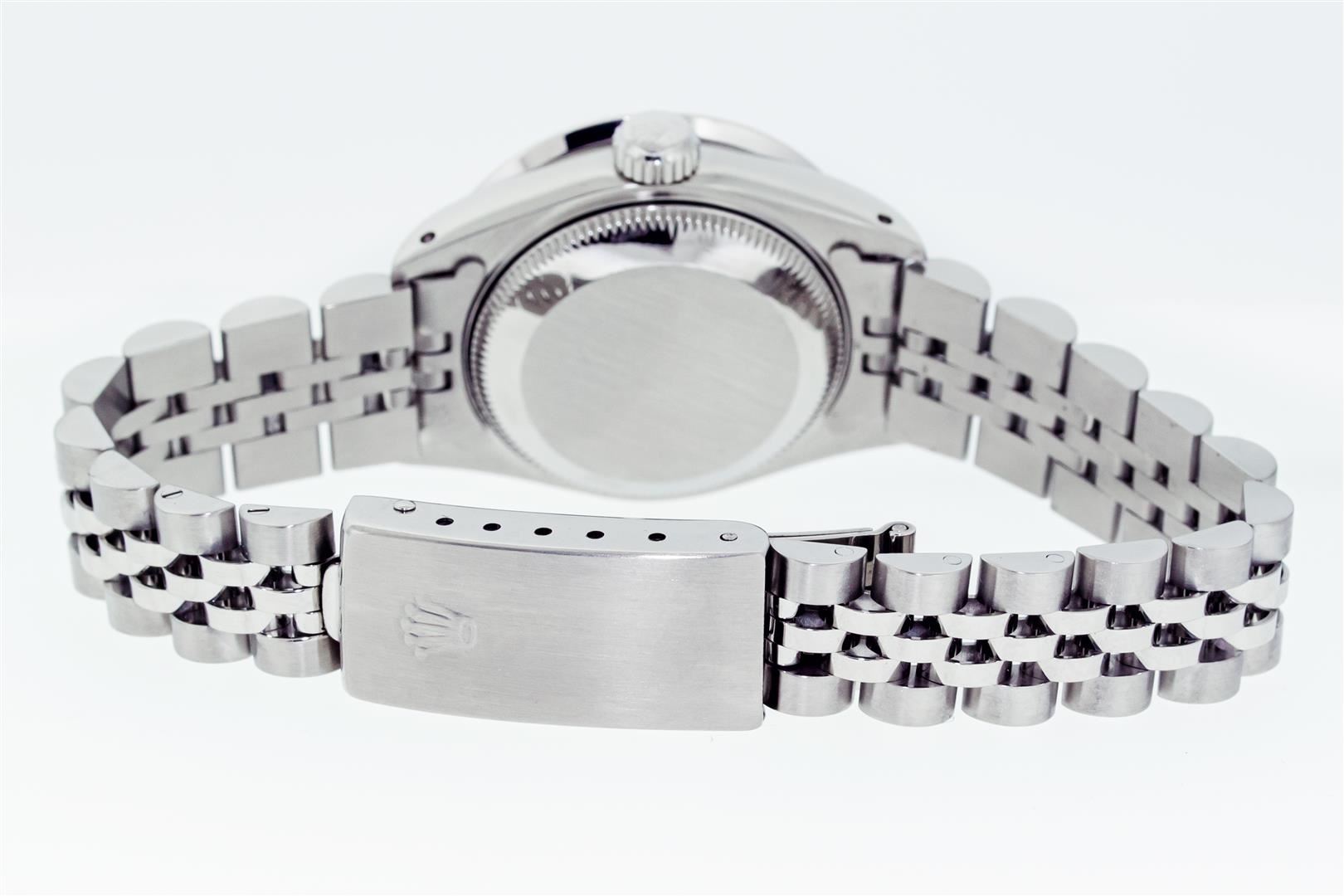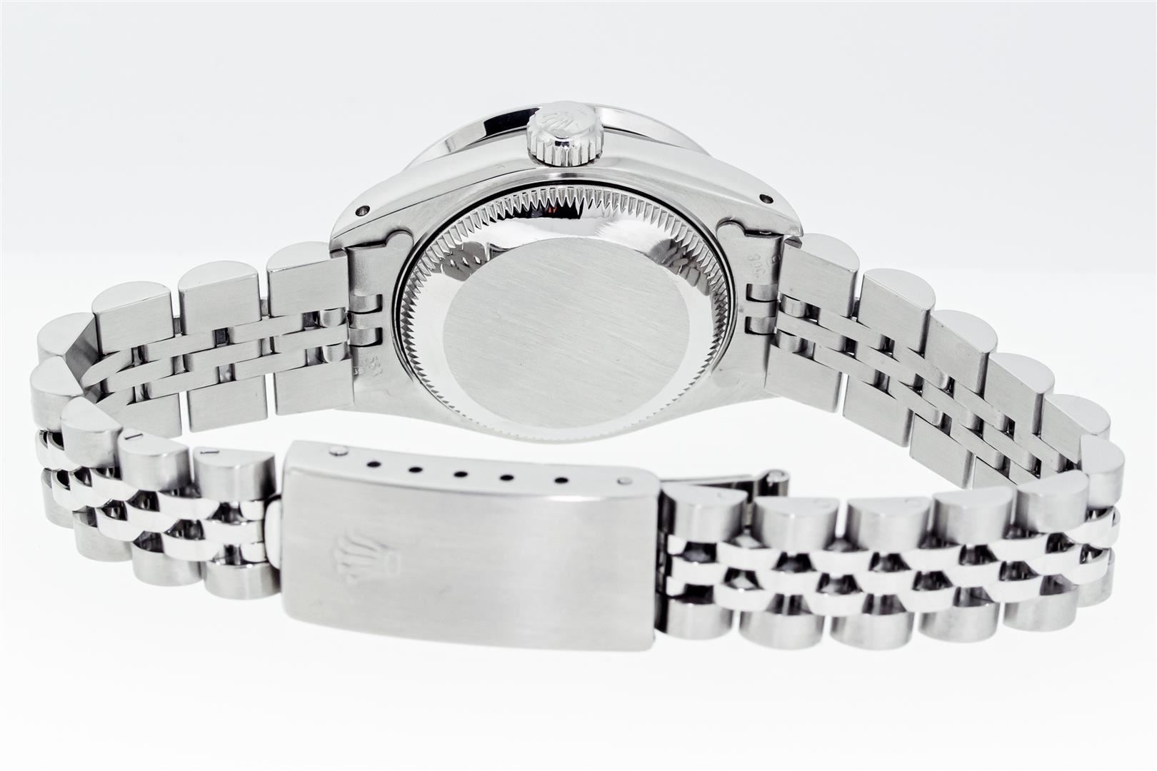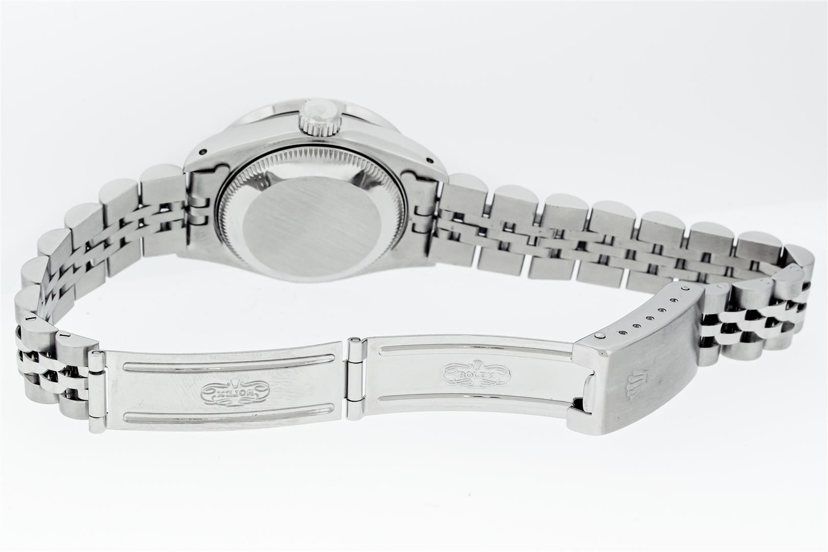One Ladies Pre Owned Stainless Steel Rolex Datejust Polished Bright with Satin Finish, Serviced & Electronically Tested, Stainless Steel Case: 26mm, Stainless Steel Crown, Custom Bezel: New 18K Stainless Steel Beadset Diamond Bezel, Diamond Count: 40 Diamonds, Total Weight .70 Carat, Clarity: SI-VS, Color: G to H. Custom Crystal: New Sapphire With Magnified Date Window. Custom Hands: New Luminescent Hands. Rolex Movement: Automatic Winding Movement. Rolex Dial: Factory Silver Dial With Index Hour Markers And Lumi Dots. Date Window: 3 O'Clock Position Date Display, Model: Datejust. Condition: G-6 Extra Fine. Rolex Bracelet: Stainless Steel Jubilee Band. Bright Polish & Satin Finish. 6.0 Inch Length, Adjustable. Standard Clasp, With Rolex Logo. This Watch Has Been Serviced Time Tested And Is In Excellent Condition It Is Free Of All Scratches And Dents.