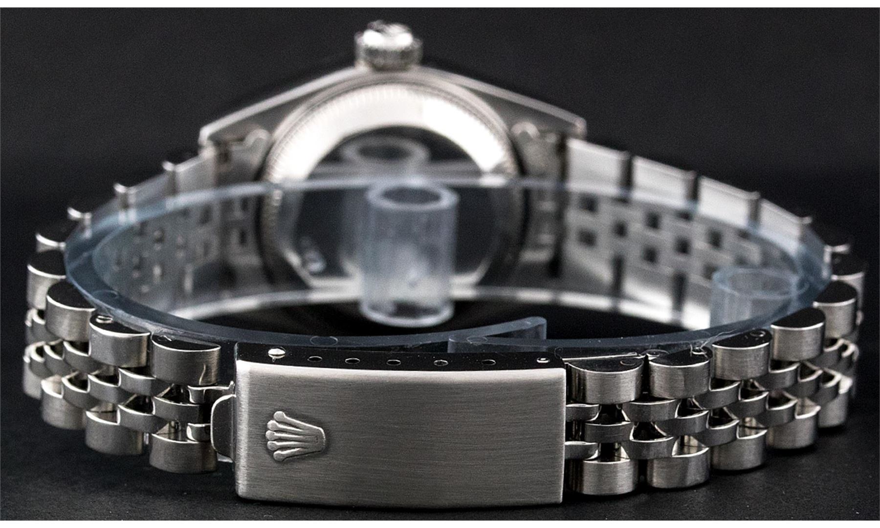 One Ladies Rolex Datejust Polished Bright with Satin Finish, Serviced & Electronically Tested, Stainless Steel No Hole Case:26mm, Stainless Steel Crown, Bezel: Stainless Steel Smooth. Crystal: Synthetic Sapphire Cyclops Lens. Movement: Automatic Winding Movement Caliber 2235. Dial: Silver Index Hour Markers. Date Window: 3 O'Clock Position Date Display, Quickset, Model: Datejust, Condition: G-6 Extra Fine. Bracelet: Stainless Steel Jubilee. Bright Polish & Satin Finish. 6.0 Inch Length, Adjustable. Standard Clasp, With Rolex Logo.
