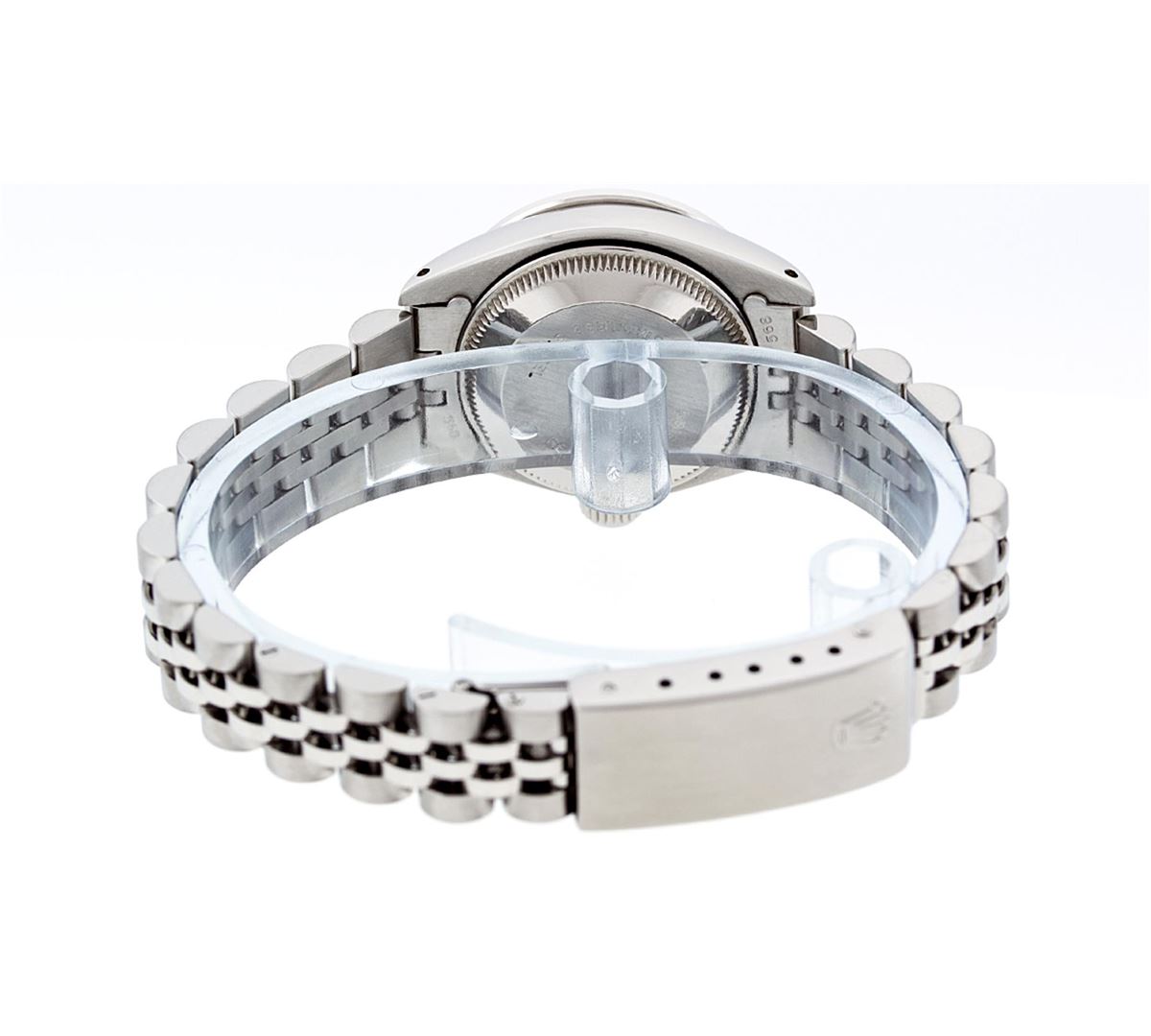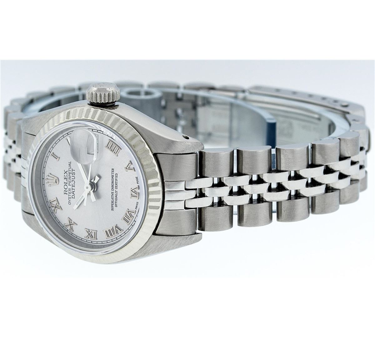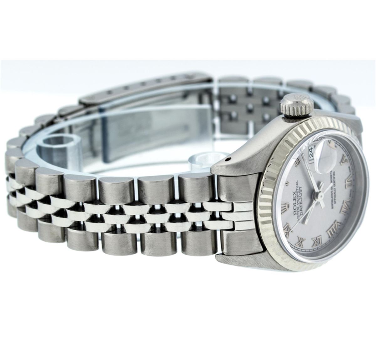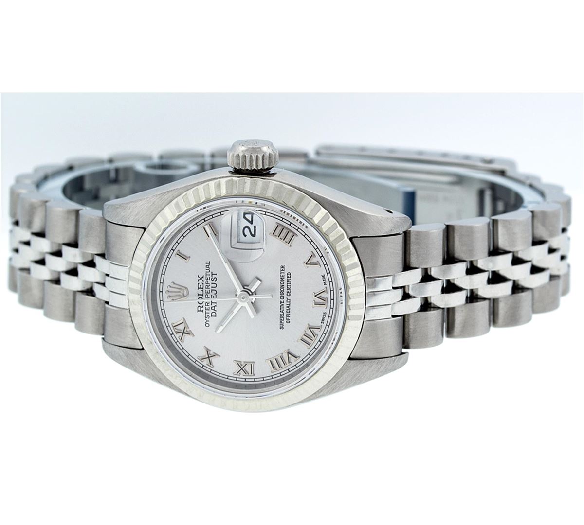 One Ladies Rolex Datejust Polished Bright with Satin Finish, Serviced & Electronically Tested, Stainless Steel Case:26mm, Stainless Steel Crown, Bezel:14K White Gold Fluted. Custom Crystal: Acrylic Cyclops Lens. Movement: Automatic Winding Movement Caliber 2030. Custom Dial: Silver With Roman Hour Markers. Date Window: 3 O'Clock Position Date Display, Non Quickset, Model: 6917 Condition: G-6 Extra Fine. Bracelet: Stainless Steel Jubilee Band. Bright Polish & Satin Finish. 6.0 Inch Length, Adjustable. Standard Clasp, With Rolex Logo.