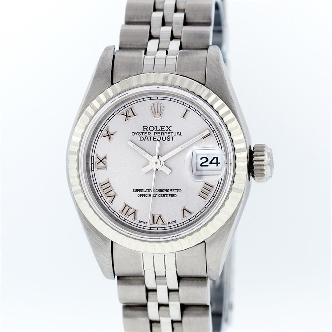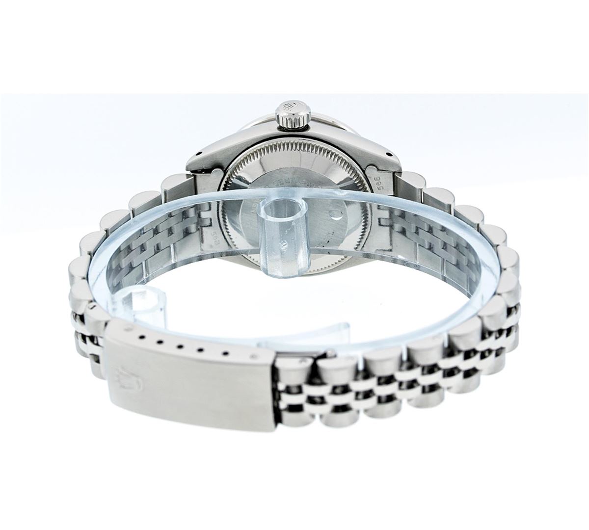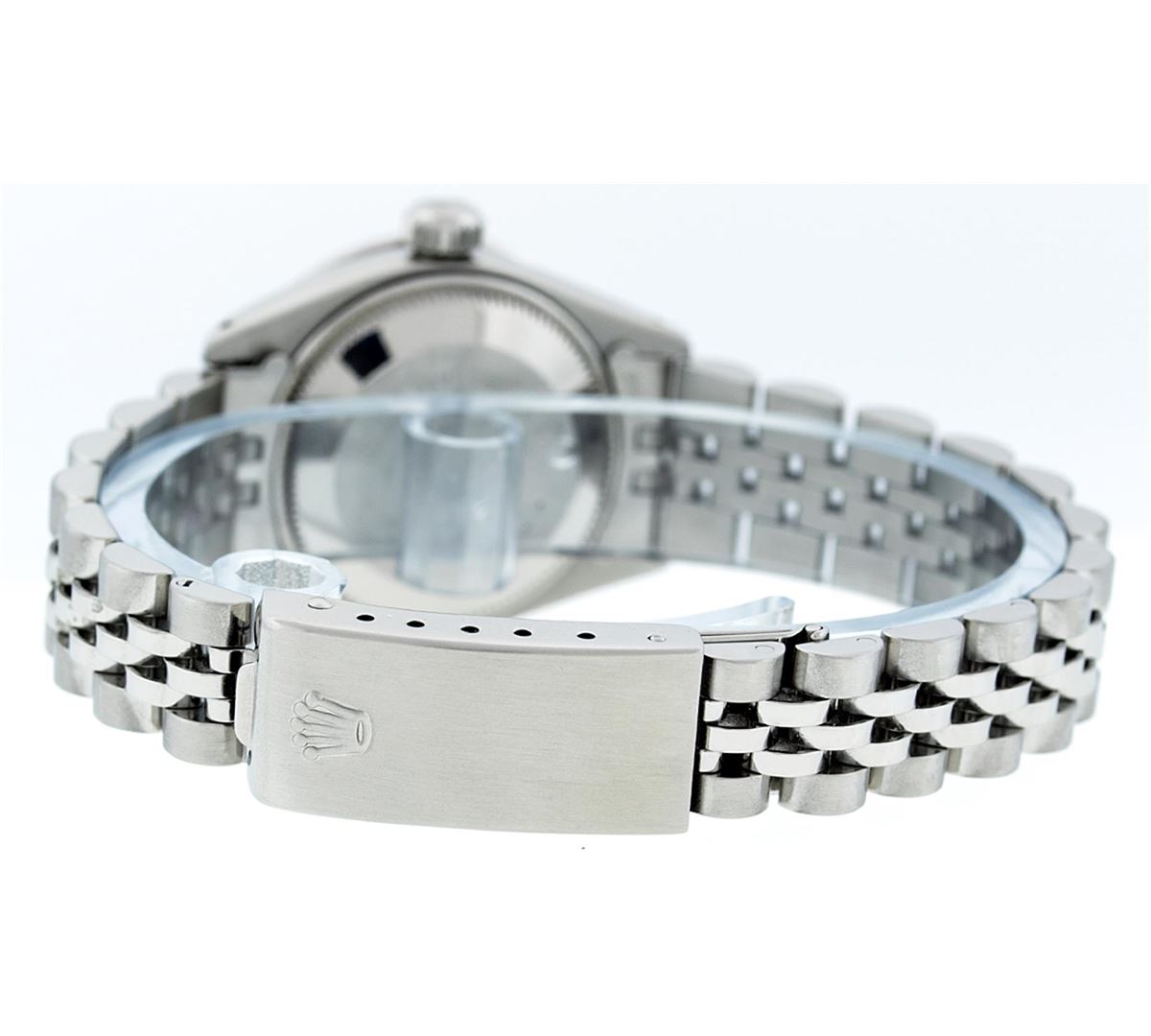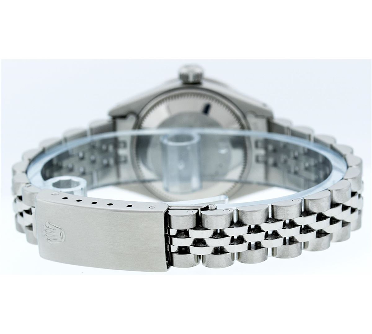 One Ladies Rolex Datejust Polished Bright with Satin Finish, Serviced & Electronically Tested, Stainless Steel Case:26mm, Stainless Steel Crown, Bezel:14K White Gold Fluted. Custom Crystal: Acrylic Cyclops Lens. Movement: Automatic Winding Movement Caliber 2030. Custom Dial: Silver With Roman Hour Markers. Date Window: 3 O'Clock Position Date Display, Non Quickset, Model: 6917 Condition: G-6 Extra Fine. Bracelet: Stainless Steel Jubilee Band. Bright Polish & Satin Finish. 6.0 Inch Length, Adjustable. Standard Clasp, With Rolex Logo.
