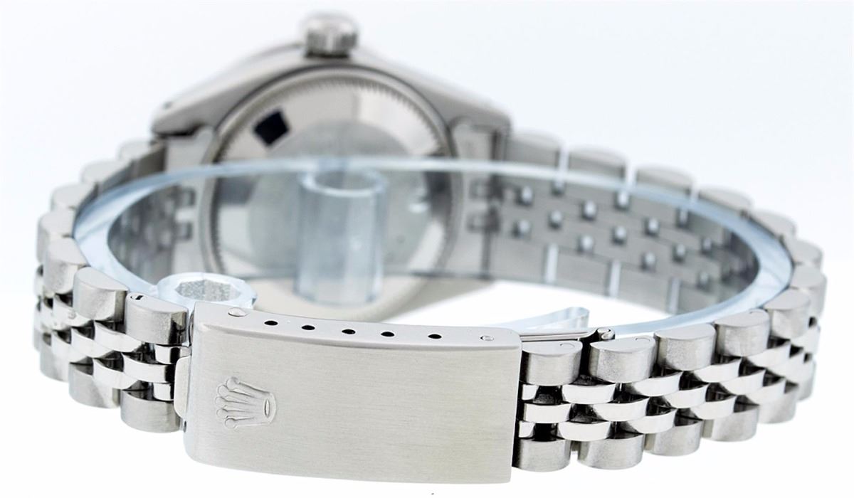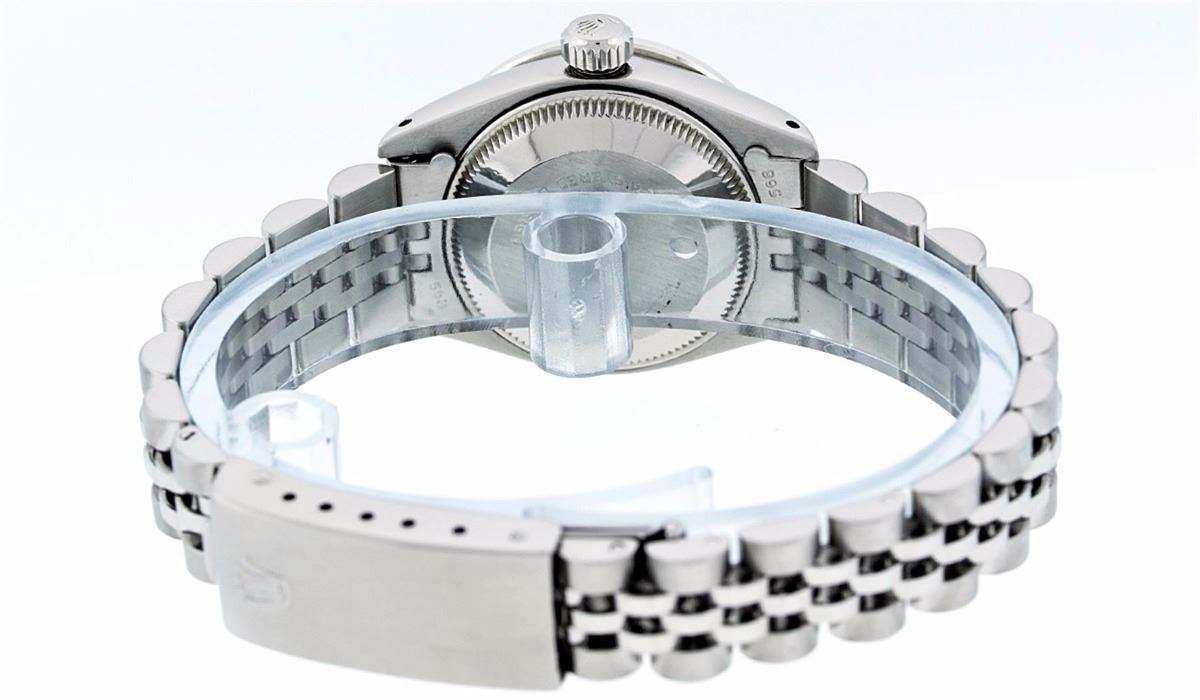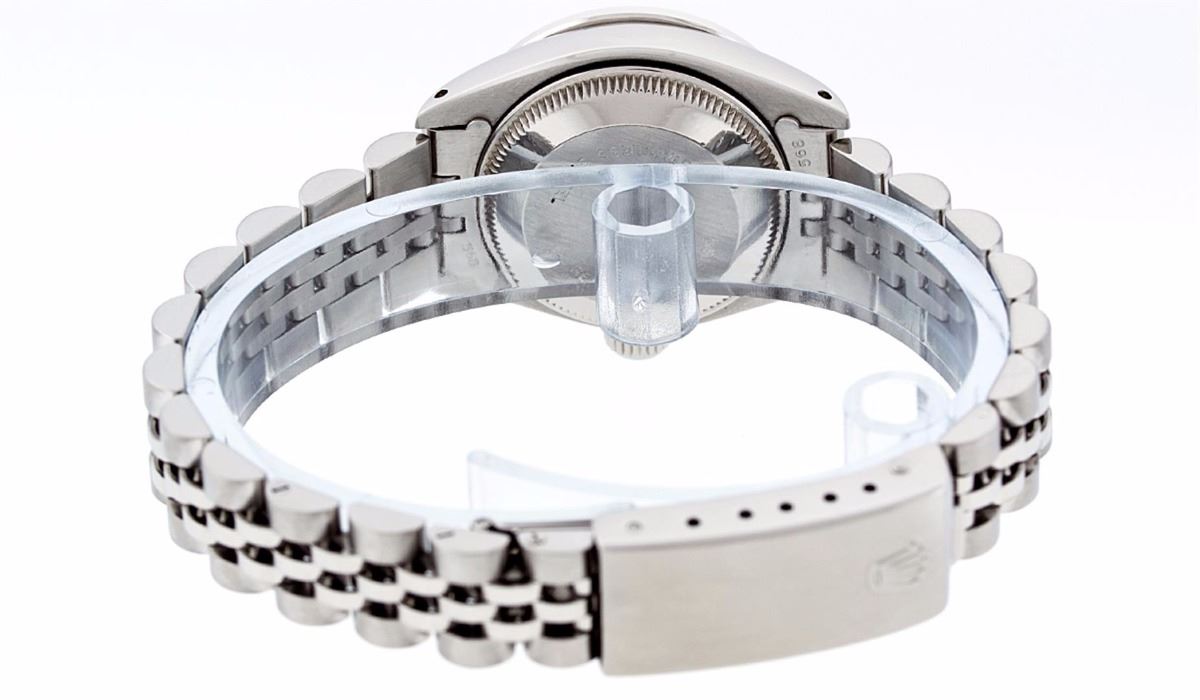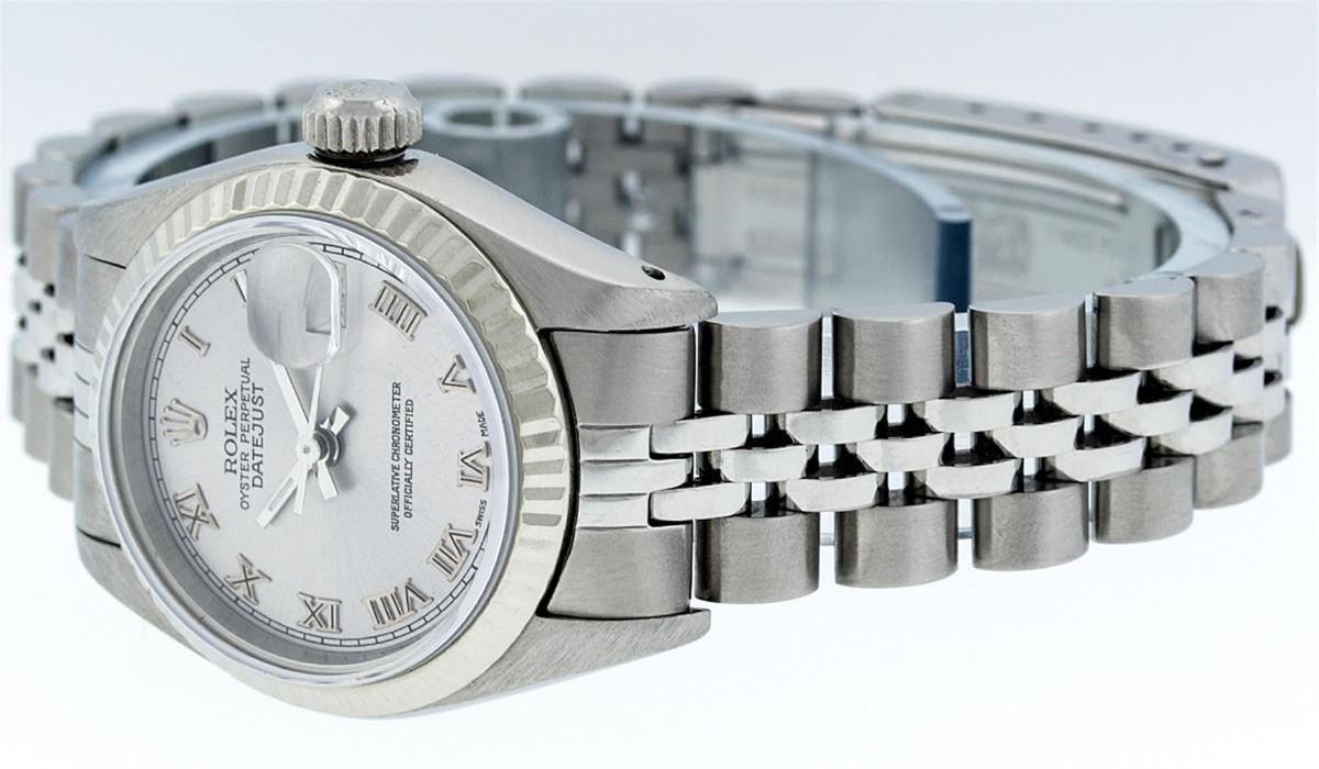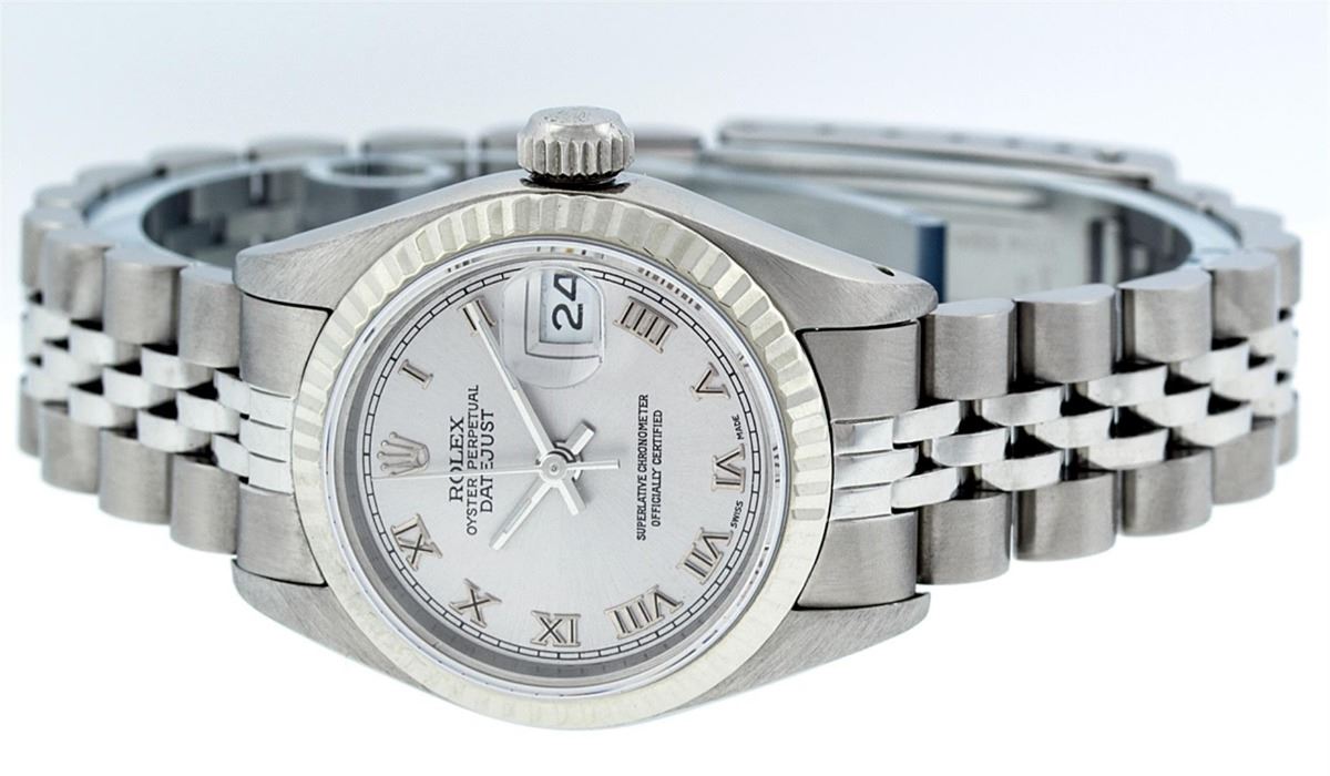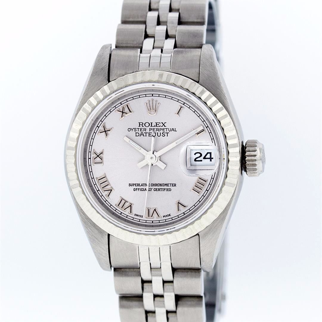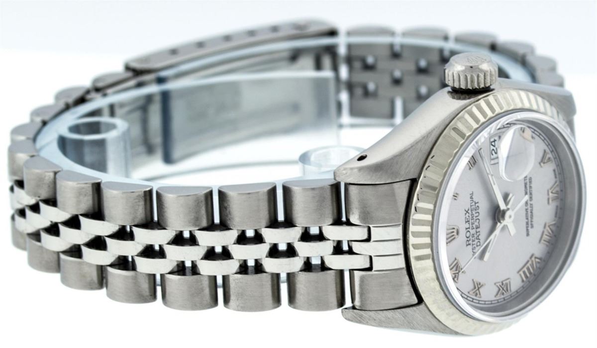 One Ladies Rolex Datejust Polished Bright with Satin Finish, Serviced & Electronically Tested, Stainless Steel Case:26mm, Stainless Steel Crown, Bezel:14K White Gold Fluted. Custom Crystal: Acrylic Cyclops Lens. Movement: Automatic Winding Movement Caliber 2030. Custom Dial: Silver With Roman Hour Markers. Date Window: 3 O'Clock Position Date Display, Non Quickset, Model: 6917 Condition: G-6 Extra Fine. Bracelet: Stainless Steel Jubilee Band. Bright Polish & Satin Finish. 6.0 Inch Length, Adjustable. Standard Clasp, With Rolex Logo.