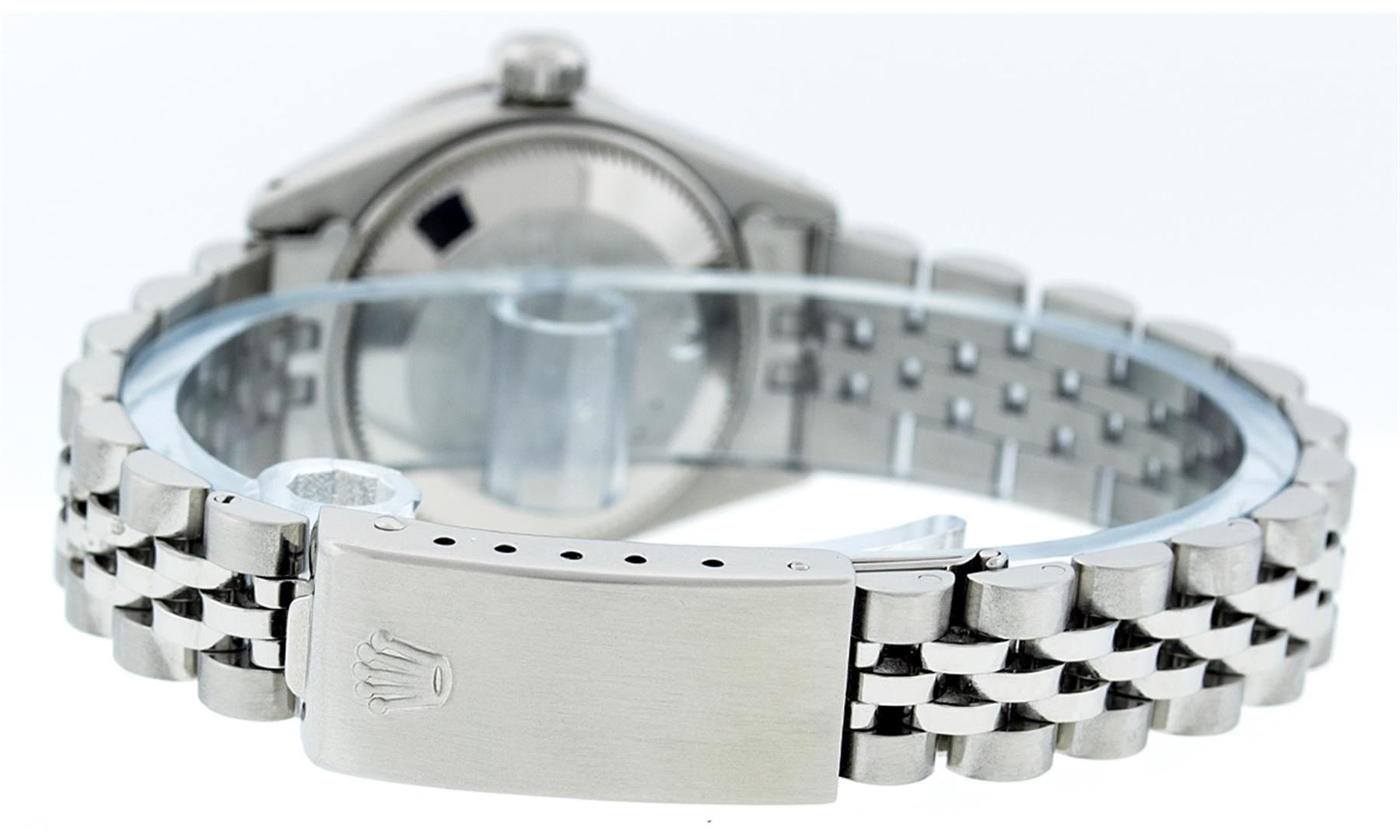 One Ladies Rolex Datejust Polished Bright with Satin Finish, Serviced & Electronically Tested, Stainless Steel Case:26mm, Stainless Steel Crown, Bezel:14K White Gold Fluted. Custom Crystal: Acrylic Cyclops Lens. Movement: Automatic Winding Movement Caliber 2030. Custom Dial: Silver With Roman Hour Markers. Date Window: 3 O'Clock Position Date Display, Non Quickset, Model: 6917 Condition: G-6 Extra Fine. Bracelet: Stainless Steel Jubilee Band. Bright Polish & Satin Finish. 6.0 Inch Length, Adjustable. Standard Clasp, With Rolex Logo.