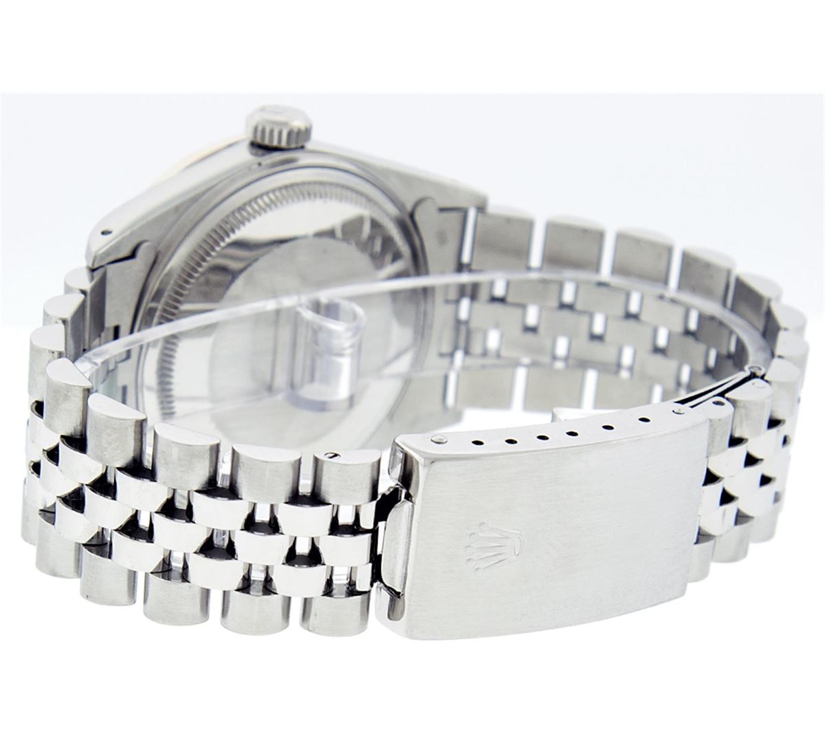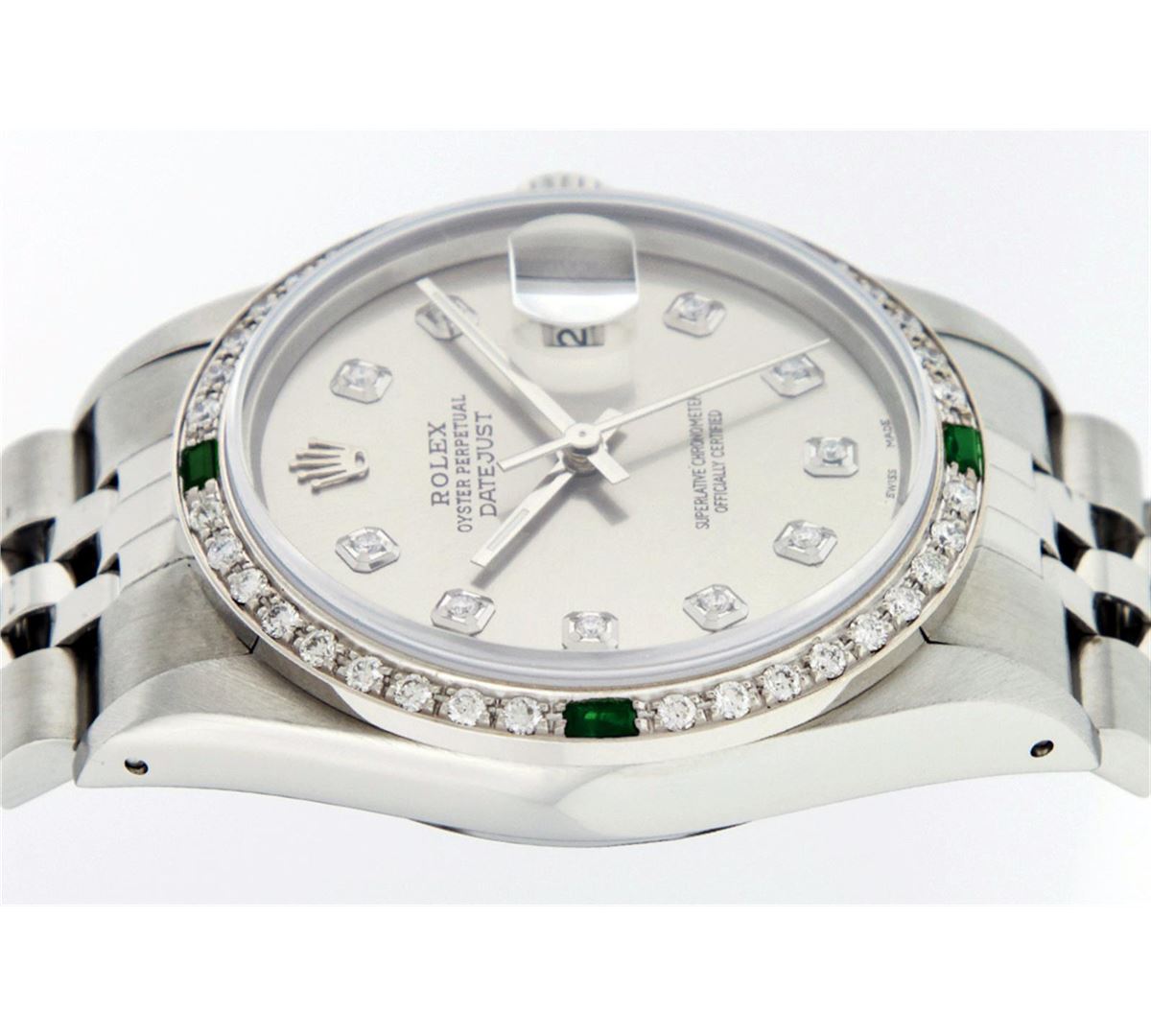 One Gents Rolex Datejust Polished, Serviced & Electronically Tested, Stainless Steel Case:36mm, Stainless Steel Crown, Custom Bezel: 18K White Gold Emerald Beadset Diamond Bezel, Diamond + Gem Count: 36 Diamonds + 4 Emeralds Total Weight 1.00 Carat, Clarity: SI-VS, Color: G to H. Custom Crystal: Synthetic Sapphire Cyclops Lens. Movement: Automatic Winding Movement Caliber 3035. Custom Dial: Slate Grey With Diamond Hour Markers, 10 Diamond Dial G To H In Color, Clarity: SI-VS. Date Window: 3 O'Clock Position Date Display, Quickset, Model: Datejust, Condition: G-6 Extra Fine. Bracelet: Stainless Steel Jubilee. Bright Polish & Satin Finish. 7.0 Inch Length, Adjustable. Standard Clasp, With Rolex Logo Comes with a 6 month warranty card.