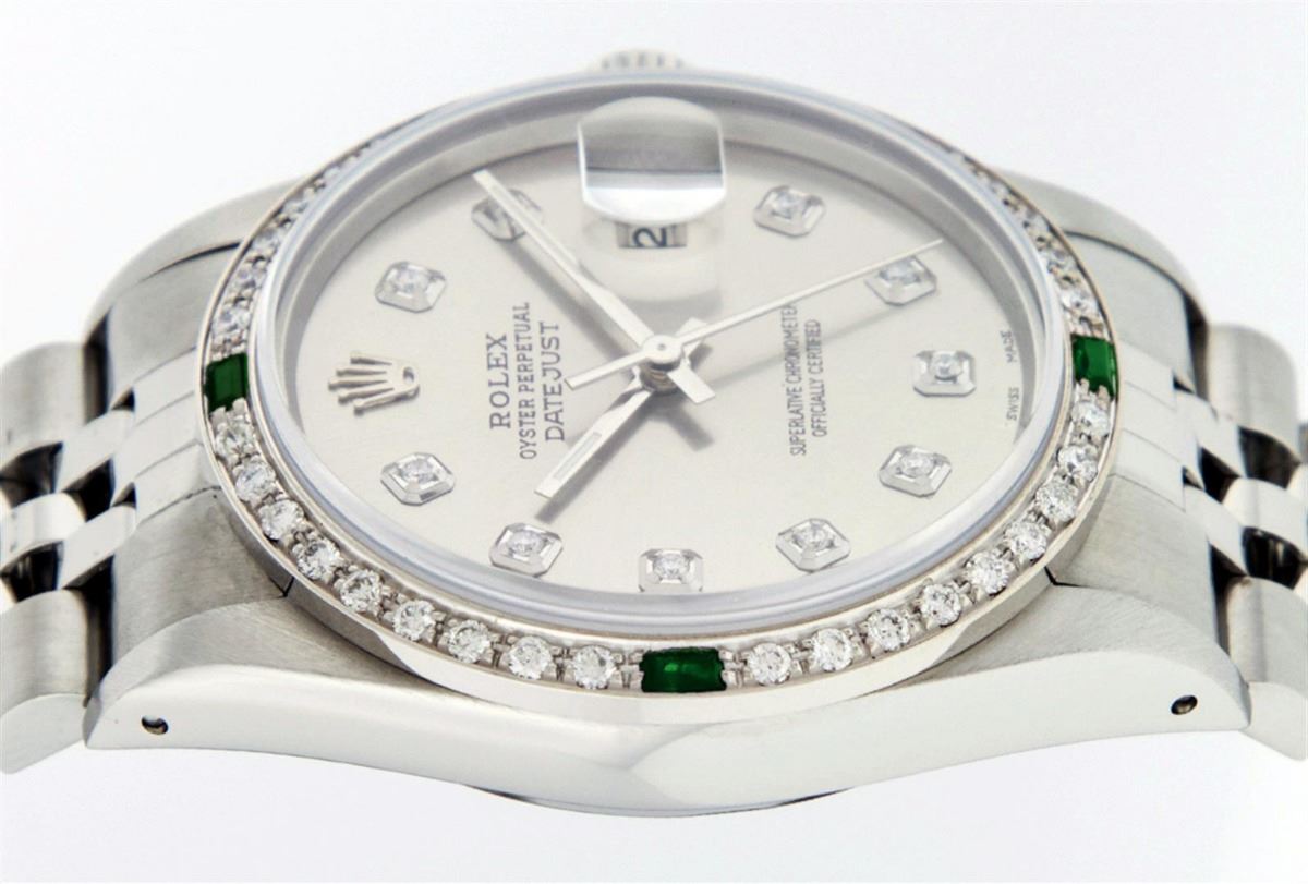 One Gents Rolex Datejust Polished, Serviced & Electronically Tested, Stainless Steel Case:36mm, Stainless Steel Crown, Custom Bezel: 18K White Gold Emerald Beadset Diamond Bezel, Diamond + Gem Count: 36 Diamonds + 4 Emeralds Total Weight 1.00 Carat, Clarity: SI-VS, Color: G to H. Custom Crystal: Synthetic Sapphire Cyclops Lens. Movement: Automatic Winding Movement Caliber 3035. Custom Dial: Slate Grey With Diamond Hour Markers, 10 Diamond Dial G To H In Color, Clarity: SI-VS. Date Window: 3 O'Clock Position Date Display, Quickset, Model: Datejust, Condition: G-6 Extra Fine. Bracelet: Stainless Steel Jubilee. Bright Polish & Satin Finish. 7.0 Inch Length, Adjustable. Standard Clasp, With Rolex Logo Comes with a 6 month warranty card.