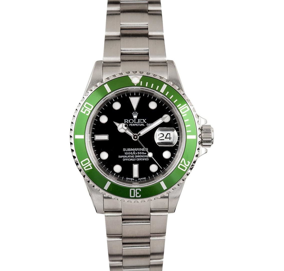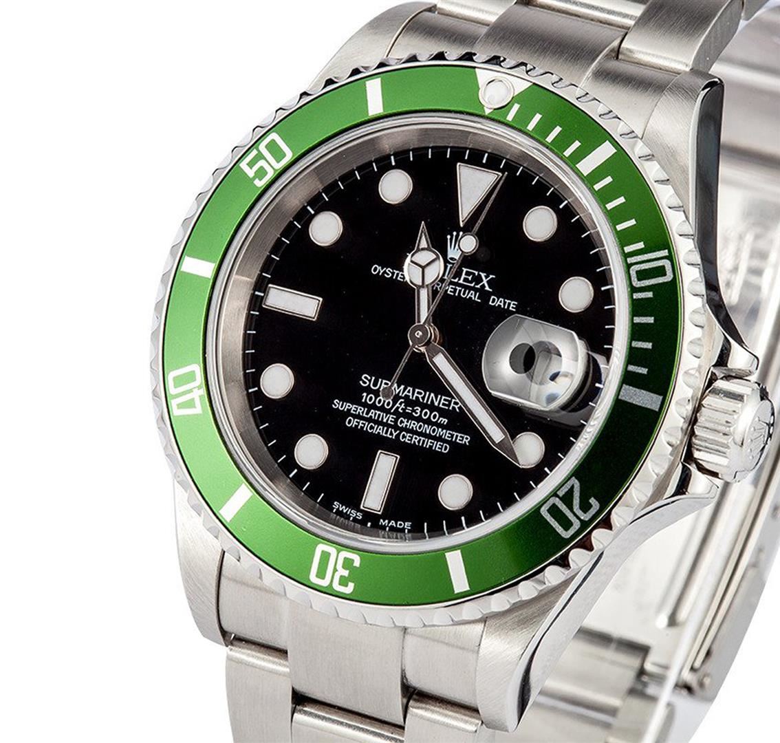 One gents stainless steel Rolex Submariner Anniversary Edition wristwatch. Model Name/Number: Submariner 16610v. The watch features automatic movement with date, waterproof screw-down crown, unidirectional rotatable diver's bezel, scratch-resistant sapphire crystal. Case: Stainless steel with green anniversary edition bezel, no holes case. Dial: Black with luminous markers. Bracelet: Stainless Steel Oyster.