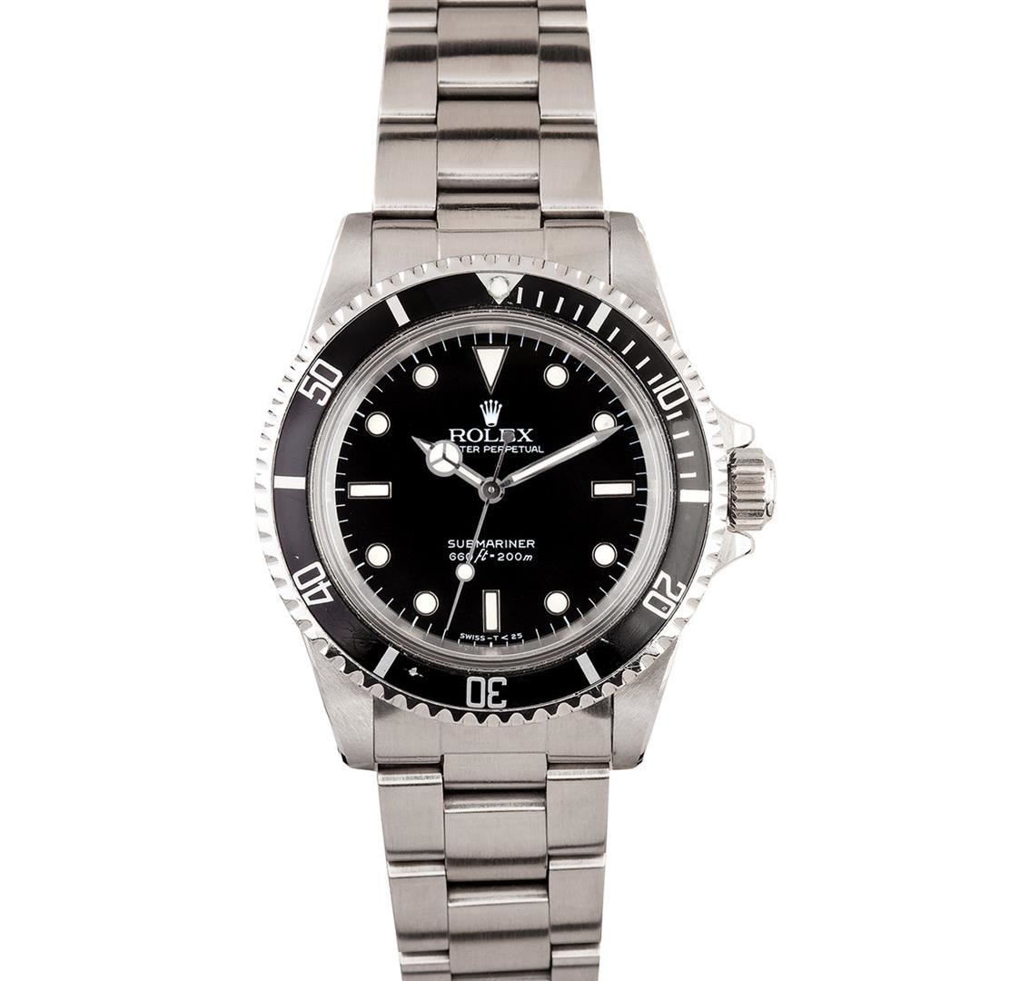 One gents stainless steel Rolex Submariner wristwatch. Model Name/Number: Submariner 5513. The watch features automatic 1520 movement, waterproof screw-down crown, acrylic crystal. Case: Stainless steel case, rotating divers bezel, pierced lugs. Dial: Black "spider" dial. Bracelet: Rolex 93150 Oyster with 580 end links (12 links).