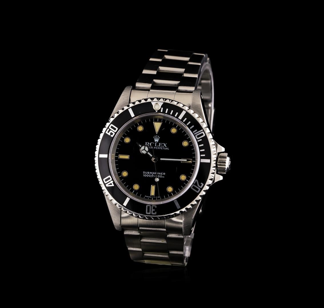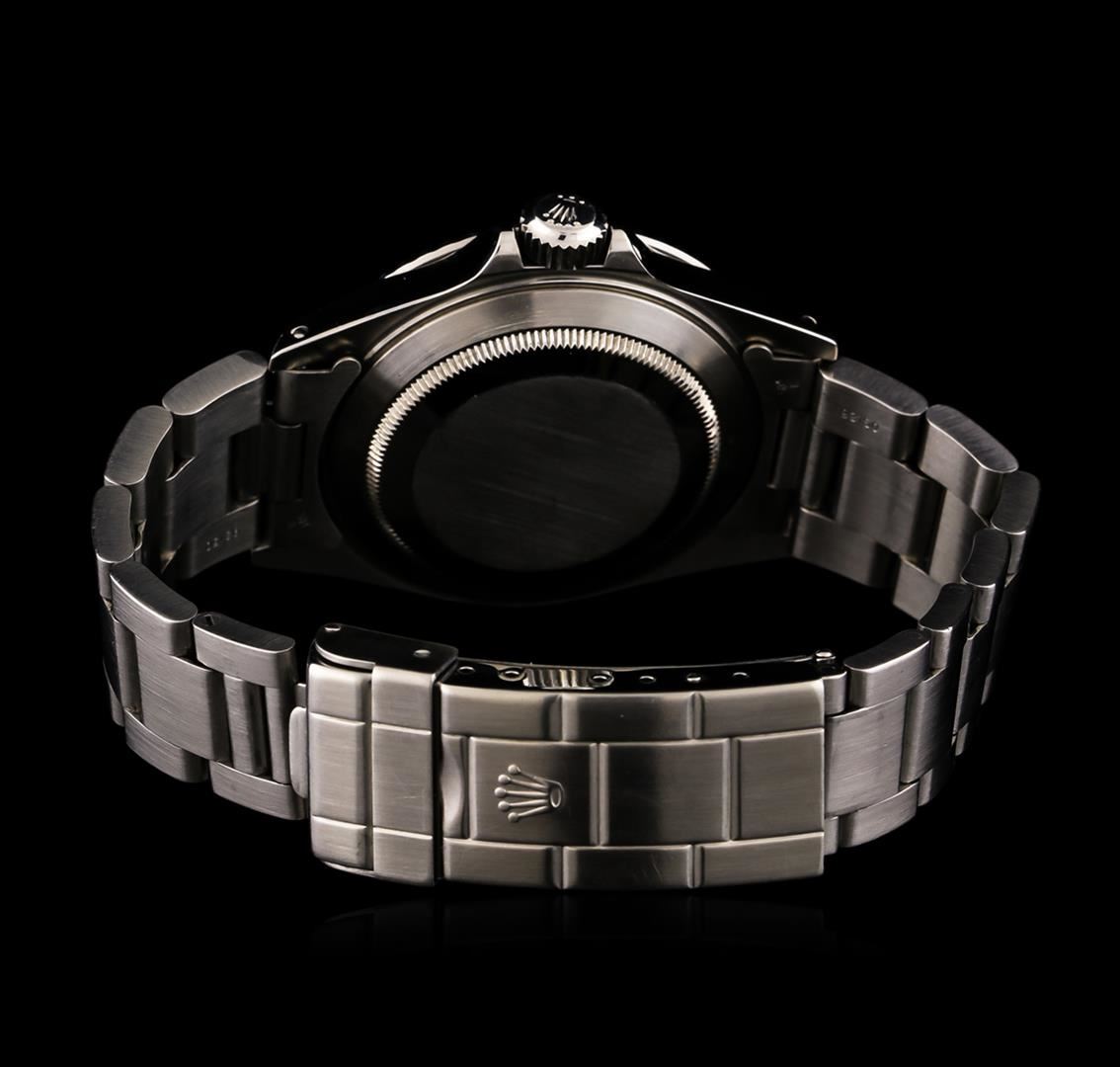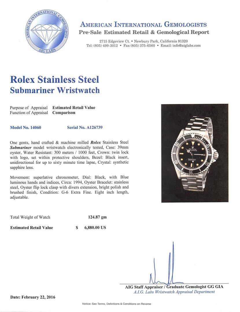 One gents, hand crafted & machine milled Rolex Stainless Steel Submariner model wristwatch electronically tested, Case: 39mm oyster, Water Resistant: 300 meters / 1000 feet, Crown: twin lock with logo, set within protective shoulders, Bezel: Black insert, unidirectional for up to sixty minute time lapse, Crystal: synthetic sapphire lens. Movement: superlative chronometer, Dial: Black, with Blue luminous hands and indices, Circa: 1994, Oyster Bracelet: stainless steel, Oyster flip lock clasp with divers extension, bright polish and brushed finish, Condition: G-6 Extra Fine. Eight inch length, adjustable. Total Weight of Watch 124.87gm. AIG Appraised at $6,880.00.