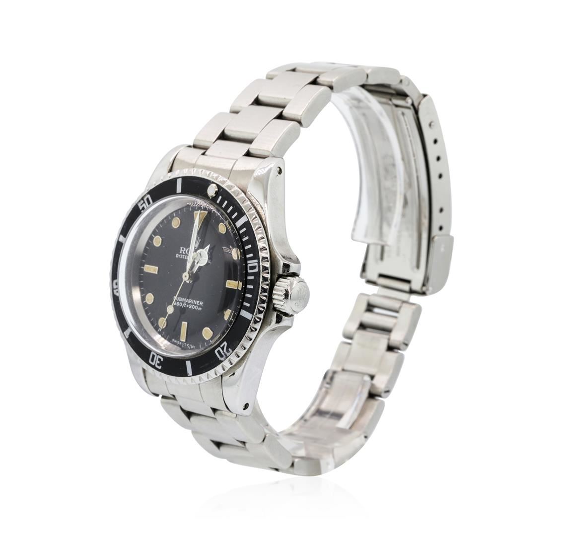 One, hand crafted & machine milled Rolex Stainless Steel Submariner model wristwatch electro-chemically tested.Case: 39mm oyster, factory specifications for Water Resistance: 660 feet / 200 meters, Rolex Signature Crown: twin lock with high relief logo, set within protective shoulders, Bezel: Black insert, unidirectional for up to sixty minute time lapse, Crystal: acrylic lens.Movement: automatic, Dial: Black, with luminous hands and indices, Circa: 1982, Oyster Bracelet: stainless steel, Oyster flip lock clasp with divers extension, bright polish and brushed finish, Condition: G-5 Fine. Eight inch length, adjustable. Total Weight of Watch 119.40gm. AIG Appraised at $8,880.00.