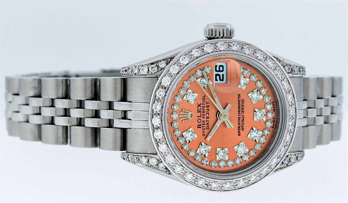 One Ladies Rolex Datejust Polished Bright with Satin Finish, Serviced & Electronically Tested, Stainless Steel Case:26mm, Stainless Steel Crown, Diamond Lugs: 16 Diamonds On Lugs, Clarity: SI-VS, Color: G to H. Custom Bezel: 18K White Gold Beadset Bezel, Diamond Count: 32 Diamonds, Total Weight 1.00 Carat, Clarity: SI-VS, Color: G to H. Custom Crystal: Synthetic Sapphire Cyclops Lens. Movement: Automatic Winding Movement Caliber 2235. Custom Dial: Refinished Orange With String Diamond Dial VVS, 43 Diamonds in Dial G To H In Color, Clarity: VVS. Date Window: 3 O'clock Position Date Display, Model: No Hole Datejust Quickset. Condition: G-6 Extra Fine. Bracelet: Stainless Steel Jubilee Band. Bright Polish & Satin Finish. 6.0 Inch Length, Adjustable. Standard Clasp, With Rolex Logo. Comes with 6 month warranty.