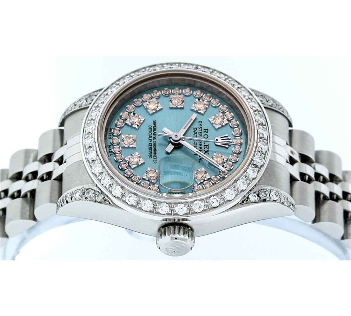 One Ladies Rolex Datejust Polished Bright with Satin Finish, Serviced & Electronically Tested, Stainless Steel Case:26mm, Stainless Steel Crown, Diamond Lugs: 16 Diamonds On Lugs, Clarity: SI-VS, Color: G to H. Custom Bezel: 18K White Gold Beadset Bezel, Diamond Count: 32 Diamonds, Total Weight 1.00 Carat, Clarity: SI-VS, Color: G to H. Custom Crystal: Synthetic Sapphire Cyclops Lens. Movement: Automatic Winding Movement Caliber 2235. Custom Dial: Refinished Sky Blue With String Diamond Dial VVS, 43 Diamonds in Dial G To H In Color, Clarity: VVS. Date Window: 3 O'clock Position Date Display, Model: No Hole Datejust Quickset. Condition: G-6 Extra Fine. Bracelet: Stainless Steel Jubilee Band. Bright Polish & Satin Finish. 6.0 Inch Length, Adjustable. Standard Clasp, With Rolex Logo. Comes with 6 month warranty.