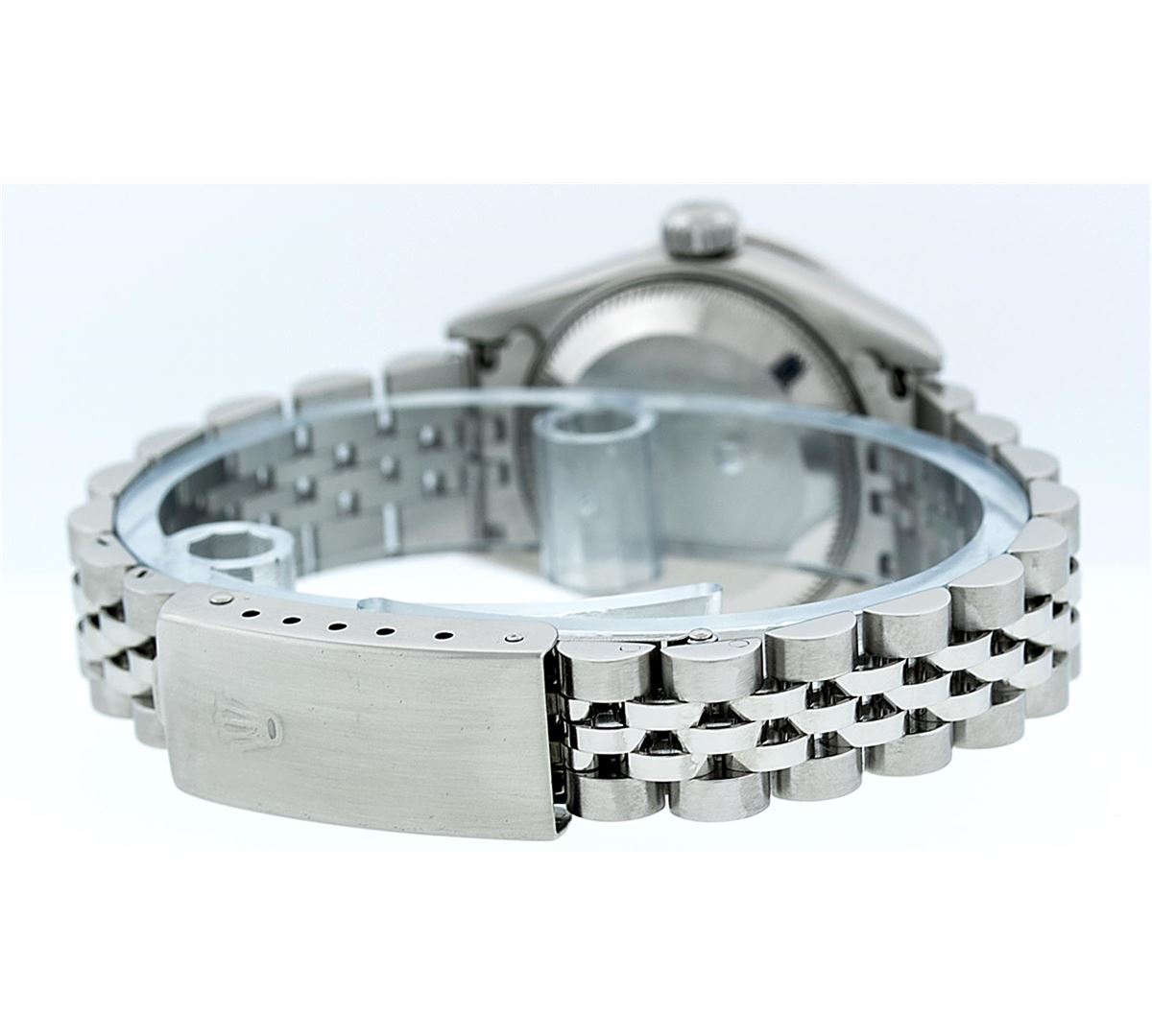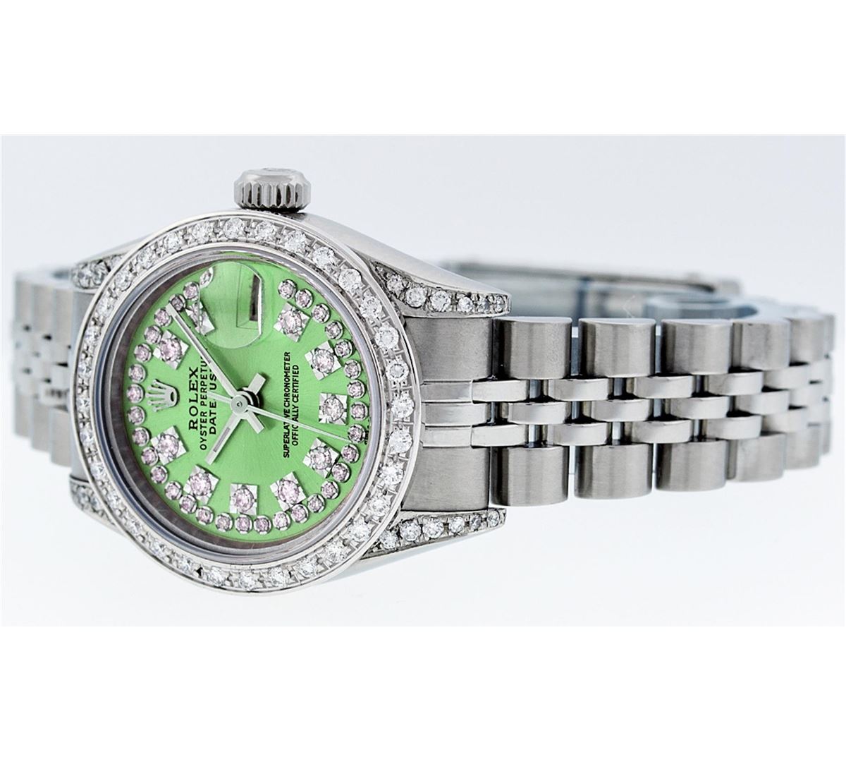 One Ladies Rolex Datejust Polished Bright with Satin Finish, Serviced & Electronically Tested, Stainless Steel Case:26mm, Stainless Steel Crown, Diamond Lugs: 16 Diamonds On Lugs, Clarity: SI-VS, Color: G to H. Custom Bezel: 18K White Gold Beadset Bezel, Diamond Count: 32 Diamonds, Total Weight 1.00 Carat, Clarity: SI-VS, Color: G to H. Custom Crystal: Synthetic Sapphire Cyclops Lens. Movement: Automatic Winding Movement Caliber 2235. Custom Dial: Refinished Green With String Diamond Dial VVS, 43 Diamonds in Dial G To H In Color, Clarity: VVS. Date Window: 3 O'clock Position Date Display, Model: No Hole Quickset Datejust. Condition: G-6 Extra Fine. Bracelet: Stainless Steel Jubilee Band. Bright Polish & Satin Finish. 6.0 Inch Length, Adjustable. Standard Clasp, With Rolex Logo. Comes with 6 month warranty.