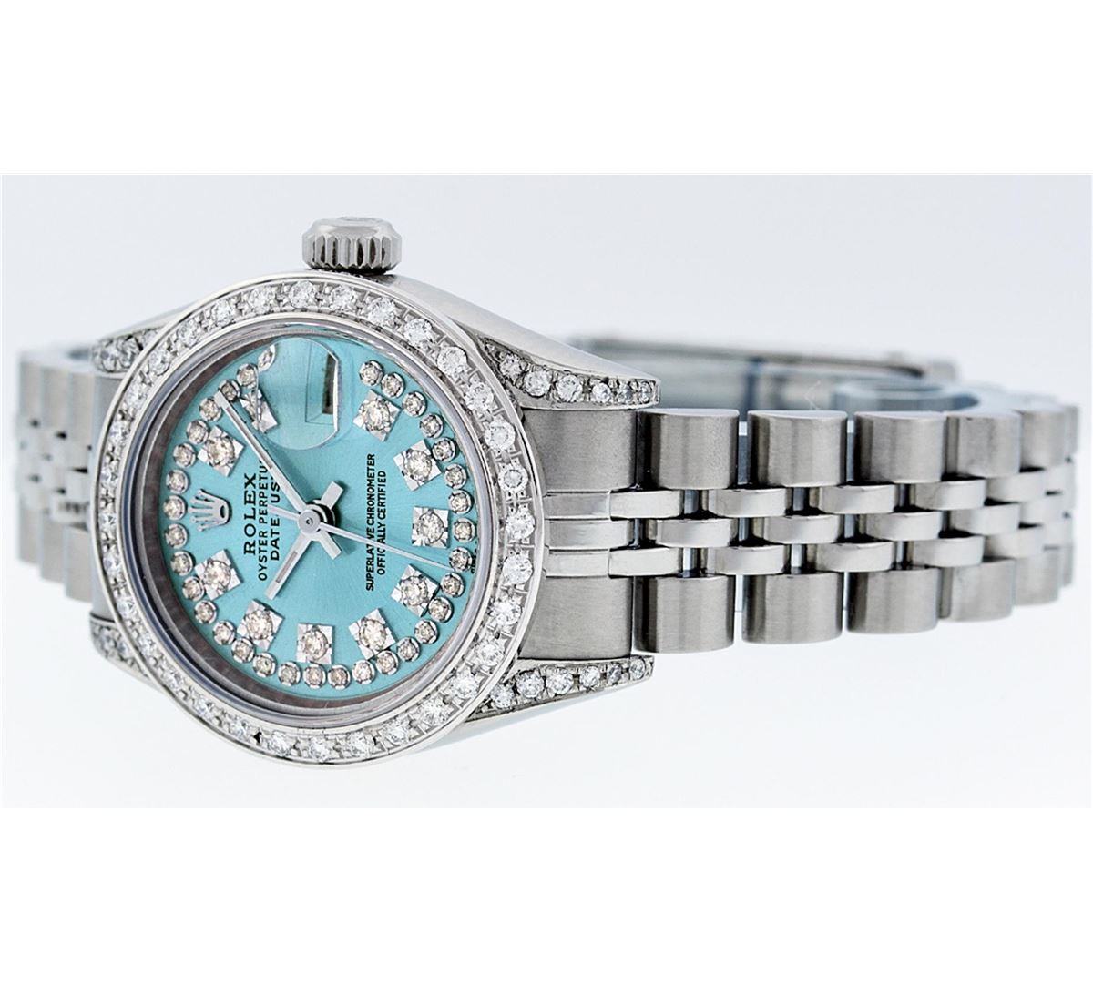 One Ladies Rolex Datejust Polished Bright with Satin Finish, Serviced & Electronically Tested, Stainless Steel Case:26mm, Stainless Steel Crown, Diamond Lugs: 16 Diamonds On Lugs, Clarity: SI-VS, Color: G to H. Custom Bezel: 18K White Gold Beadset Bezel, Diamond Count: 32 Diamonds, Total Weight 1.00 Carat, Clarity: SI-VS, Color: G to H. Custom Crystal: Synthetic Sapphire Cyclops Lens. Movement: Automatic Winding Movement Caliber 2235. Custom Dial: Refinished Sky Blue With String Diamond Dial VVS, 43 Diamonds in Dial G To H In Color, Clarity: VVS. Date Window: 3 O'clock Position Date Display, Model: No Hole Datejust Quickset. Condition: G-6 Extra Fine. Bracelet: Stainless Steel Jubilee Band. Bright Polish & Satin Finish. 6.0 Inch Length, Adjustable. Standard Clasp, With Rolex Logo. Comes with 6 month warranty.