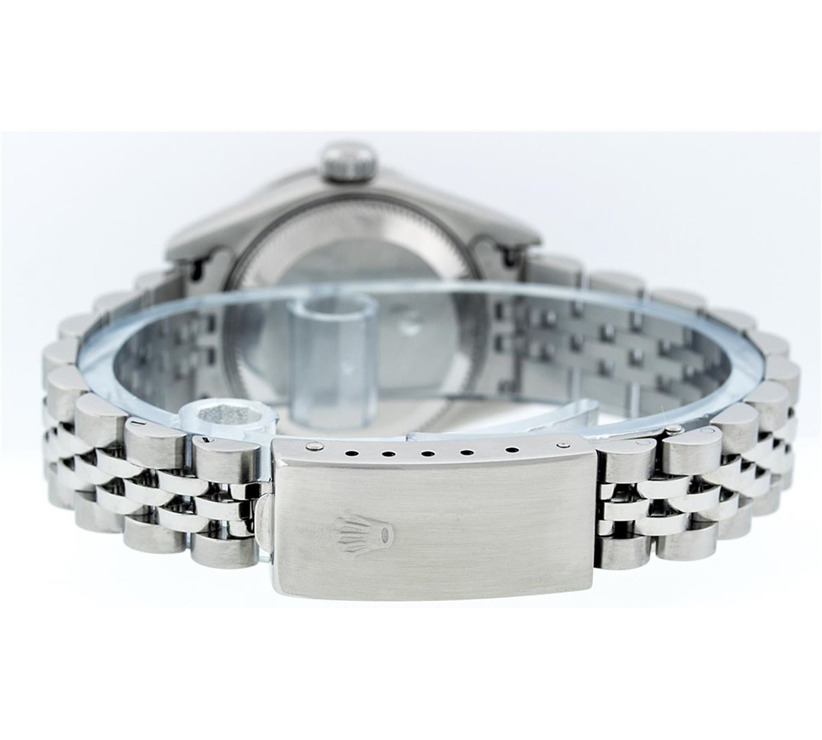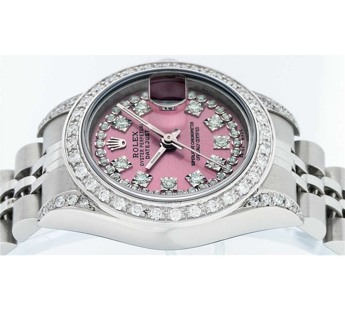 One Ladies Rolex Datejust Polished Bright with Satin Finish, Serviced & Electronically Tested, Stainless Steel Case:26mm, Stainless Steel Crown, Diamond Lugs: 16 Diamonds On Lugs, Clarity: SI-VS, Color: G to H. Custom Bezel: 18K White Gold Beadset Bezel, Diamond Count: 32 Diamonds, Total Weight 1.00 Carat, Clarity: SI-VS, Color: G to H. Custom Crystal: Synthetic Sapphire Cyclops Lens. Movement: Automatic Winding Movement Caliber 2235. Custom Dial: Refinished Pink With String Diamond Dial VVS, 43 Diamonds in Dial G To H In Color, Clarity: VVS. Date Window: 3 O'clock Position Date Display, Model: No Hole Quickset Datejust. Condition: G-6 Extra Fine. Bracelet: Stainless Steel Jubilee Band. Bright Polish & Satin Finish. 6.0 Inch Length, Adjustable. Standard Clasp, With Rolex Logo. Comes with 6 month warranty.