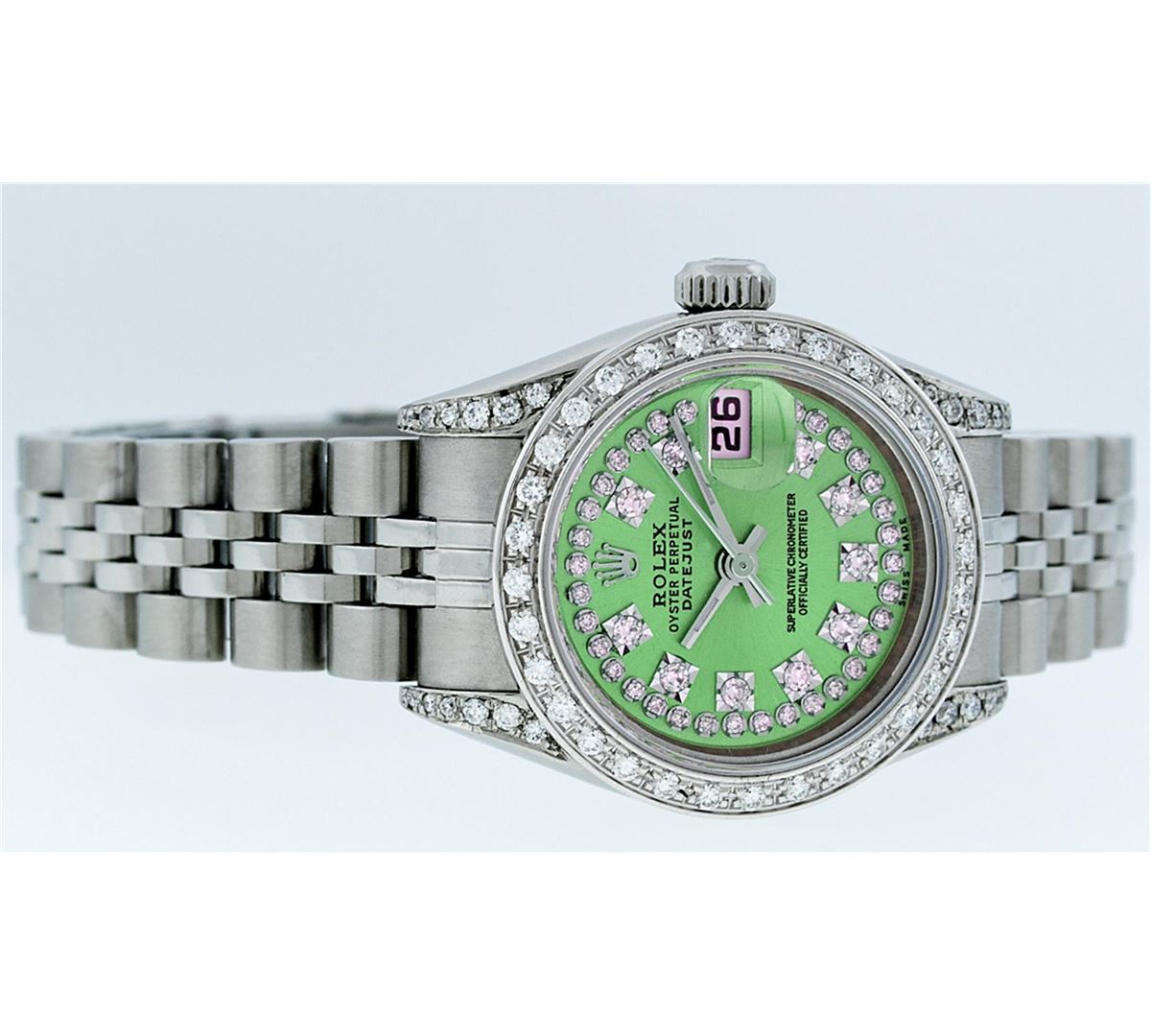 One Ladies Rolex Datejust Polished Bright with Satin Finish, Serviced & Electronically Tested, Stainless Steel Case:26mm, Stainless Steel Crown, Diamond Lugs: 16 Diamonds On Lugs, Clarity: SI-VS, Color: G to H. Custom Bezel: 18K White Gold Beadset Bezel, Diamond Count: 32 Diamonds, Total Weight 1.00 Carat, Clarity: SI-VS, Color: G to H. Custom Crystal: Synthetic Sapphire Cyclops Lens. Movement: Automatic Winding Movement Caliber 2235. Custom Dial: Refinished Green With String Diamond Dial VVS, 43 Diamonds in Dial G To H In Color, Clarity: VVS. Date Window: 3 O'clock Position Date Display, Model: No Hole Quickset Datejust. Condition: G-6 Extra Fine. Bracelet: Stainless Steel Jubilee Band. Bright Polish & Satin Finish. 6.0 Inch Length, Adjustable. Standard Clasp, With Rolex Logo. Comes with 6 month warranty.