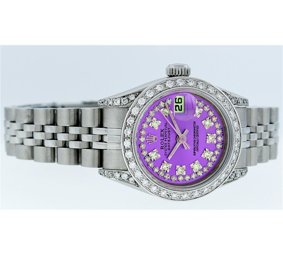 One Ladies Rolex Datejust Polished Bright with Satin Finish, Serviced & Electronically Tested, Stainless Steel Case:26mm, Stainless Steel Crown, Diamond Lugs: 16 Diamonds On Lugs, Clarity: SI-VS, Color: G to H. Custom Bezel: 18K White Gold Beadset Bezel, Diamond Count: 32 Diamonds, Total Weight 1.00 Carat, Clarity: SI-VS, Color: G to H. Custom Crystal: Synthetic Sapphire Cyclops Lens. Movement: Automatic Winding Movement Caliber 2235. Custom Dial: Refinished Purple With String Diamond Dial VVS, 43 Diamonds in Dial G To H In Color, Clarity: VVS. Date Window: 3 O'clock Position Date Display, Model: No Hole Quickset Datejust. Condition: G-6 Extra Fine. Bracelet: Stainless Steel Jubilee Band. Bright Polish & Satin Finish. 6.0 Inch Length, Adjustable. Standard Clasp, With Rolex Logo. Comes with 6 month warranty.
