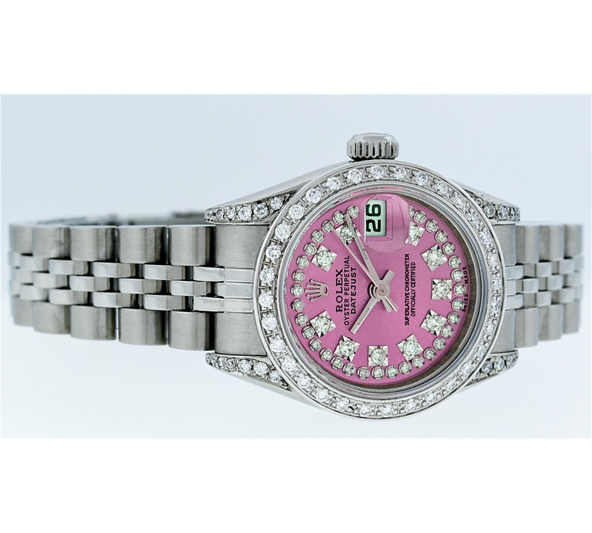 One Ladies Rolex Datejust Polished Bright with Satin Finish, Serviced & Electronically Tested, Stainless Steel Case:26mm, Stainless Steel Crown, Diamond Lugs: 16 Diamonds On Lugs, Clarity: SI-VS, Color: G to H. Custom Bezel: 18K White Gold Beadset Bezel, Diamond Count: 32 Diamonds, Total Weight 1.00 Carat, Clarity: SI-VS, Color: G to H. Custom Crystal: Synthetic Sapphire Cyclops Lens. Movement: Automatic Winding Movement Caliber 2235. Custom Dial: Refinished Pink With String Diamond Dial VVS, 43 Diamonds in Dial G To H In Color, Clarity: VVS. Date Window: 3 O'clock Position Date Display, Model: No Hole Quickset Datejust. Condition: G-6 Extra Fine. Bracelet: Stainless Steel Jubilee Band. Bright Polish & Satin Finish. 6.0 Inch Length, Adjustable. Standard Clasp, With Rolex Logo. Comes with 6 month warranty.