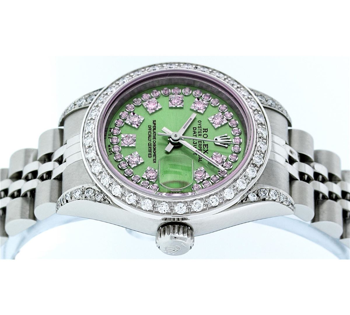 One Ladies Rolex Datejust Polished Bright with Satin Finish, Serviced & Electronically Tested, Stainless Steel Case:26mm, Stainless Steel Crown, Diamond Lugs: 16 Diamonds On Lugs, Clarity: SI-VS, Color: G to H. Custom Bezel: 18K White Gold Beadset Bezel, Diamond Count: 32 Diamonds, Total Weight 1.00 Carat, Clarity: SI-VS, Color: G to H. Custom Crystal: Synthetic Sapphire Cyclops Lens. Movement: Automatic Winding Movement Caliber 2235. Custom Dial: Refinished Green With String Diamond Dial VVS, 43 Diamonds in Dial G To H In Color, Clarity: VVS. Date Window: 3 O'clock Position Date Display, Model: No Hole Quickset Datejust. Condition: G-6 Extra Fine. Bracelet: Stainless Steel Jubilee Band. Bright Polish & Satin Finish. 6.0 Inch Length, Adjustable. Standard Clasp, With Rolex Logo. Comes with 6 month warranty.