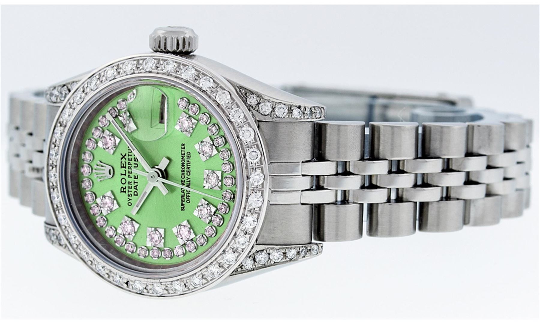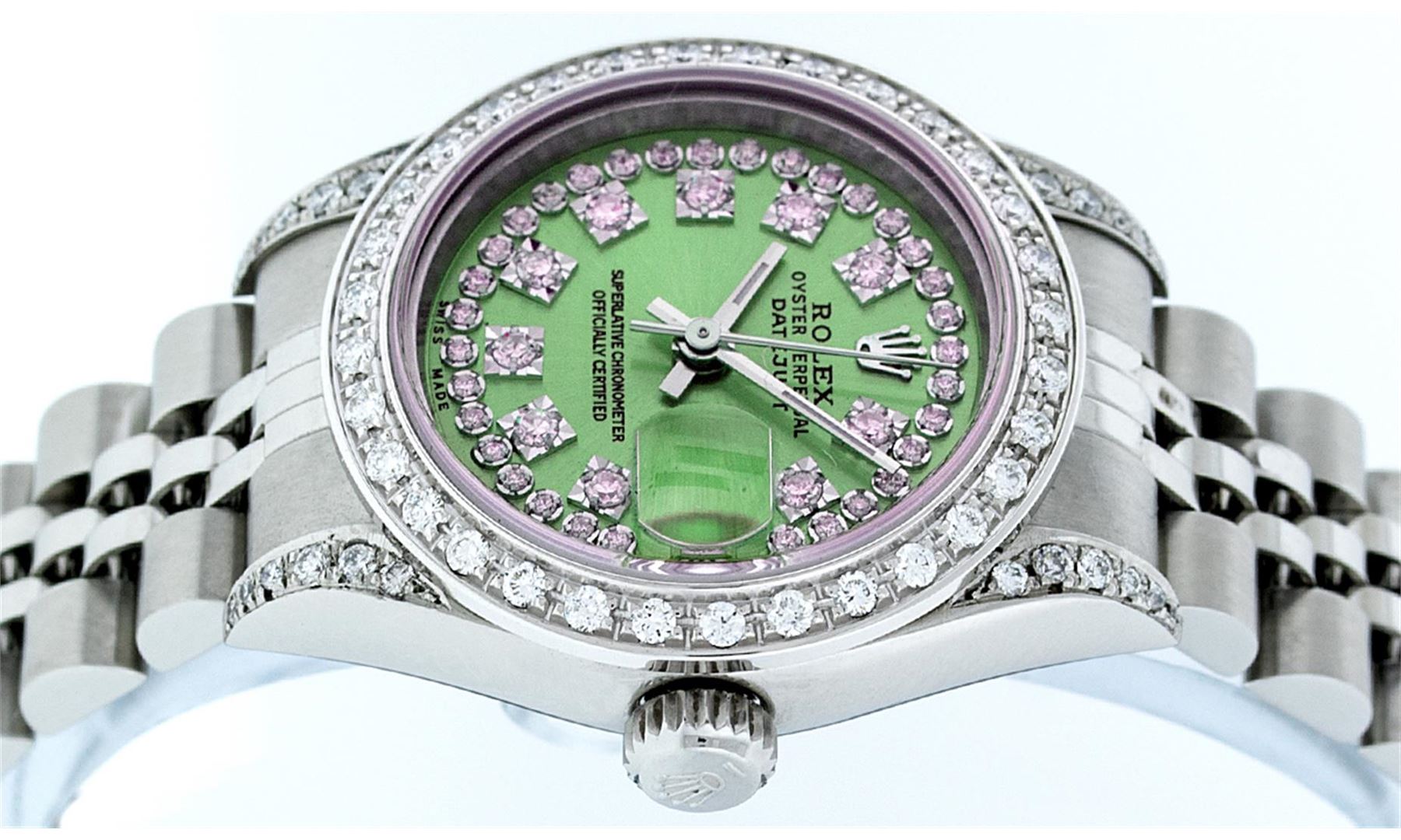 One Ladies Rolex Datejust Polished Bright with Satin Finish, Serviced & Electronically Tested, Stainless Steel Case:26mm, Stainless Steel Crown, Diamond Lugs: 16 Diamonds On Lugs, Clarity: SI-VS, Color: G to H. Custom Bezel: 18K White Gold Beadset Bezel, Diamond Count: 32 Diamonds, Total Weight 1.00 Carat, Clarity: SI-VS, Color: G to H. Custom Crystal: Synthetic Sapphire Cyclops Lens. Movement: Automatic Winding Movement Caliber 2235. Custom Dial: Refinished Green With String Diamond Dial VVS, 43 Diamonds in Dial G To H In Color, Clarity: VVS. Date Window: 3 O'clock Position Date Display, Model: No Hole Quickset Datejust. Condition: G-6 Extra Fine. Bracelet: Stainless Steel Jubilee Band. Bright Polish & Satin Finish. 6.0 Inch Length, Adjustable. Standard Clasp, With Rolex Logo. Comes with 6 month warranty.