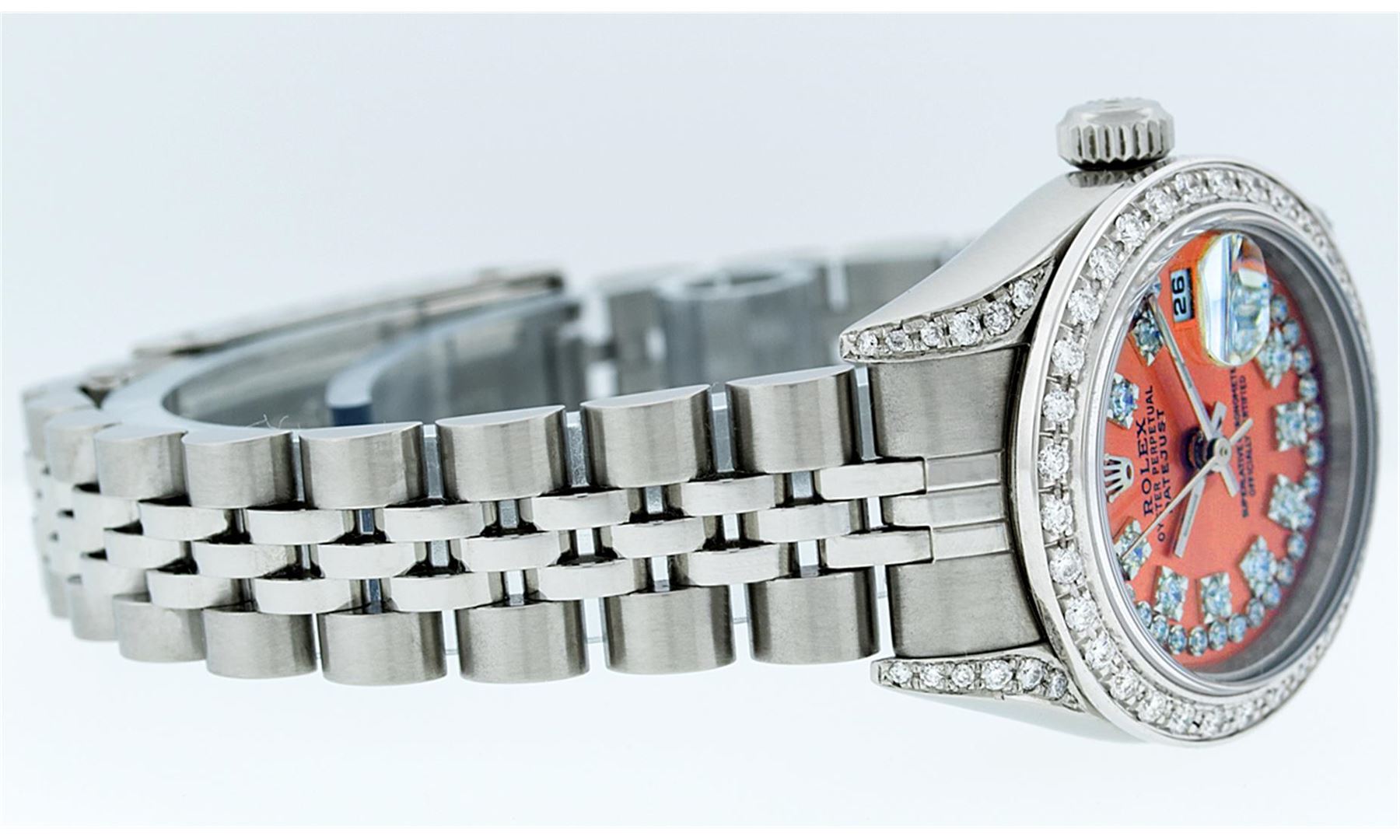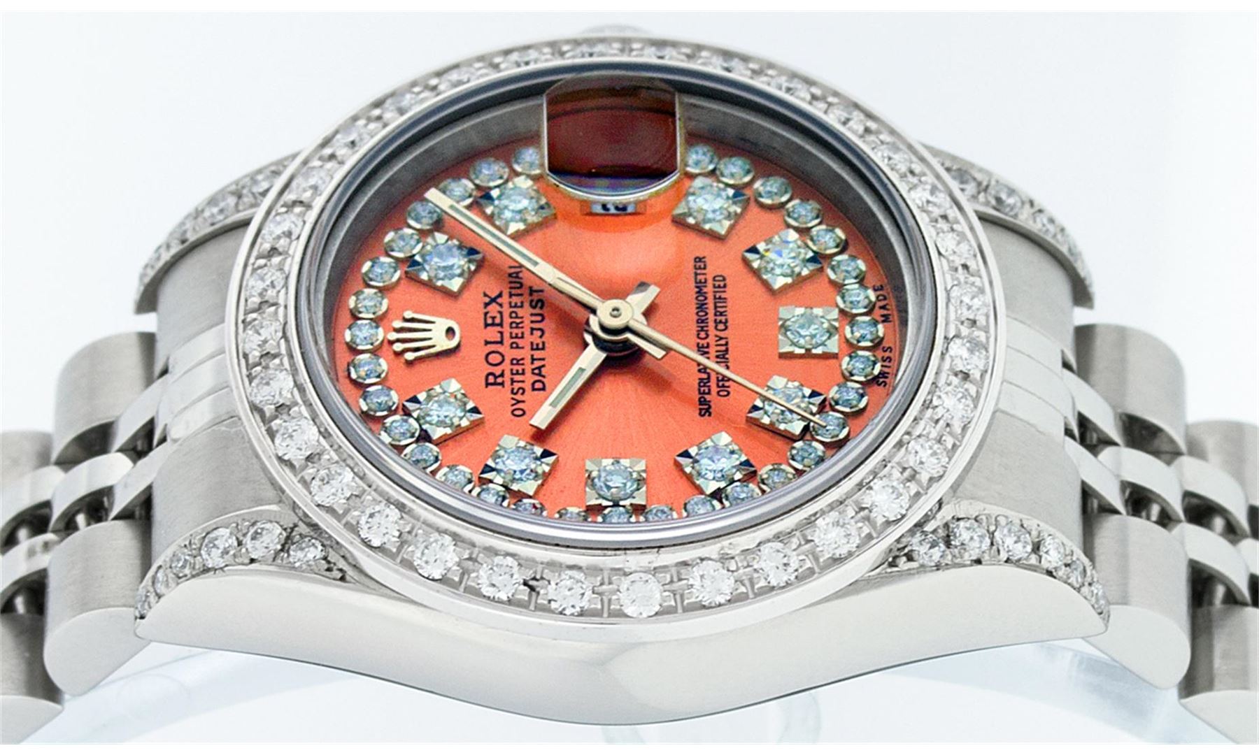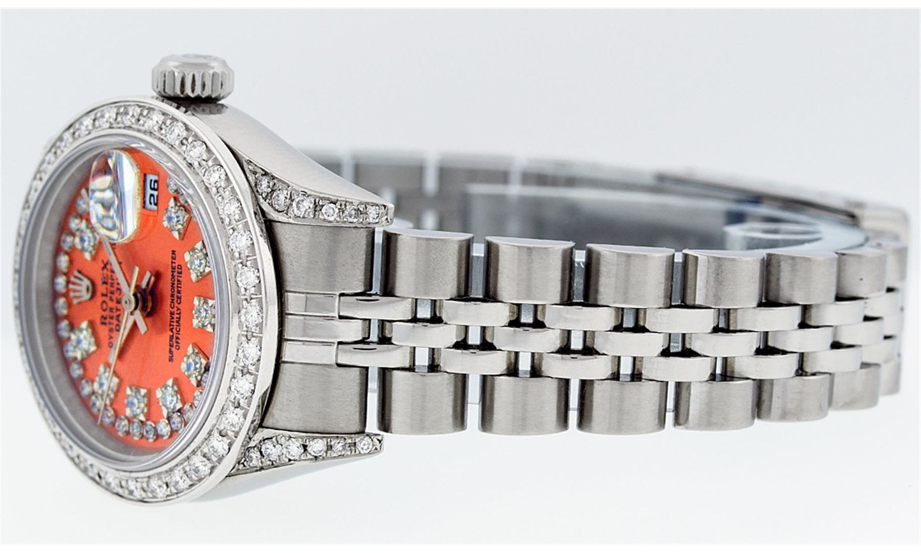 One Ladies Rolex Datejust Polished Bright with Satin Finish, Serviced & Electronically Tested, Stainless Steel Case:26mm, Stainless Steel Crown, Diamond Lugs: 16 Diamonds On Lugs, Clarity: SI-VS, Color: G to H. Custom Bezel: 18K White Gold Beadset Bezel, Diamond Count: 32 Diamonds, Total Weight 1.00 Carat, Clarity: SI-VS, Color: G to H. Custom Crystal: Synthetic Sapphire Cyclops Lens. Movement: Automatic Winding Movement Caliber 2235. Custom Dial: Refinished Orange With String Diamond Dial VVS, 43 Diamonds in Dial G To H In Color, Clarity: VVS. Date Window: 3 O'clock Position Date Display, Model: No Hole Datejust Quickset. Condition: G-6 Extra Fine. Bracelet: Stainless Steel Jubilee Band. Bright Polish & Satin Finish. 6.0 Inch Length, Adjustable. Standard Clasp, With Rolex Logo. Comes with 6 month warranty.