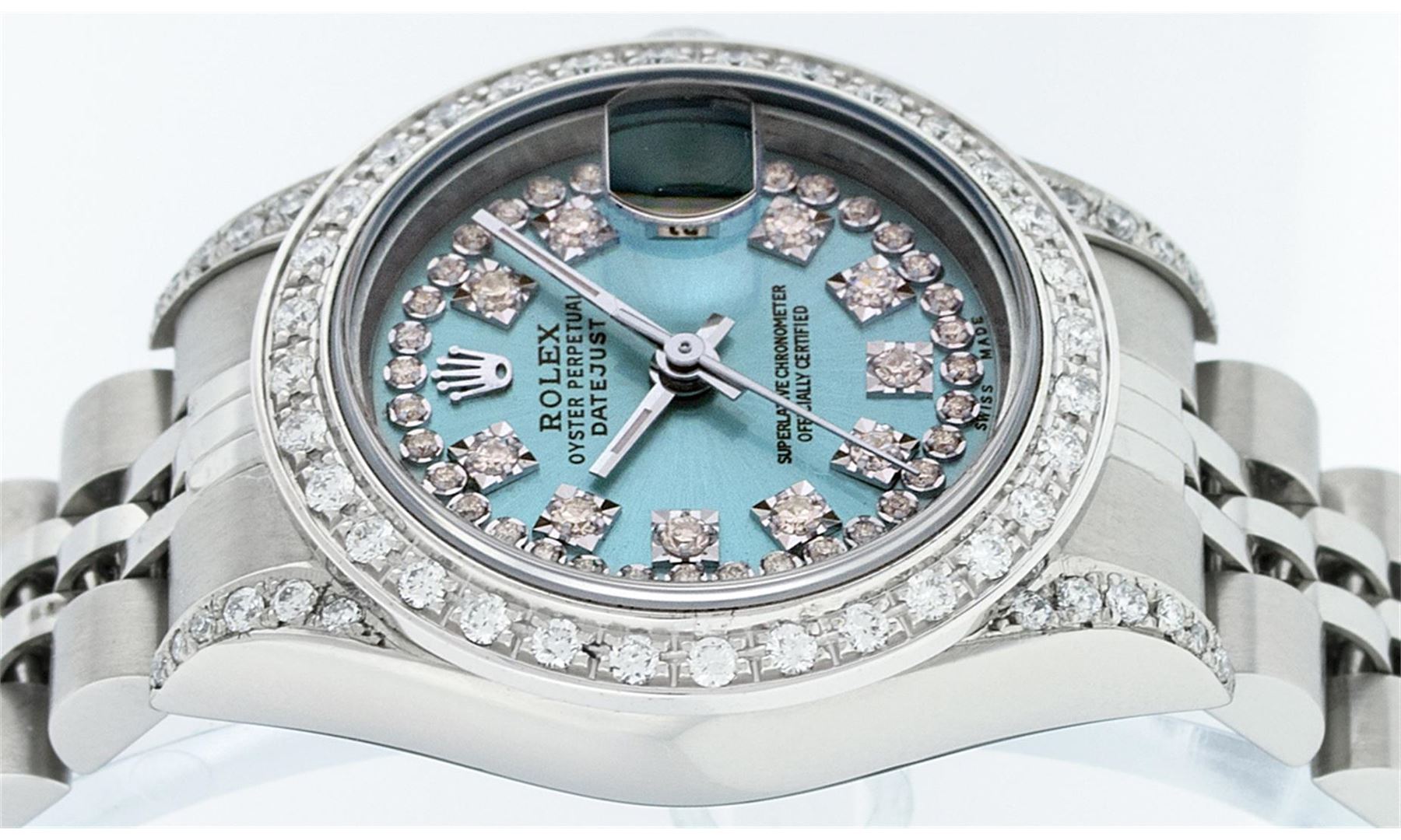 One Ladies Rolex Datejust Polished Bright with Satin Finish, Serviced & Electronically Tested, Stainless Steel Case:26mm, Stainless Steel Crown, Diamond Lugs: 16 Diamonds On Lugs, Clarity: SI-VS, Color: G to H. Custom Bezel: 18K White Gold Beadset Bezel, Diamond Count: 32 Diamonds, Total Weight 1.00 Carat, Clarity: SI-VS, Color: G to H. Custom Crystal: Synthetic Sapphire Cyclops Lens. Movement: Automatic Winding Movement Caliber 2235. Custom Dial: Refinished Sky Blue With String Diamond Dial VVS, 43 Diamonds in Dial G To H In Color, Clarity: VVS. Date Window: 3 O'clock Position Date Display, Model: No Hole Datejust Quickset. Condition: G-6 Extra Fine. Bracelet: Stainless Steel Jubilee Band. Bright Polish & Satin Finish. 6.0 Inch Length, Adjustable. Standard Clasp, With Rolex Logo. Comes with 6 month warranty.