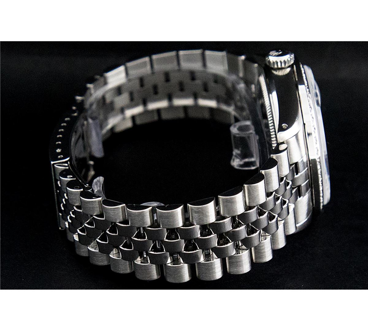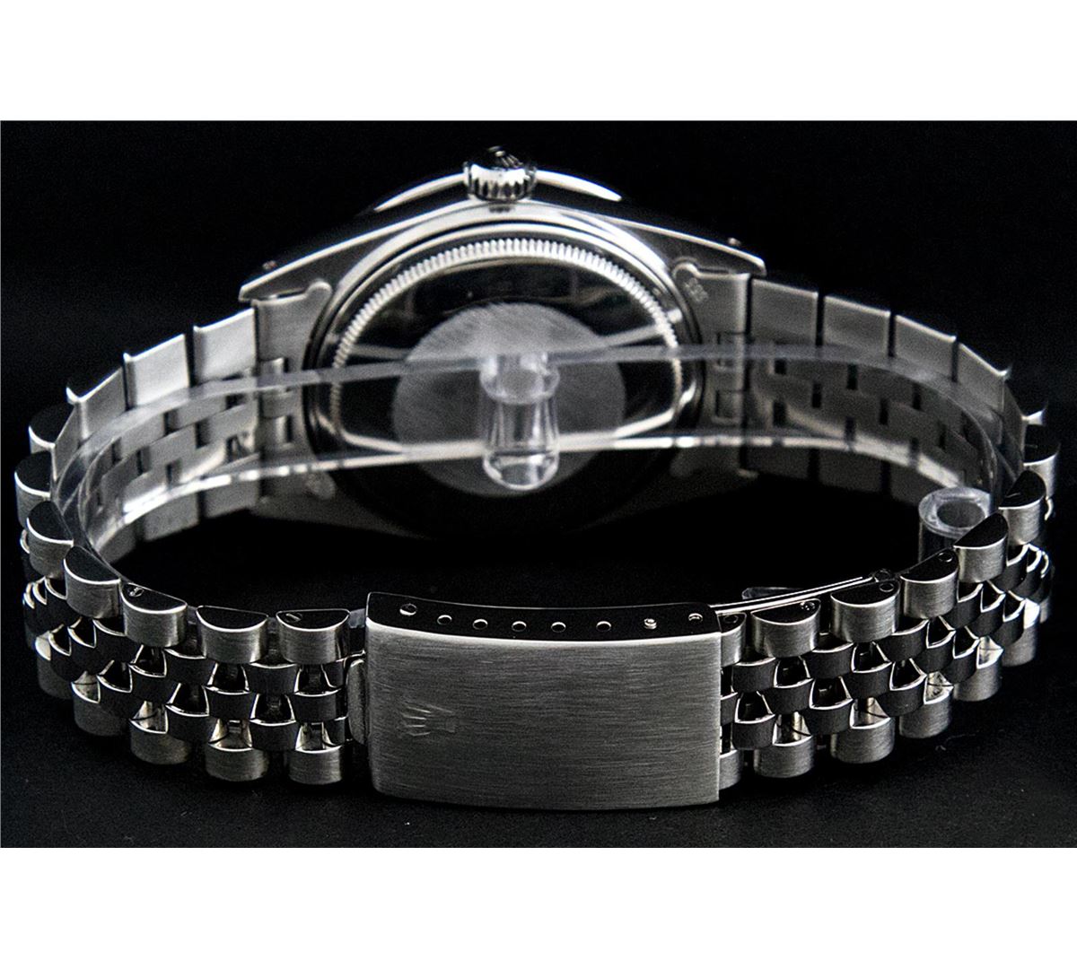 One Gents Rolex Datejust Polished, Serviced & Electronically Tested, Stainless Steel Case:36mm, Stainless Steel Crown, Custom Bezel: Stainless Steel Beadset Diamond Bezel, Diamond Count: 54 Diamonds. Total Weight .90 Carat, Clarity: SI-VS, Color: G to H. Custom Crystal: Synthetic Sapphire Cyclops Lens. Movement: Automatic Winding Movement Caliber 3035. Custom Dial: Black String Diamond Dial, Diamond Count: 58 Diamond In Dial G To H In Color, Clarity: VVS. Date Window: 3 O'Clock Position Date Display, Quickset, Model: 16014 Condition: G-6 Extra Fine. Bracelet: Stainless Steel Jubilee. Bright Polish & Satin Finish. 7.0 Inch Length, Adjustable. Standard Clasp, With Rolex Logo.