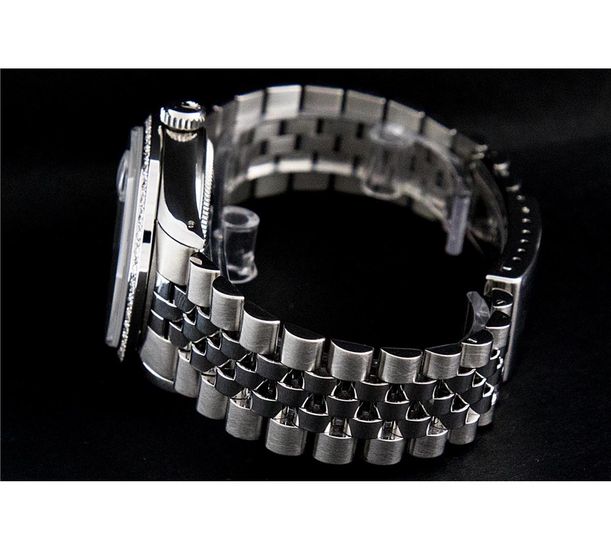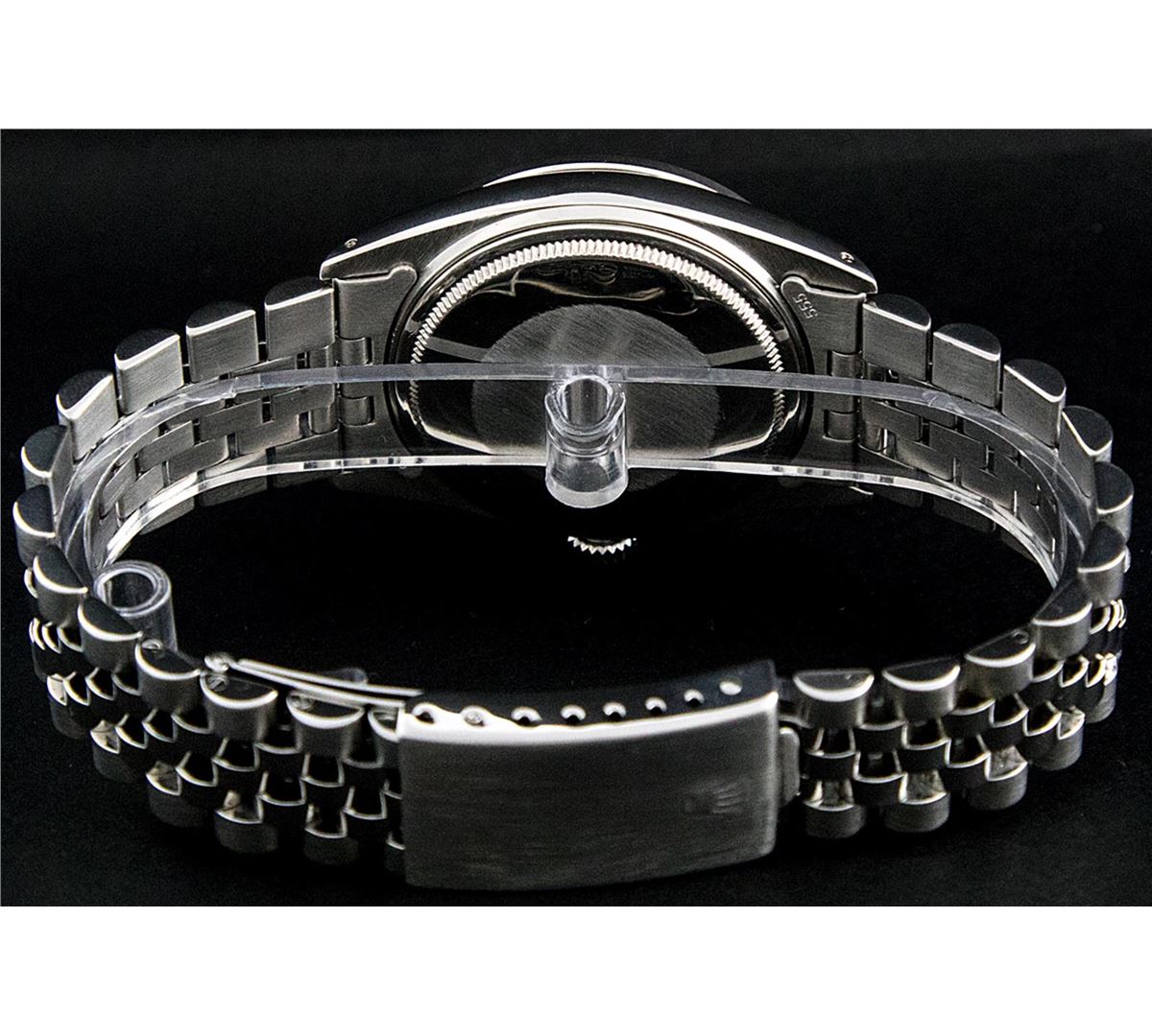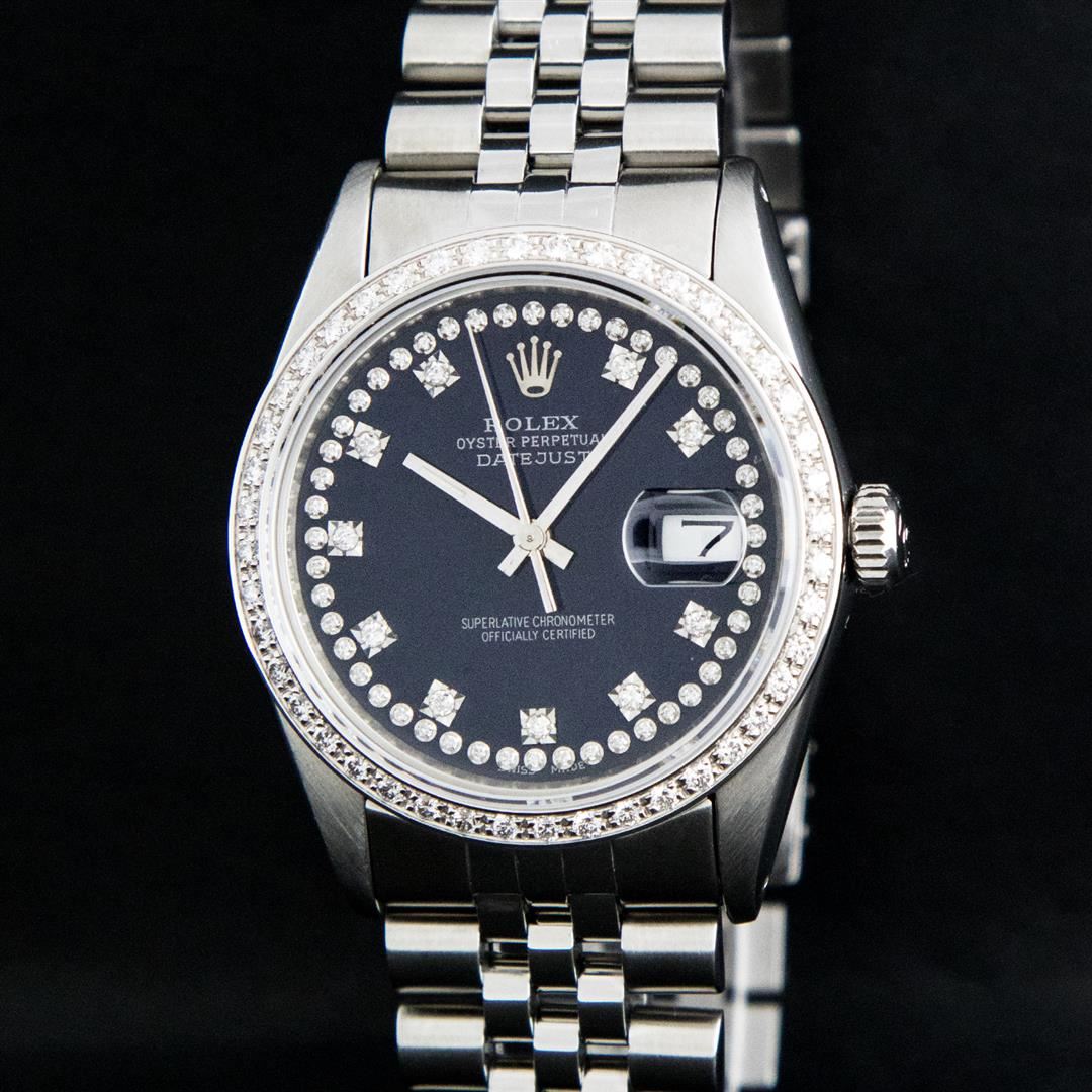 One Gents Rolex Datejust Polished, Serviced & Electronically Tested, Stainless Steel Case:36mm, Stainless Steel Crown, Custom Bezel: Stainless Steel Beadset Diamond Bezel, Diamond Count: 54 Diamonds. Total Weight .90 Carat, Clarity: SI-VS, Color: G to H. Custom Crystal: Synthetic Sapphire Cyclops Lens. Movement: Automatic Winding Movement Caliber 3035. Custom Dial: Black String Diamond Dial, Diamond Count: 58 Diamond In Dial G To H In Color, Clarity: VVS. Date Window: 3 O'Clock Position Date Display, Quickset, Model: 16014 Condition: G-6 Extra Fine. Bracelet: Stainless Steel Jubilee. Bright Polish & Satin Finish. 7.0 Inch Length, Adjustable. Standard Clasp, With Rolex Logo.