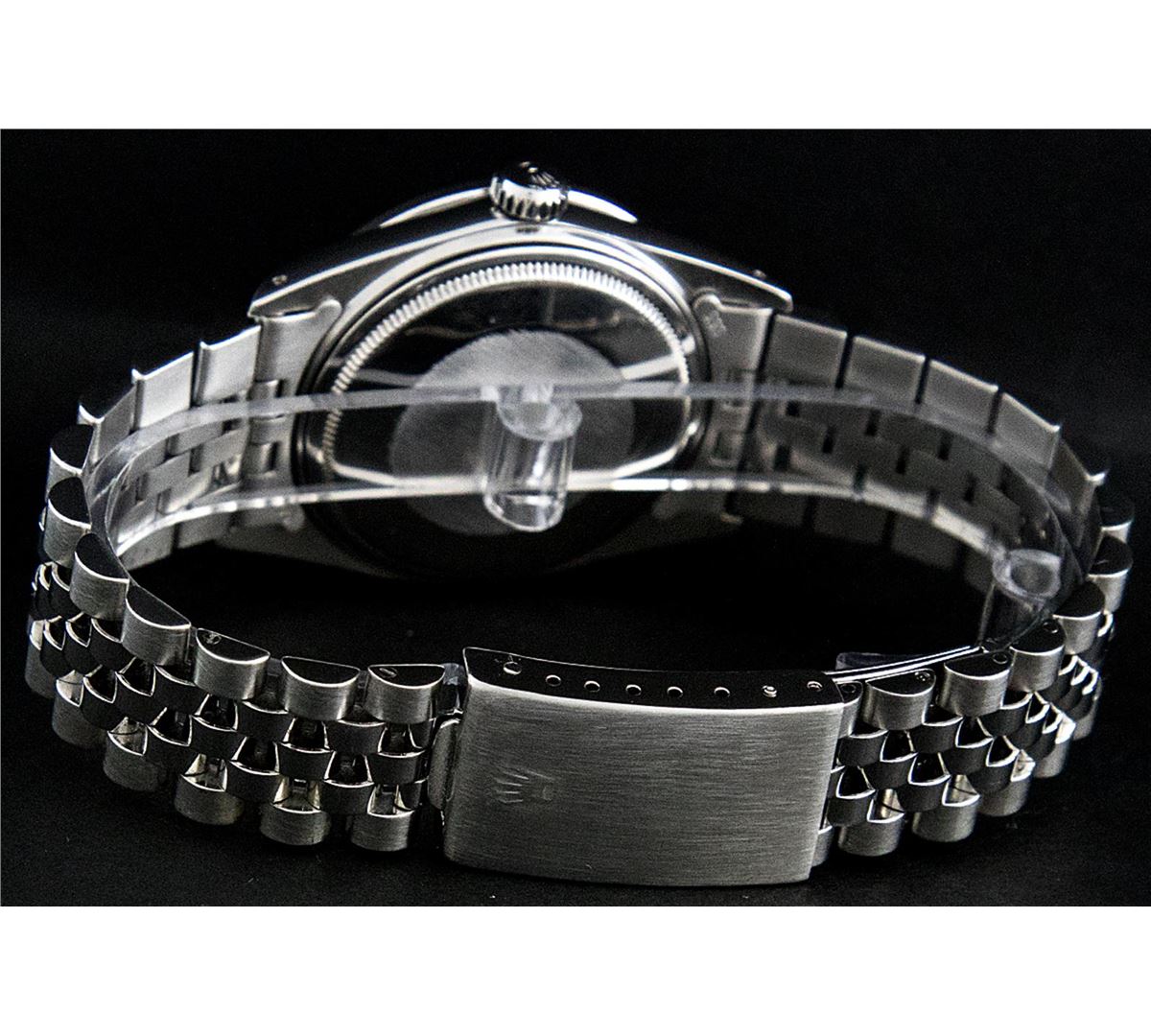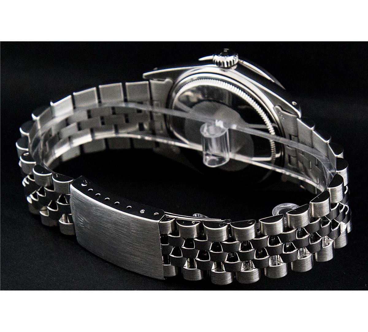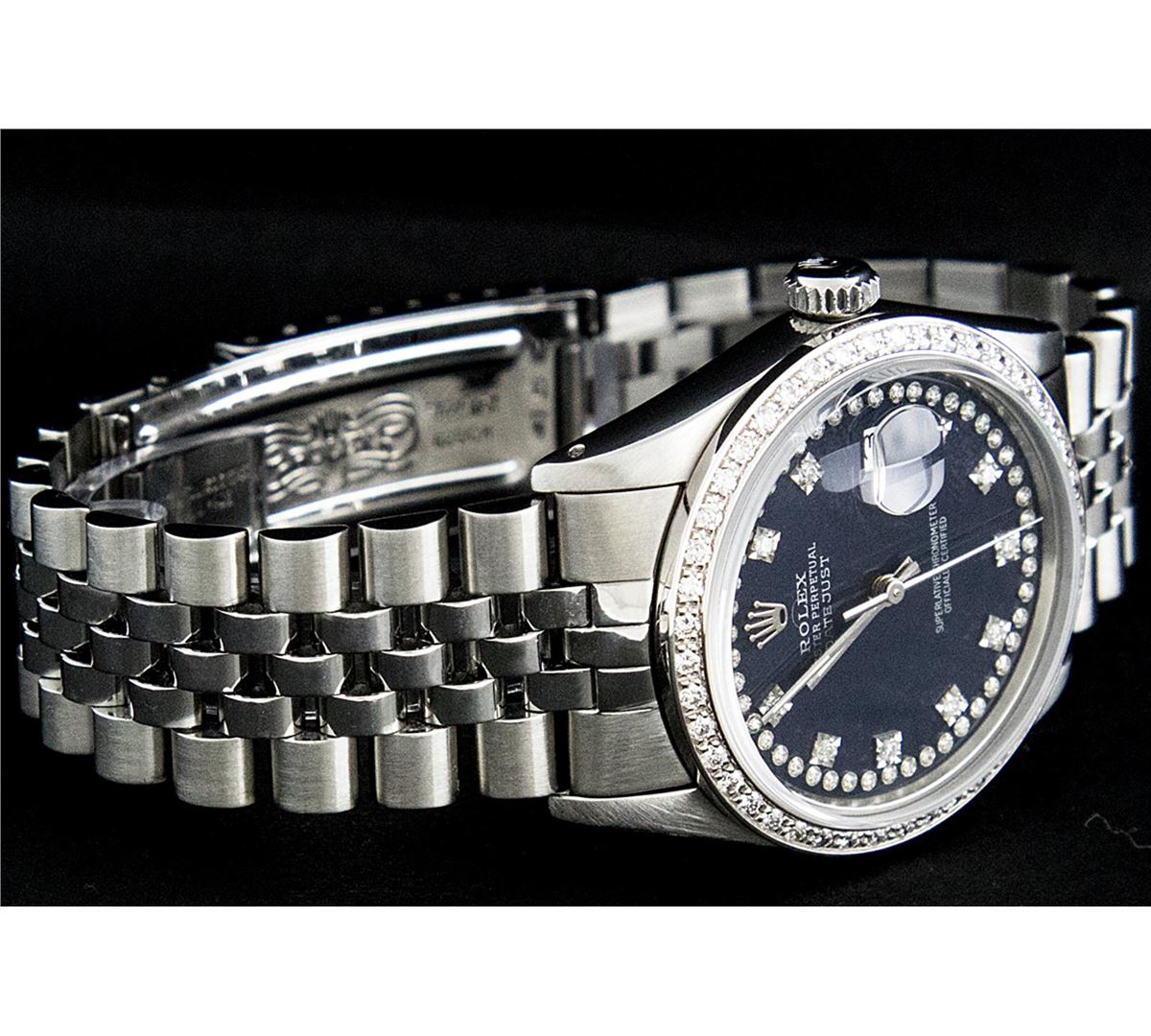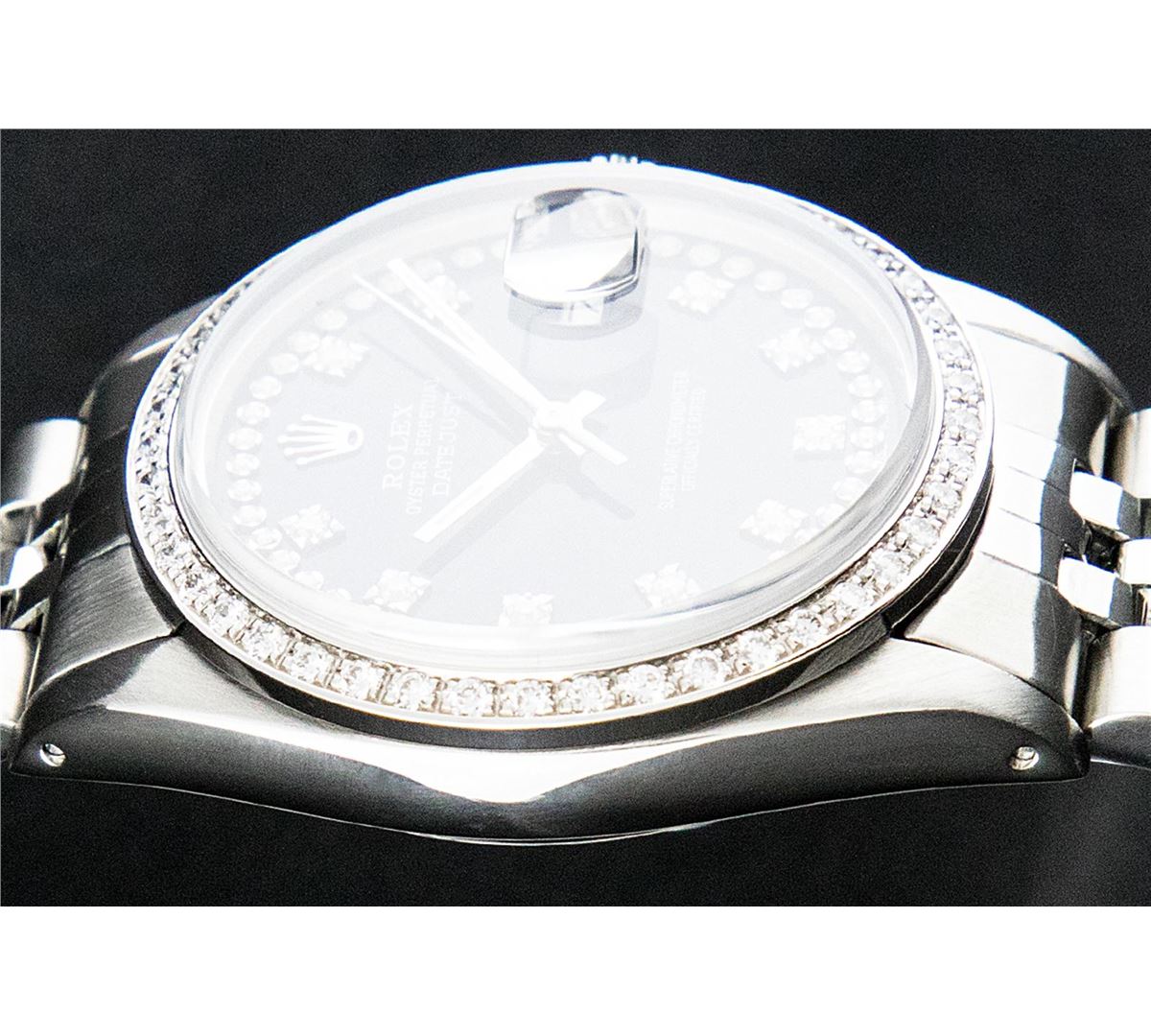 One Gents Rolex Datejust Polished, Serviced & Electronically Tested, Stainless Steel Case:36mm, Stainless Steel Crown, Custom Bezel: Stainless Steel Beadset Diamond Bezel, Diamond Count: 54 Diamonds. Total Weight .90 Carat, Clarity: SI-VS, Color: G to H. Custom Crystal: Synthetic Sapphire Cyclops Lens. Movement: Automatic Winding Movement Caliber 3035. Custom Dial: Black String Diamond Dial, Diamond Count: 58 Diamond In Dial G To H In Color, Clarity: VVS. Date Window: 3 O'Clock Position Date Display, Quickset, Model: 16014 Condition: G-6 Extra Fine. Bracelet: Stainless Steel Jubilee. Bright Polish & Satin Finish. 7.0 Inch Length, Adjustable. Standard Clasp, With Rolex Logo.