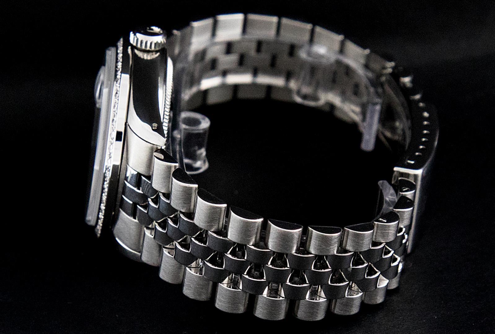 One Gents Rolex Datejust Polished, Serviced & Electronically Tested, Stainless Steel Case:36mm, Stainless Steel Crown, Custom Bezel: Stainless Steel Beadset Diamond Bezel, Diamond Count: 54 Diamonds. Total Weight .90 Carat, Clarity: SI-VS, Color: G to H. Custom Crystal: Synthetic Sapphire Cyclops Lens. Movement: Automatic Winding Movement Caliber 3035. Custom Dial: Black String Diamond Dial, Diamond Count: 58 Diamond In Dial G To H In Color, Clarity: VVS. Date Window: 3 O'Clock Position Date Display, Quickset, Model: 16014 Condition: G-6 Extra Fine. Bracelet: Stainless Steel Jubilee. Bright Polish & Satin Finish. 7.0 Inch Length, Adjustable. Standard Clasp, With Rolex Logo.
