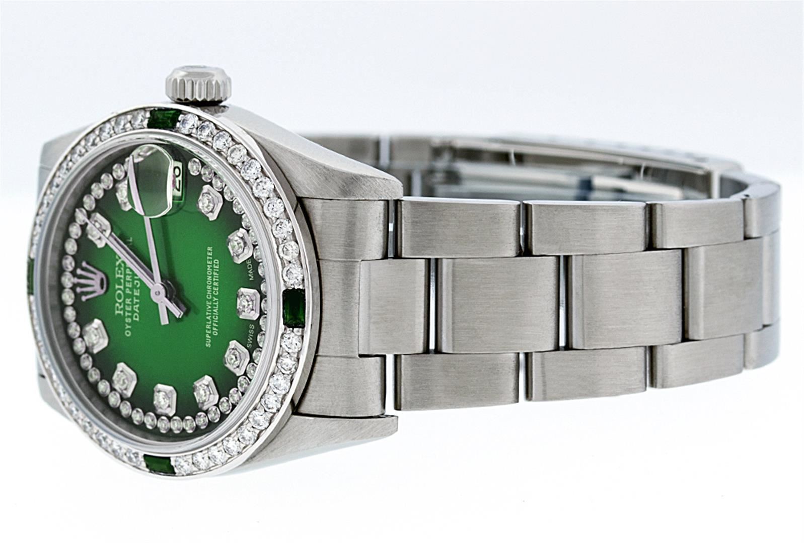 One Midsize Rolex Datejust Polished Bright with Satin Finish, Serviced & Electronically Tested, Stainless Steel Case:31mm, Stainless Steel Crown, Custom Bezel: 18K White Gold Beadset Emerald Beadset Bezel, Diamond Count: 4 Emeralds + 28 Diamonds, Total Weight .70 Carat, Clarity: SI-VS, Color: G to H. Custom Crystal: Synthetic Sapphire Cyclops Lens. Movement: Automatic Winding Movement Caliber 2235. Custom Dial: Refinished Green Vignette String Diamond Dial VVS, 43 Diamonds in Dial G To H In Color, Clarity: VVS. Date Window: 3 O'clock Position Date Display, Model: No Hole Datejust Quickset. Condition: G-6 Extra Fine. Bracelet: Stainless Steel Oyster Band. Bright Polish & Satin Finish. 6.0 Inch Length, Adjustable. Standard Clasp, With Rolex Logo. Comes with 6 month warranty.