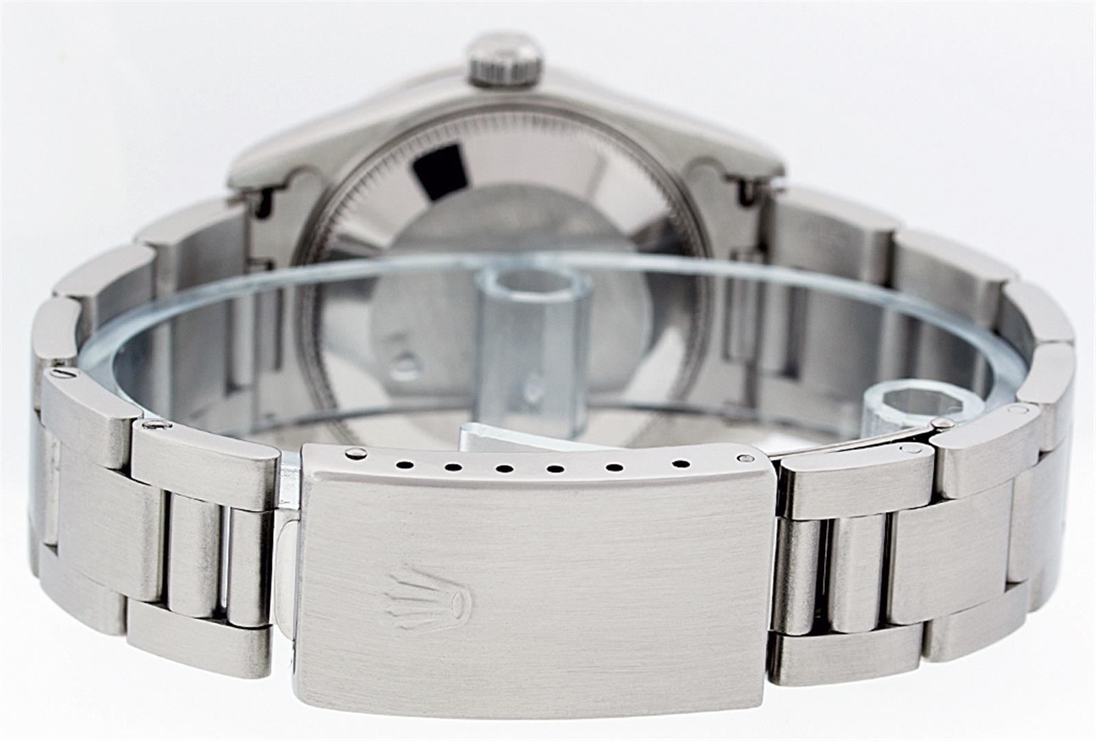 One Midsize Rolex Datejust Polished Bright with Satin Finish, Serviced & Electronically Tested, Stainless Steel Case:31mm, Stainless Steel Crown, Custom Bezel: 18K White Gold Beadset Emerald Beadset Bezel, Diamond Count: 4 Emeralds + 28 Diamonds, Total Weight .70 Carat, Clarity: SI-VS, Color: G to H. Custom Crystal: Synthetic Sapphire Cyclops Lens. Movement: Automatic Winding Movement Caliber 2235. Custom Dial: Refinished Black String Diamond Dial VVS, 43 Diamonds in Dial G To H In Color, Clarity: VVS. Date Window: 3 O'clock Position Date Display, Model: No Hole Datejust Quickset. Condition: G-6 Extra Fine. Bracelet: Stainless Steel Oyster Band. Bright Polish & Satin Finish. 6.0 Inch Length, Adjustable. Standard Clasp, With Rolex Logo. Comes with 6 month warranty.