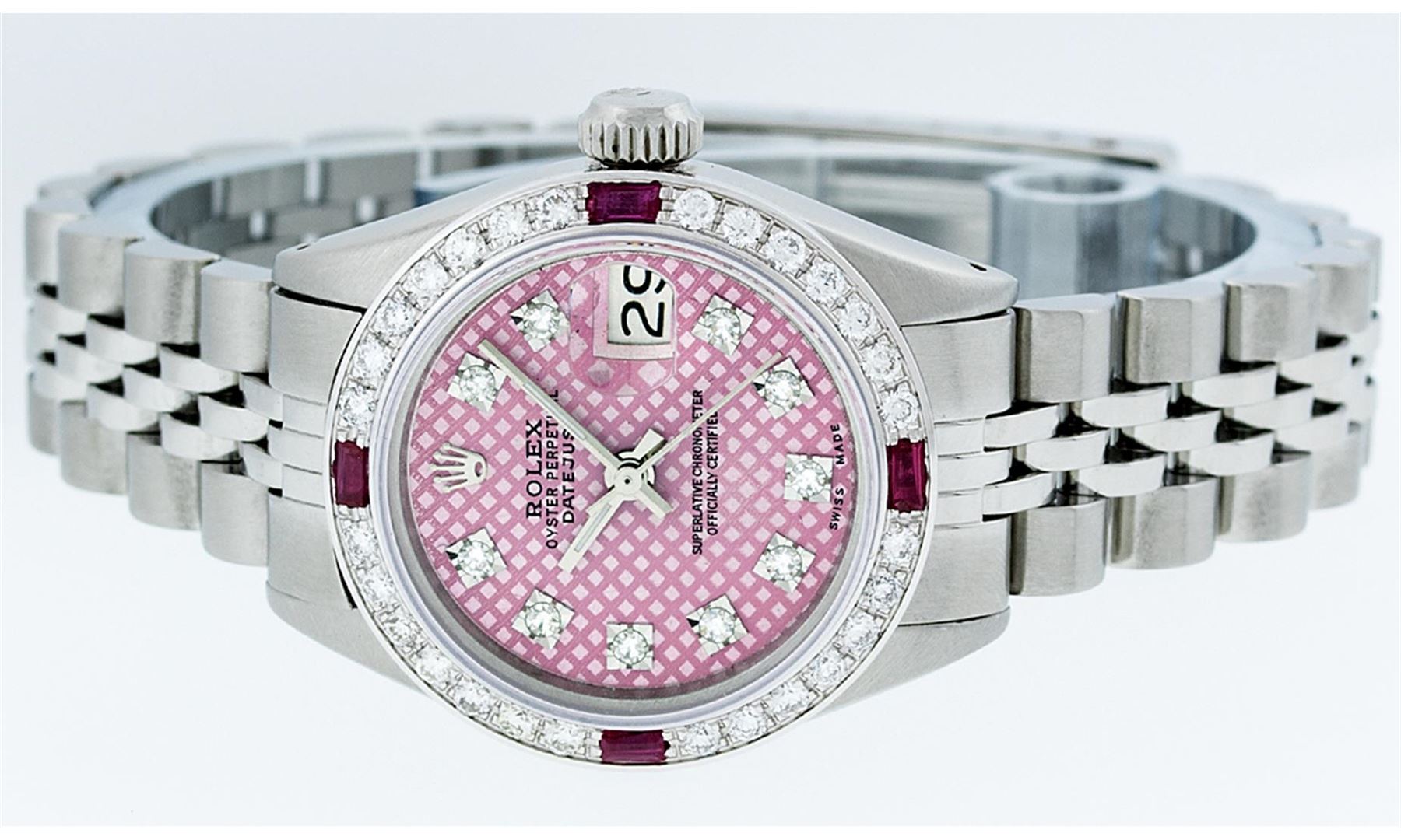 Ladies Rolex Datejust Polished Bright with Satin Finish, Serviced & Electronically Tested, Stainless Steel Case:26mm, Stainless Steel Crown, Custom Bezel: 18K White Gold Ruby Beadset Diamond Bezel, Diamond + Gem Count: 28 Diamonds + 4 Rubies. Total Weight .70 Carat, Clarity: SI-VS, Color: G to H. Custom Crystal: Synthetic Sapphire Cyclops Lens. Movement: Automatic Winding Movement Caliber 2030. Custom Dial: Refinished Pink With VVS Diamond Hour Markers. Diamond Count: 10 Diamonds, Color: G To H, Clarity: VVS. Date Window: 3 O'clock Position Date Display, Model: Datejust. Condition: G-6 Extra Fine. Bracelet: Stainless Steel Jubilee. Bright Polish & Satin Finish. 6.0 Inch Length, Adjustable. Standard Clasp, With Rolex Logo. Comes with 6 month warranty.