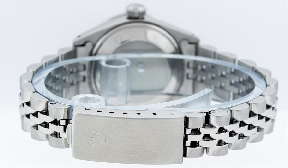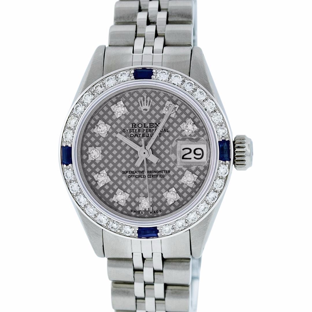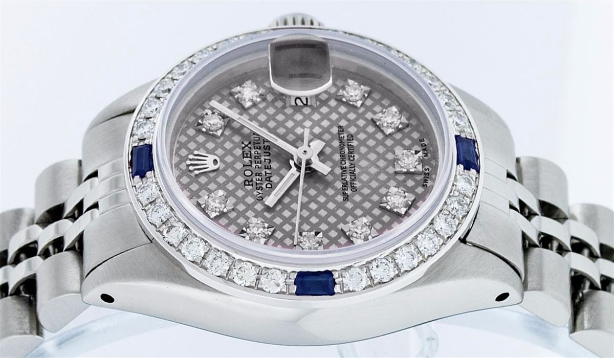 Ladies Rolex Datejust Polished Bright with Satin Finish, Serviced & Electronically Tested, Stainless Steel Case:26mm, Stainless Steel Crown, Custom Bezel: 18K White Gold Sapphire Beadset Diamond Bezel, Diamond + Gem Count: 28 Diamonds + 4 Sapphires. Total Weight .70 Carat, Clarity: SI-VS, Color: G to H. Custom Crystal: Synthetic Sapphire Cyclops Lens. Movement: Automatic Winding Movement Caliber 2030. Custom Dial: Refinished Slate Grey With VVS Diamond Hour Markers. Diamond Count: 10 Diamonds, Color: G To H, Clarity: VVS. Date Window: 3 O'clock Position Date Display, Model: Datejust. Condition: G-6 Extra Fine. Bracelet: Stainless Steel Jubilee. Bright Polish & Satin Finish. 6.0 Inch Length, Adjustable. Standard Clasp, With Rolex Logo. Comes with 6 month warranty.