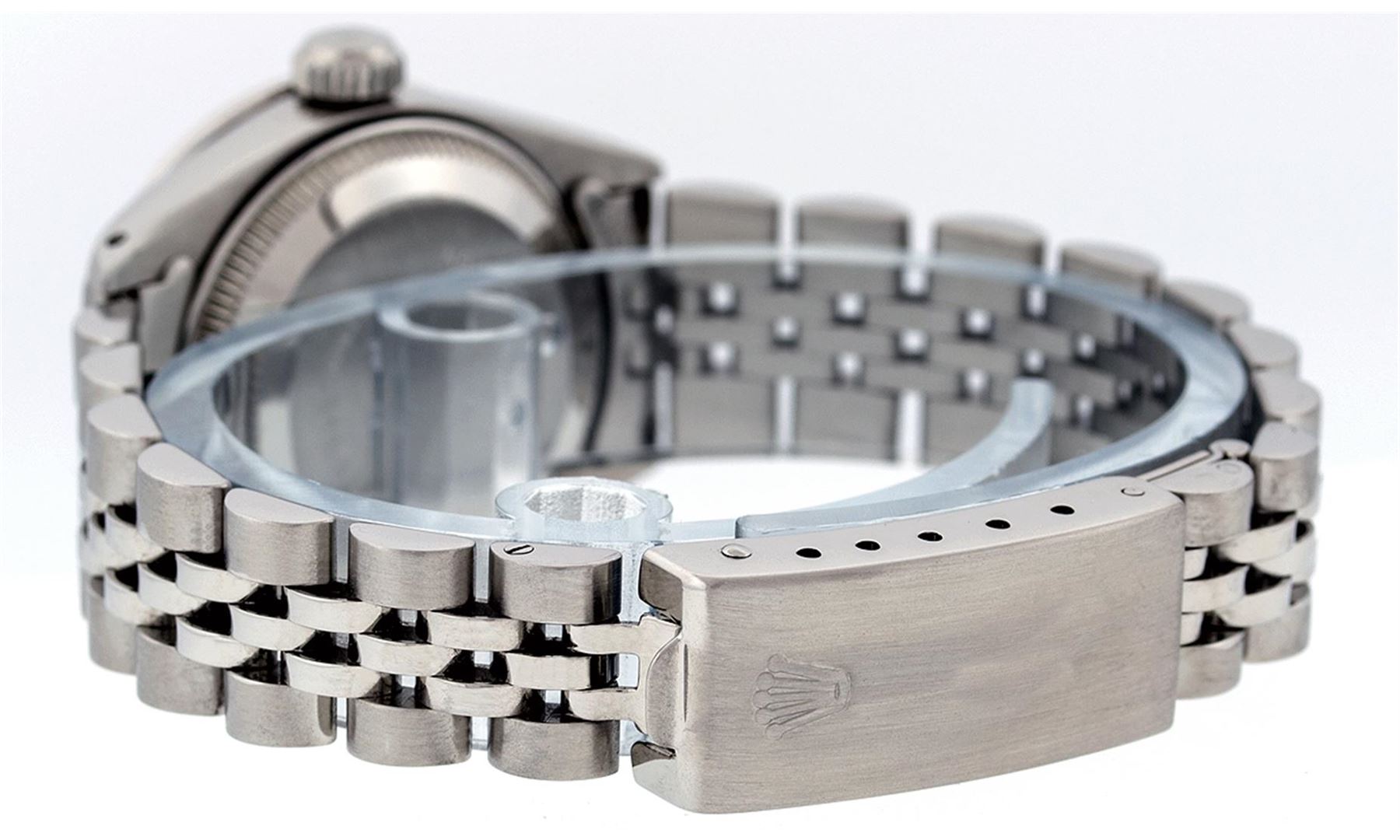 Ladies Rolex Datejust Polished Bright with Satin Finish, Serviced & Electronically Tested, Stainless Steel Case:26mm, Stainless Steel Crown, Custom Bezel: 18K White Gold Sapphire Beadset Diamond Bezel, Diamond + Gem Count: 28 Diamonds + 4 Sapphires. Total Weight .70 Carat, Clarity: SI-VS, Color: G to H. Custom Crystal: Synthetic Sapphire Cyclops Lens. Movement: Automatic Winding Movement Caliber 2030. Custom Dial: Refinished Slate Grey With VVS Diamond Hour Markers. Diamond Count: 10 Diamonds, Color: G To H, Clarity: VVS. Date Window: 3 O'clock Position Date Display, Model: Datejust. Condition: G-6 Extra Fine. Bracelet: Stainless Steel Jubilee. Bright Polish & Satin Finish. 6.0 Inch Length, Adjustable. Standard Clasp, With Rolex Logo. Comes with 6 month warranty.