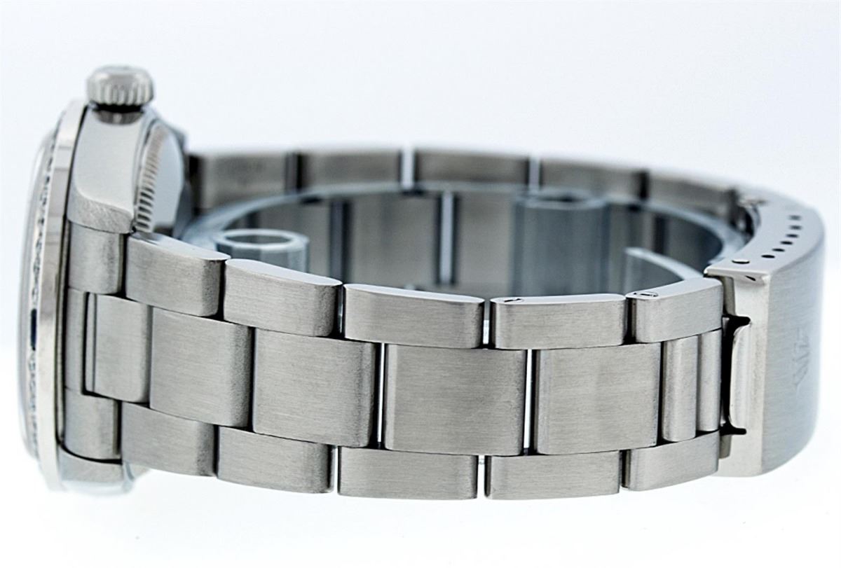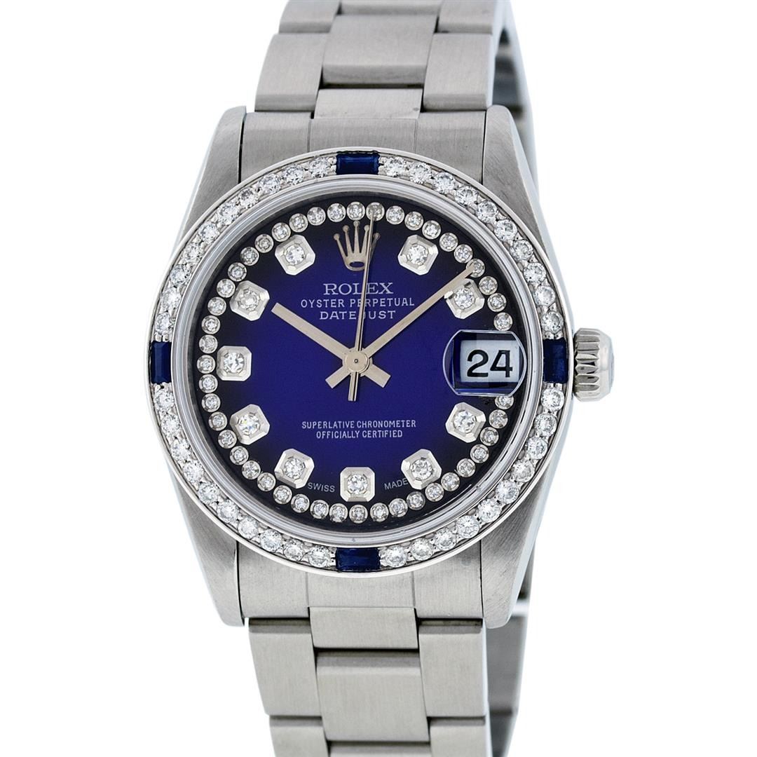 One Midsize Rolex Datejust Polished Bright with Satin Finish, Serviced & Electronically Tested, Stainless Steel Case:31mm, Stainless Steel Crown, Custom Bezel: 18K White Gold Beadset Sapphire Beadset Bezel, Diamond Count: 4 Sapphires + 28 Diamonds, Total Weight .70 Carat, Clarity: SI-VS, Color: G to H. Custom Crystal: Synthetic Sapphire Cyclops Lens. Movement: Automatic Winding Movement Caliber 2235. Custom Dial: Refinished Blue Vignette With String Diamond Dial VVS, 43 Diamonds in Dial G To H In Color, Clarity: VVS. Date Window: 3 O'clock Position Date Display, Model: No Hole Datejust Quickset. Condition: G-6 Extra Fine. Bracelet: Stainless Steel Oyster Band. Bright Polish & Satin Finish. 6.0 Inch Length, Adjustable. Standard Clasp, With Rolex Logo. Comes with 6 month warranty.