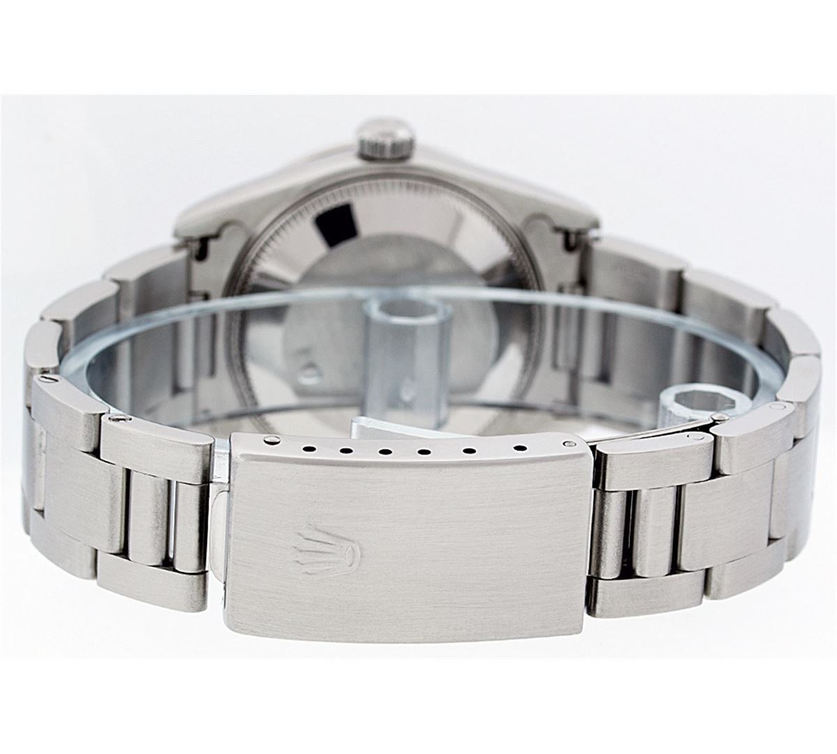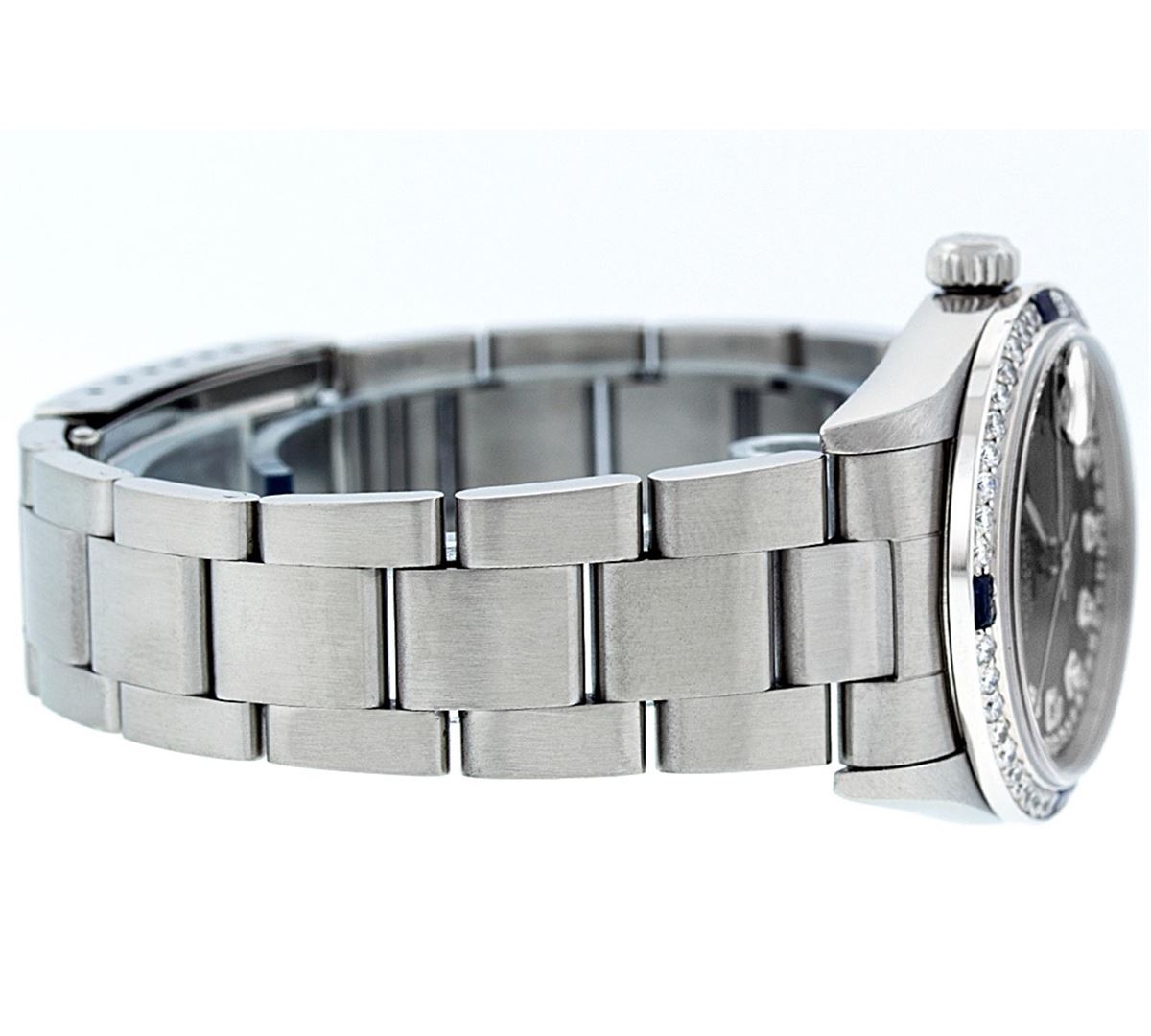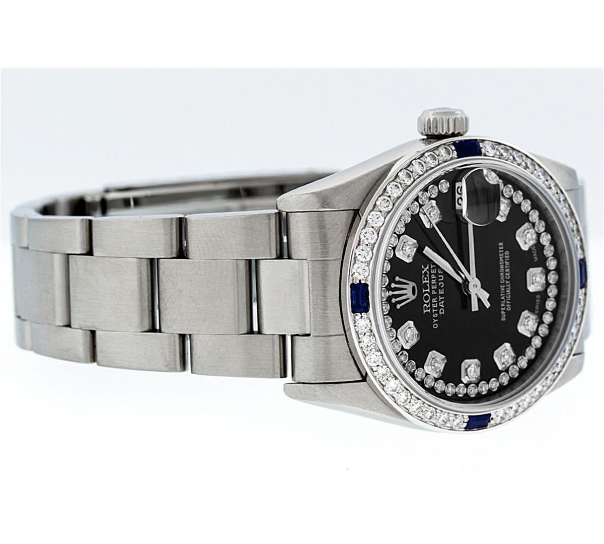 One Midsize Rolex Datejust Polished Bright with Satin Finish, Serviced & Electronically Tested, Stainless Steel Case:26mm, Stainless Steel Crown, Custom Bezel: 18K White Gold Beadset Sapphire Beadset Bezel, Diamond Count: 4 Sapphire + 28 Diamonds, Total Weight .70 Carat, Clarity: SI-VS, Color: G to H. Custom Crystal: Synthetic Sapphire Cyclops Lens. Movement: Automatic Winding Movement Caliber 2235. Custom Dial: Refinished Black String Diamond Dial VVS, 43 Diamonds in Dial G To H In Color, Clarity: VVS. Date Window: 3 O'clock Position Date Display, Model: No Hole Datejust Quickset. Condition: G-6 Extra Fine. Bracelet: Stainless Steel Oyster Band. Bright Polish & Satin Finish. 6.0 Inch Length, Adjustable. Standard Clasp, With Rolex Logo. Comes with 6 month warranty.