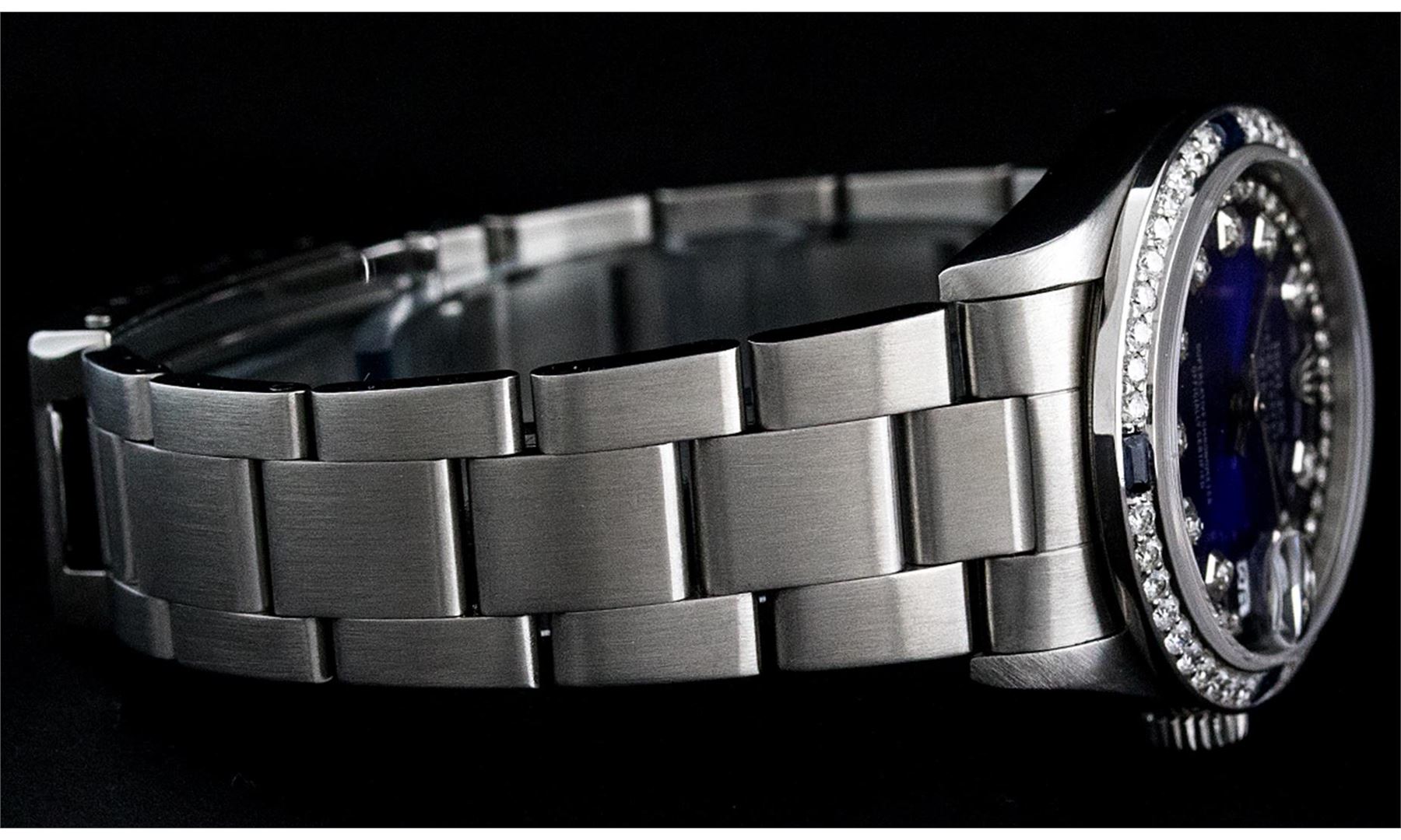 One Midsize Stainless Steel Rolex Datejust Polished, Serviced & Electronically Tested, Stainless Steel Case Case:31mm, Stainless Steel Crown, Custom Bezel: 18K White Gold Sapphire Beadset Bezel, Diamond Count: 40 Diamonds + 4 Sapphires, Color: G To H, Clarity: VS2-SI1. Custom Crystal: Synthetic Sapphire Cyclops Lens. Movement: Automatic Winding Movement Caliber 2135. Custom Dial: Blue Vignette String Diamond Dial VVS. Color: G to H, Clarity: VS2-SI1, Date Window: 3 O'Clock Position Date Display, Quickset, Model: Midsize Datejust. Condition: G-6 Extra Fine. Bracelet: Stainless Steel Oyster Band. Bright Polish. 6.0 Inch Length, Adjustable. Standard Clasp, With Rolex Logo. Comes with 6 month warranty.