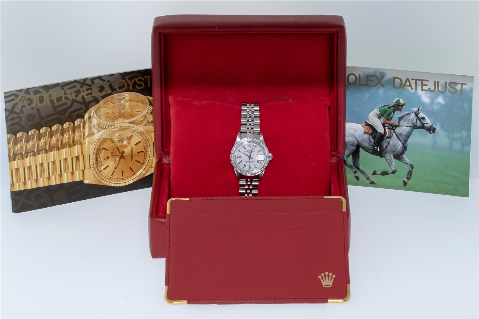One Ladies Pre Owned Stainless Steel Rolex Datejust Polished Bright with Satin Finish, Serviced & Electronically Tested, Stainless Steel Case: 26mm, Stainless Steel Crown, Custom Bezel: New 18K White Gold Beadset Diamond Bezel, Diamond Count: 32 Diamonds, Total Weight .70 Carat, Clarity: SI-VS, Color: G to H. Custom Crystal: New Sapphire With Magnified Date Window. Custom Hands: New Luminescent Hands. Rolex Movement: Automatic Winding Movement. Rolex Dial: Factory White Roman Dial With Index Hour Markers And Lumi Dots. Date Window: 3 O'Clock Position Date Display, Model: Datejust. Condition: G-6 Extra Fine. Rolex Bracelet: Stainless Steel Jubilee Band. Bright Polish & Satin Finish. 6.0 Inch Length, Adjustable. Standard Clasp, With Rolex Logo. This Watch Has Been Serviced Time Tested And Is In Excellent Condition It Is Free Of All Scratches And Dents. This Watch Comes With A Rolex Box, 2 Booklets, And A Red Leather Wallet.
