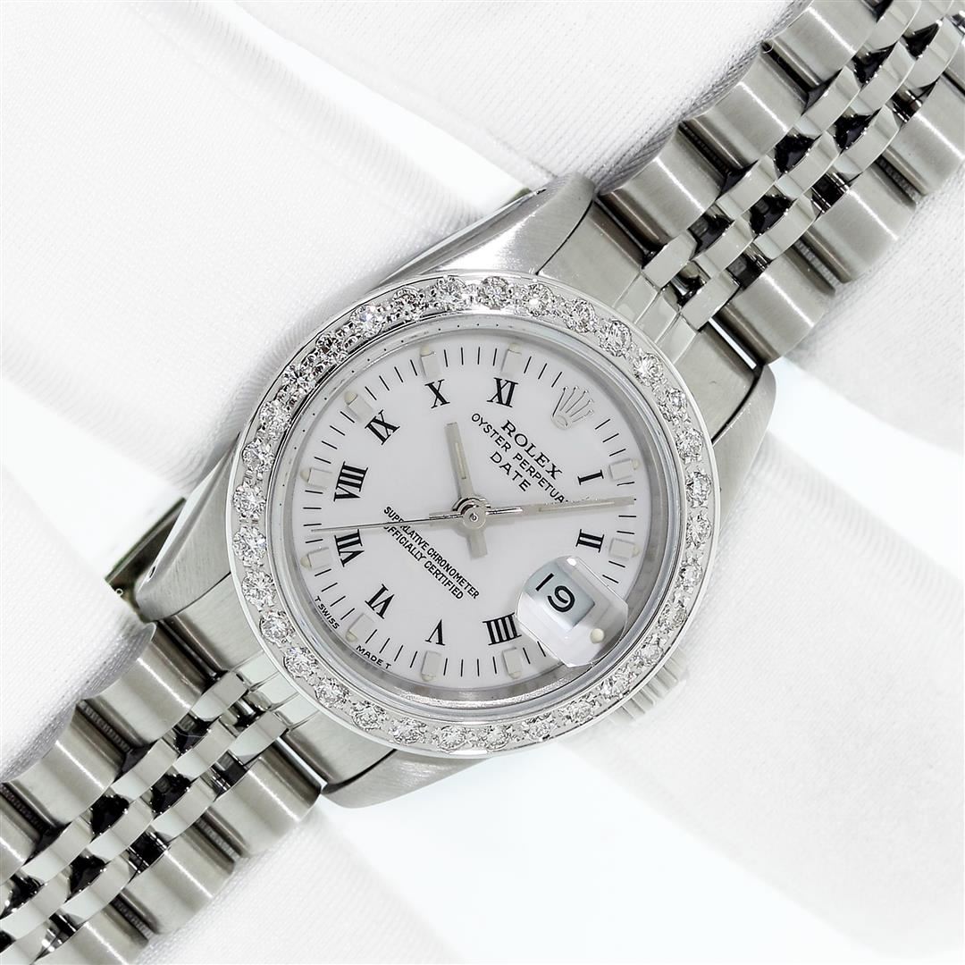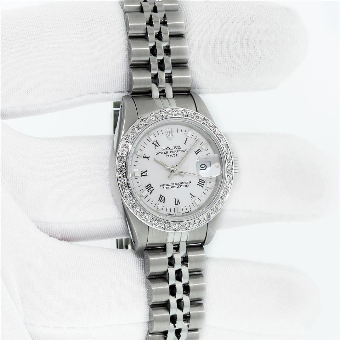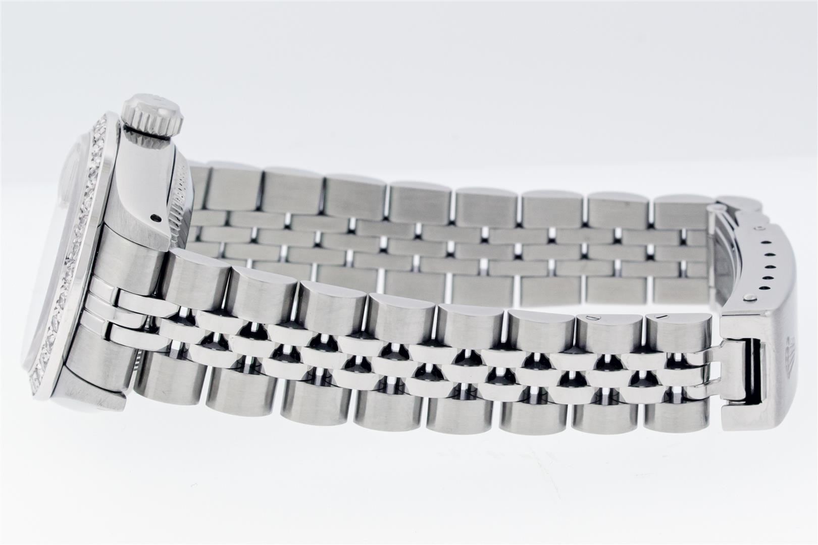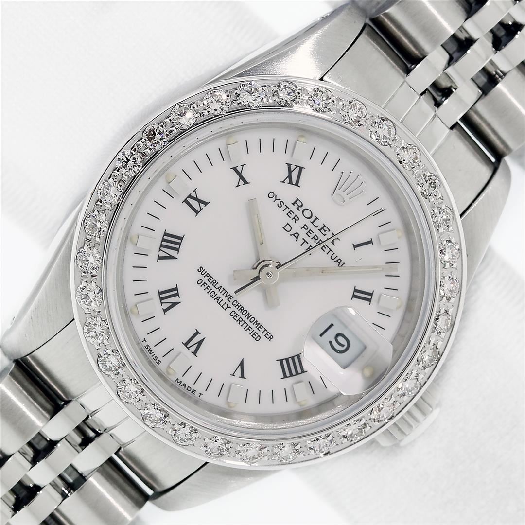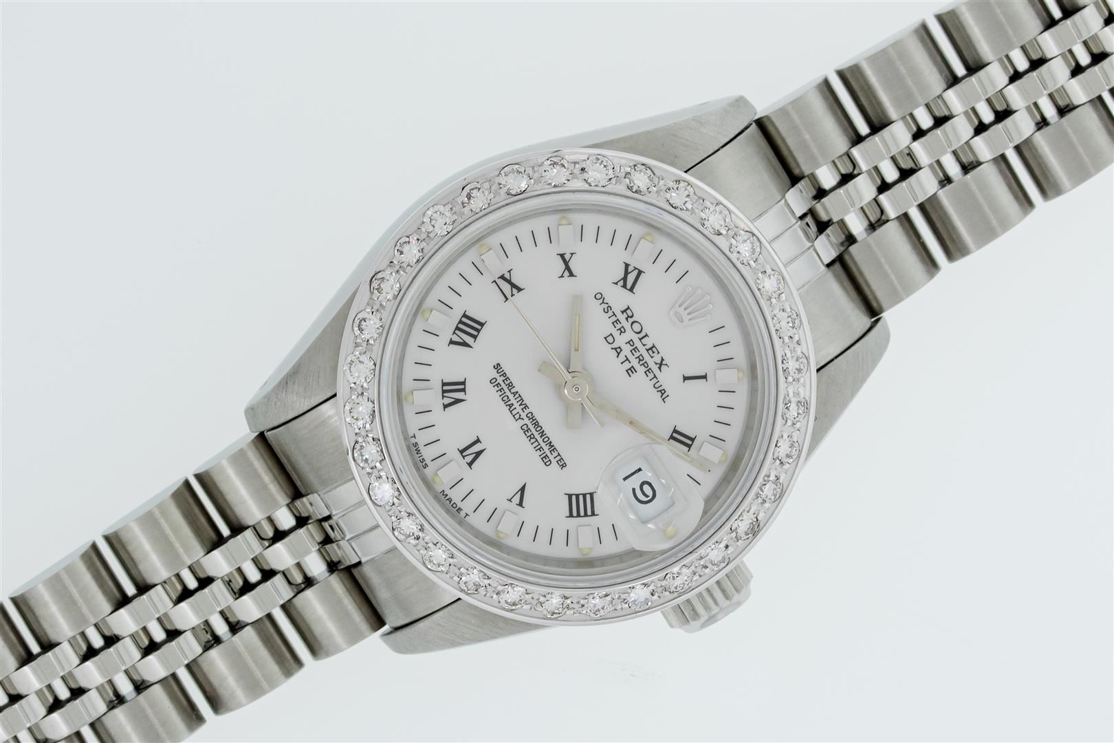 One Ladies Stainless Steel Rolex Datejust Polished Bright with Satin Finish, Serviced & Electronically Tested, Stainless Steel Case: 26mm, Stainless Steel Crown, Custom Bezel: New 18K White Gold Beadset Diamond Bezel, Diamond Count: 32 Diamonds, Total Weight .70 Carat, Clarity: SI-VS, Color: G to H. Custom Crystal: New Scratch Resistant Synthetic Sapphire Cyclops Lens. Custom Hands: New Luminescent Hands. Movement: Automatic Winding Movement. Dial: White Roman Dial With Index Hour Markers And Lumi Dots. Date Window: 3 O'Clock Position Date Display, Model: Datejust. Condition: G-6 Extra Fine. Bracelet: Stainless Steel Jubilee Band. Bright Polish & Satin Finish. 6.0 Inch Length, Adjustable. Standard Clasp, With Rolex Logo. This Watch Has Been Serviced Time Tested And Is In Excellent Condition It Is Free Of All Scratches And Dents. This Watch Comes With A Rolex Box.