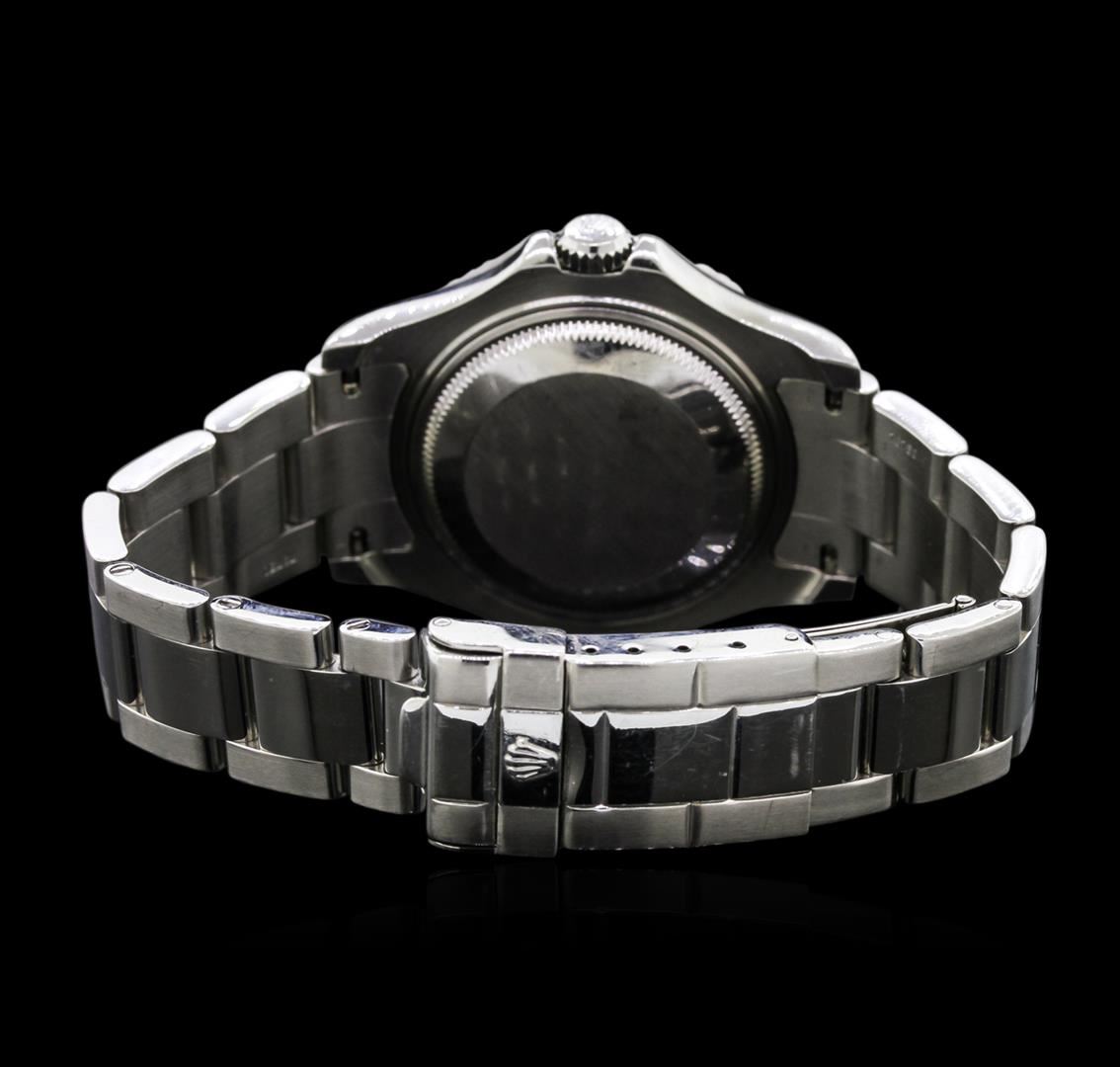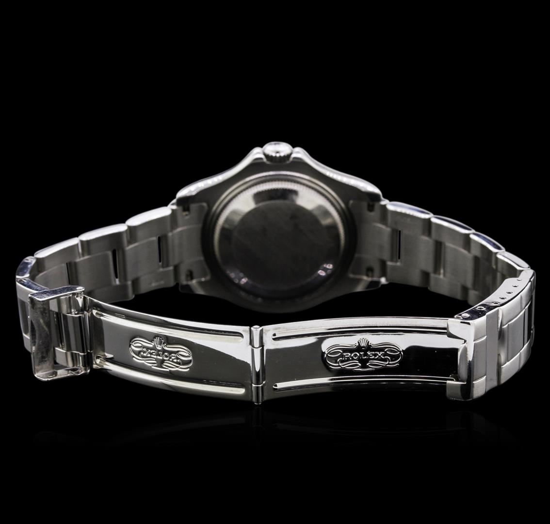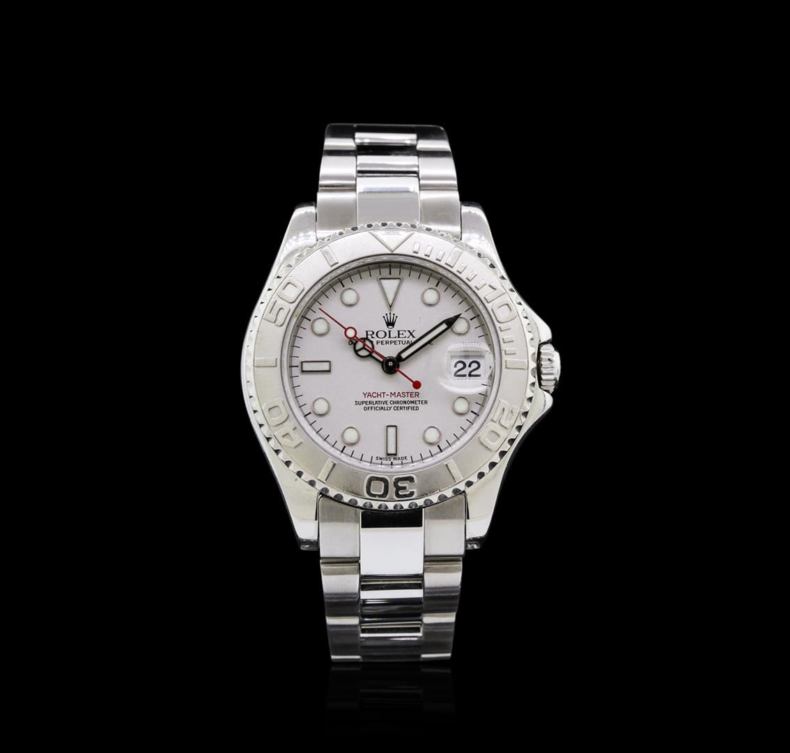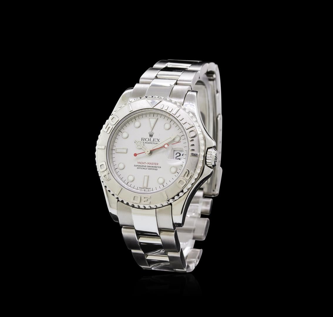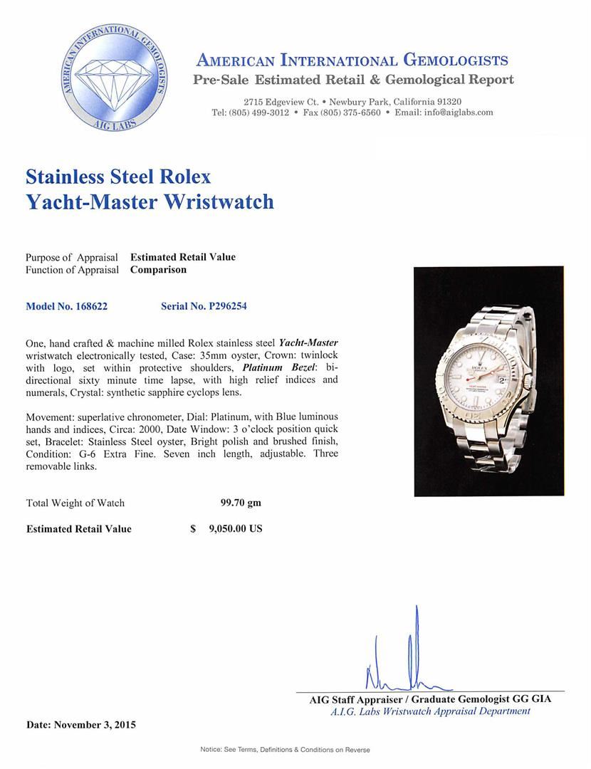 One, hand crafted & machine milled Rolex stainless steel Yacht-Master wristwatch electronically tested, Case: 35mm oyster, Crown: twinlock with logo, set within protective shoulders, Platinum Bezel: bi-directional sixty minute time lapse, with high relief indices and numerals, Crystal: synthetic sapphire cyclops lens. Movement: superlative chronometer, Dial: Platinum, with Blue luminous hands and indices, Circa: 2000, Date Window: 3 o'clock position quick set, Bracelet: Stainless Steel oyster, Bright polish and brushed finish, Condition: G-6 Extra Fine. Seven inch length, adjustable. Three removable links. Total Weight of Watch 99.70 grams. AIG Appraised at $9,050.00.