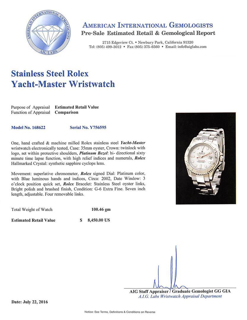 One, hand crafted & machine milled Rolex stainless steel Yacht-Master wristwatch electronically tested, Case: 35mm oyster, Crown: twinlock with logo, set within protective shoulders, Platinum Bezel: bi- directional sixty minute time lapse function, with high relief indices and numerals, Rolex Hallmarked Crystal: synthetic sapphire cyclops lens. Movement: superlative chronometer, Rolex signed Dial: Platinum color, with Blue luminous hands and indices, Circa: 2002, Date Window: 3 o'clock position quick set, Rolex Bracelet: Stainless Steel oyster links, Bright polish and brushed finish, Condition: G-6 Extra Fine. Seven inch length, adjustable. Four removable links. Total Weight of Watch 100.46gm. AIG Appraised at $8,450.00.